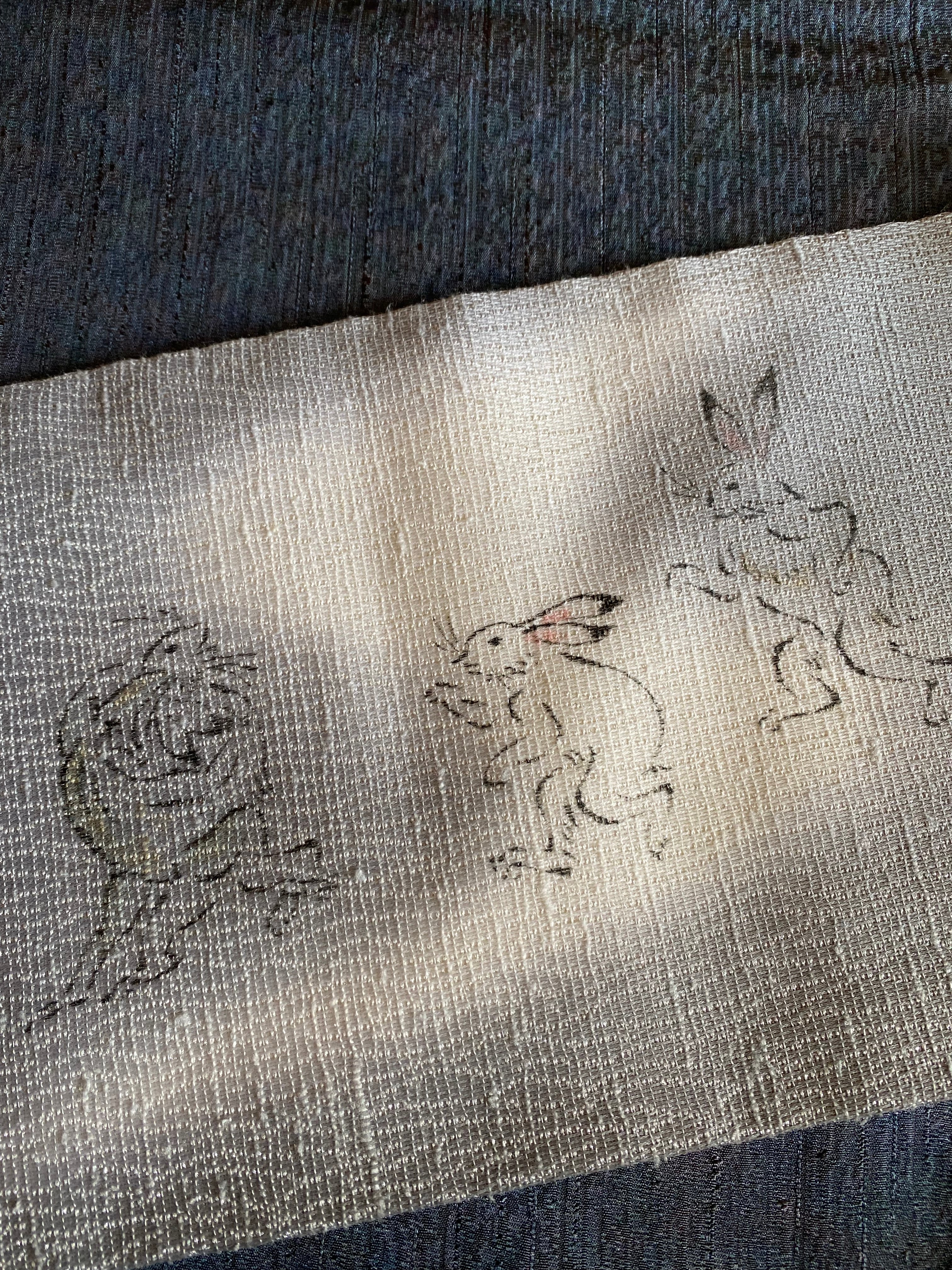 鳥獣戯画 名古屋帯 銀グレー 狐もいます。
