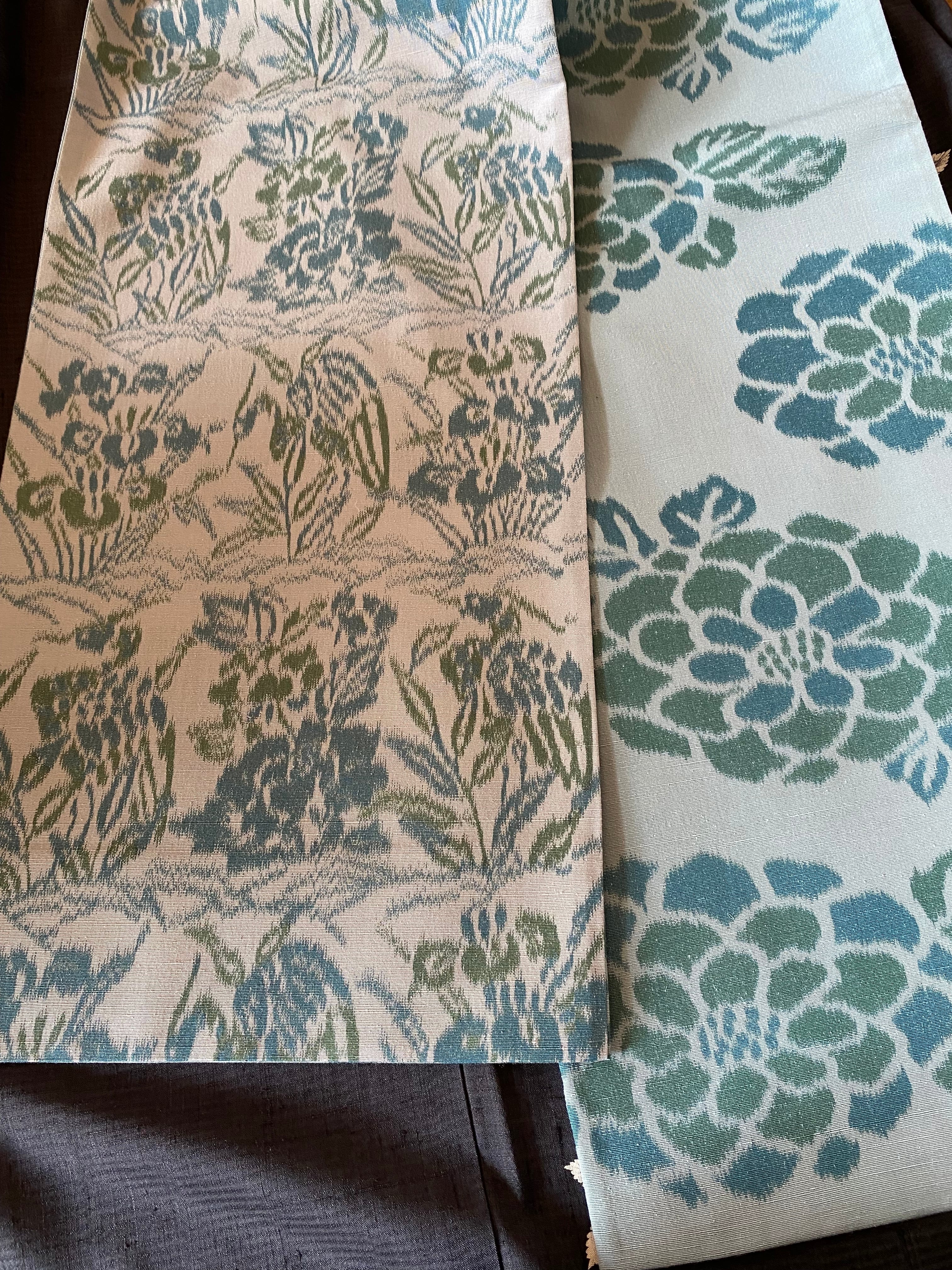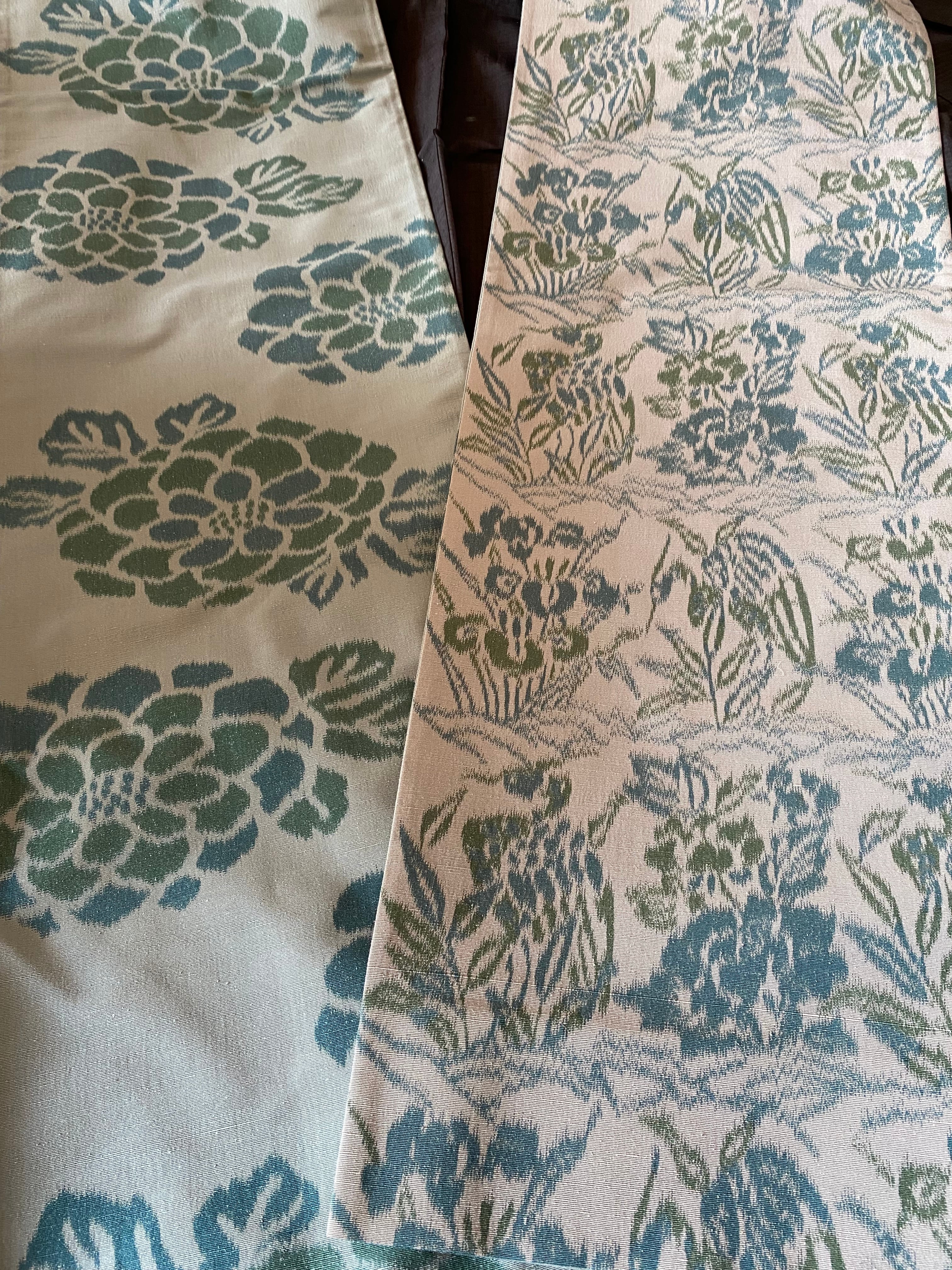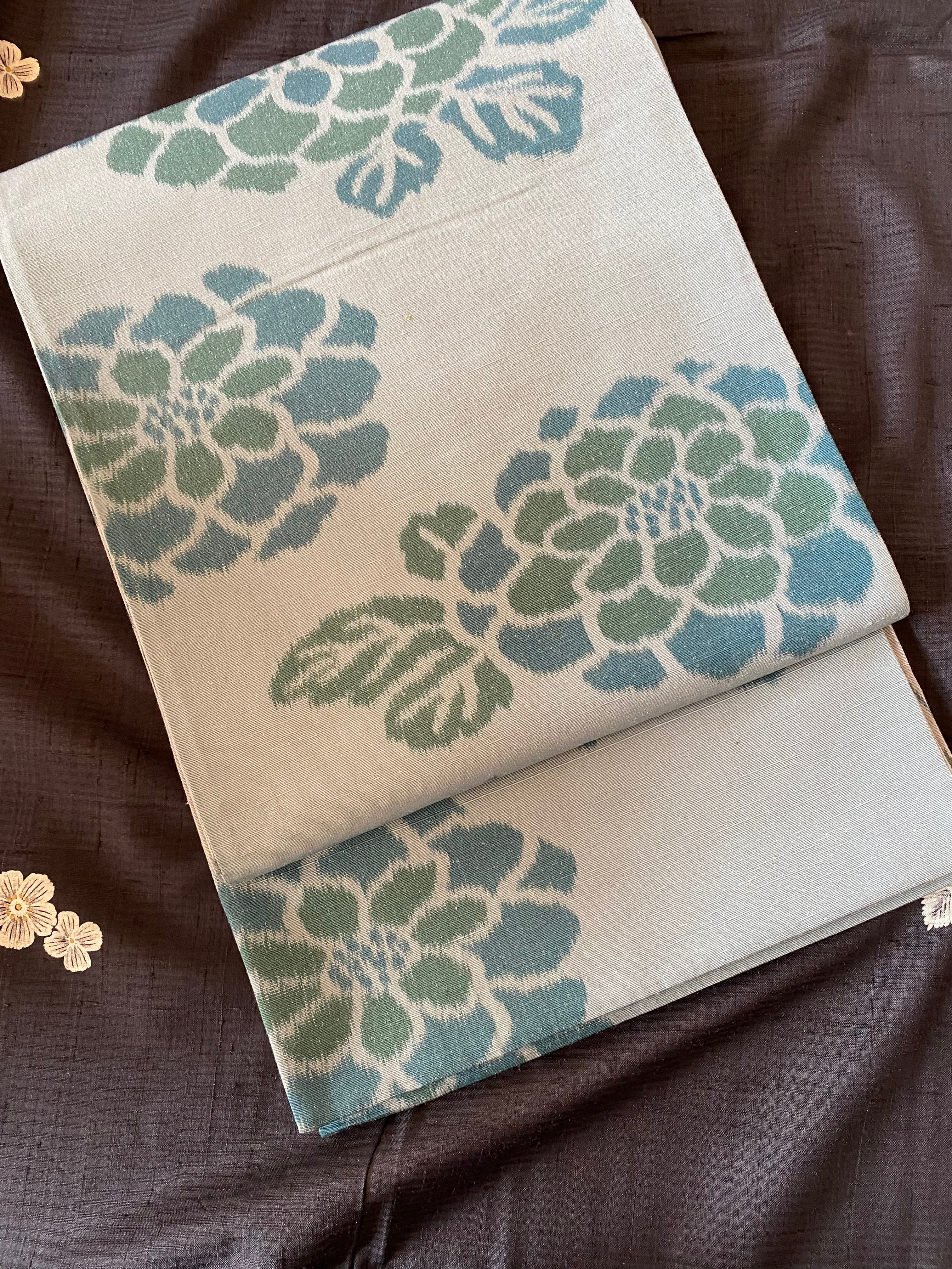 とても雰囲気ある水色の紬の織り柄花々帯。