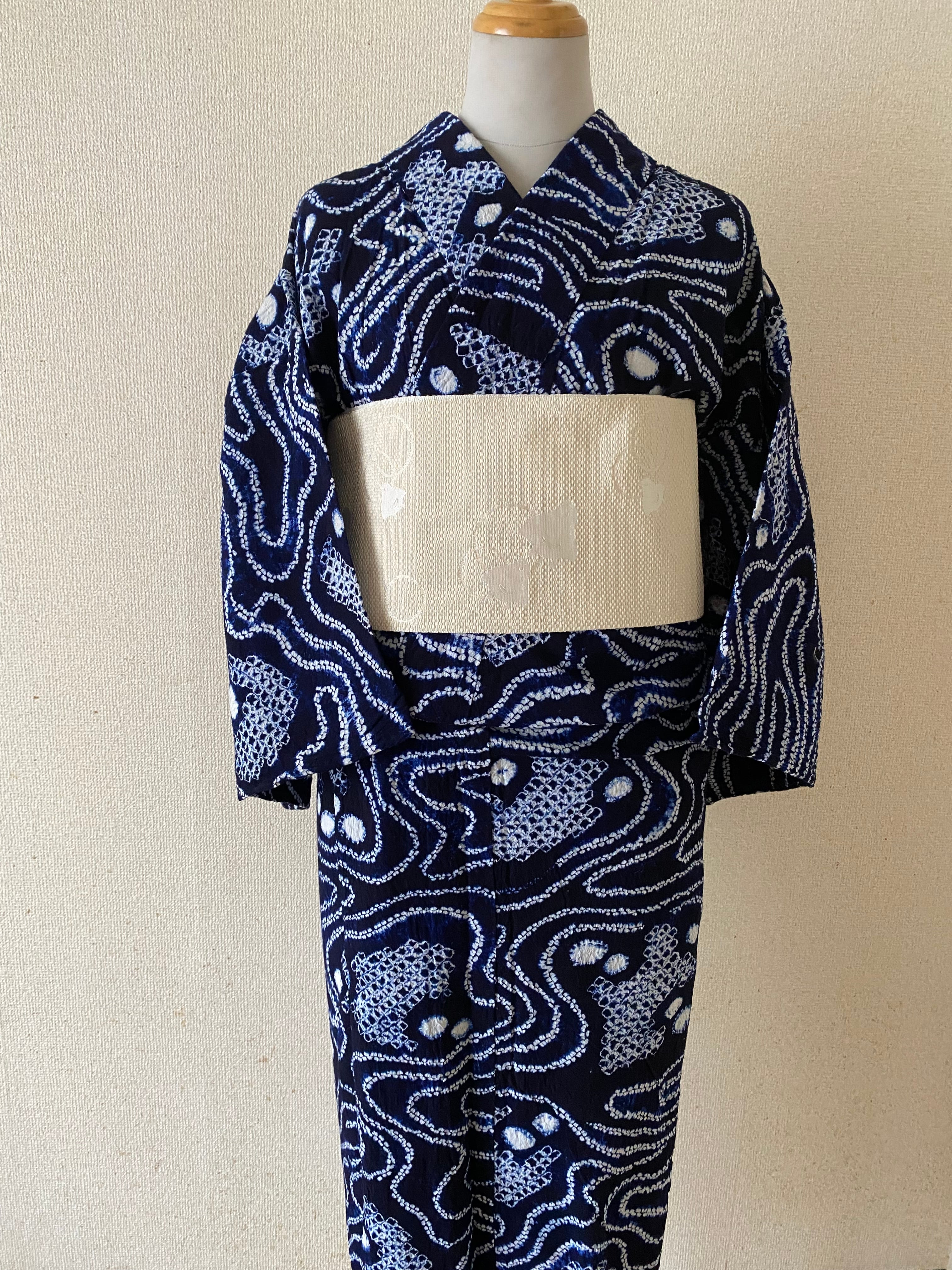 有松絞り 浴衣 藍色白 水流うずまき水玉 紋様