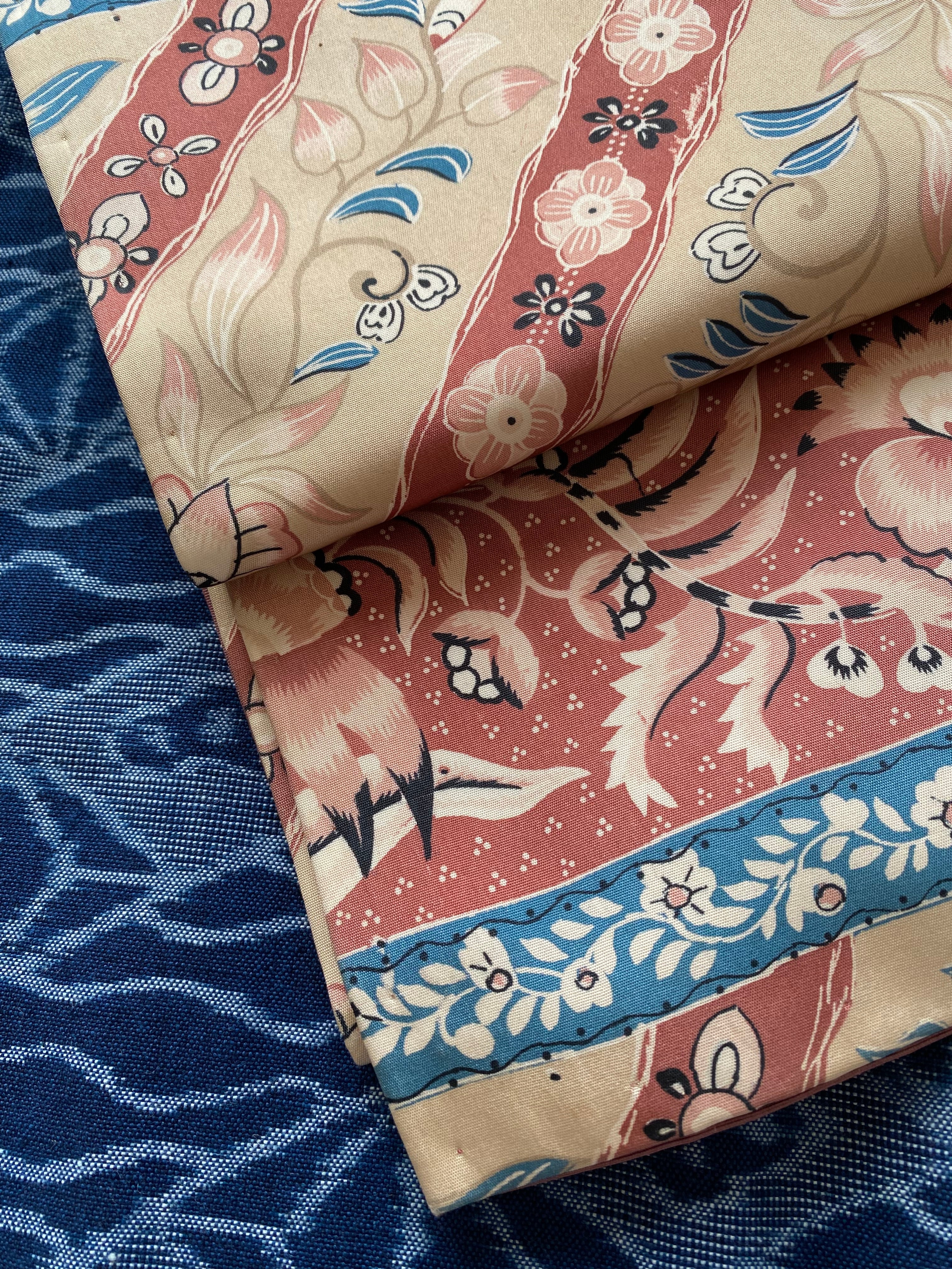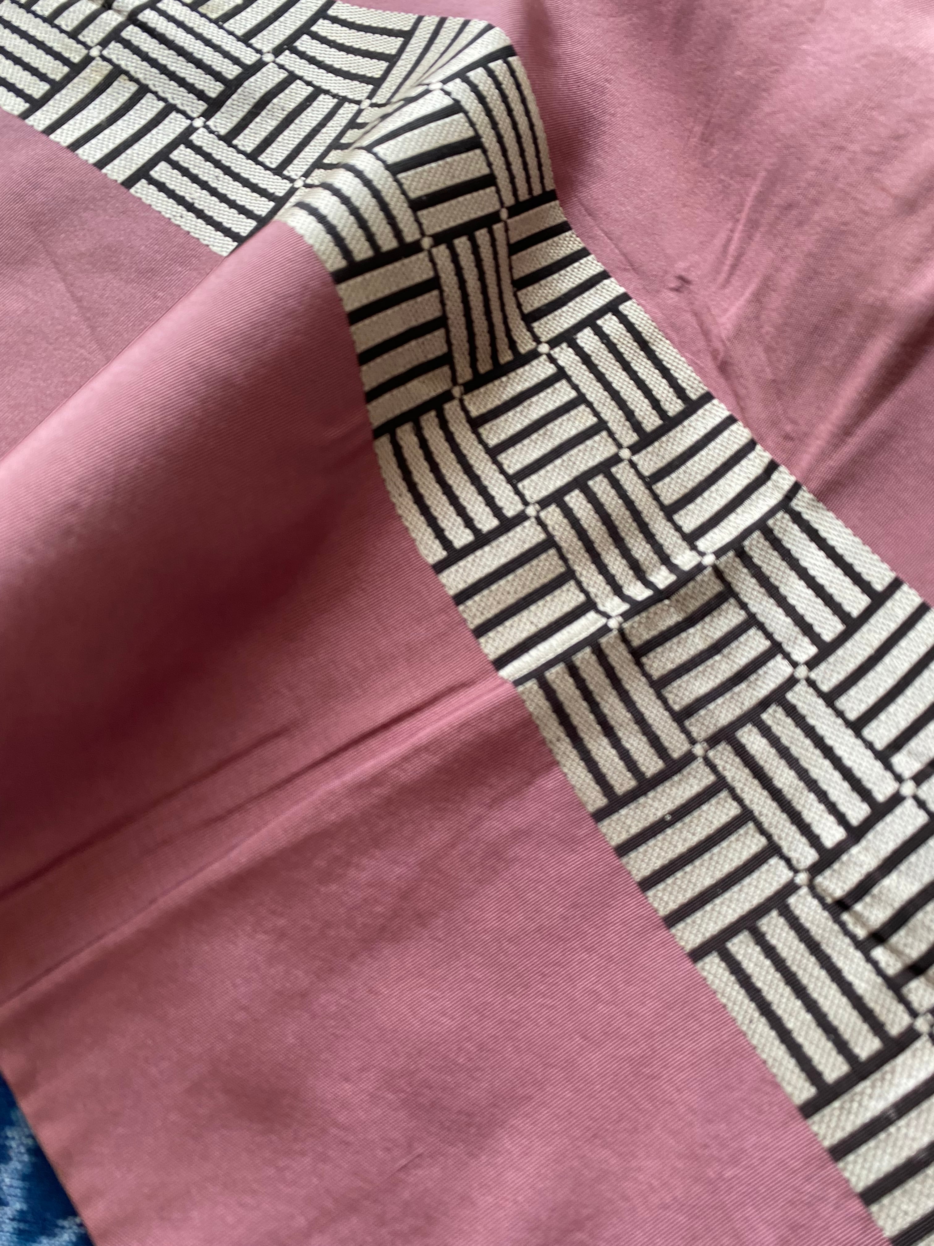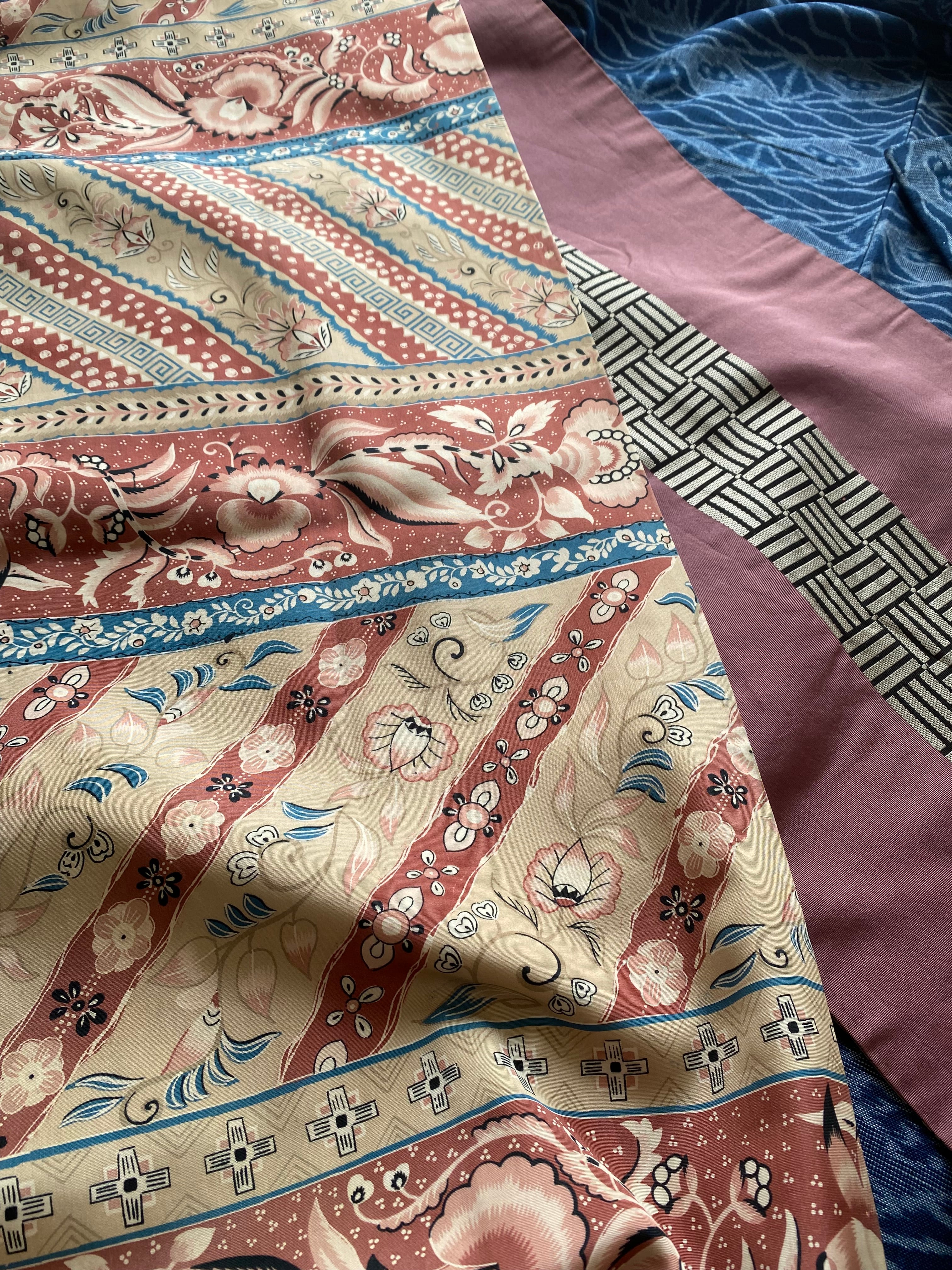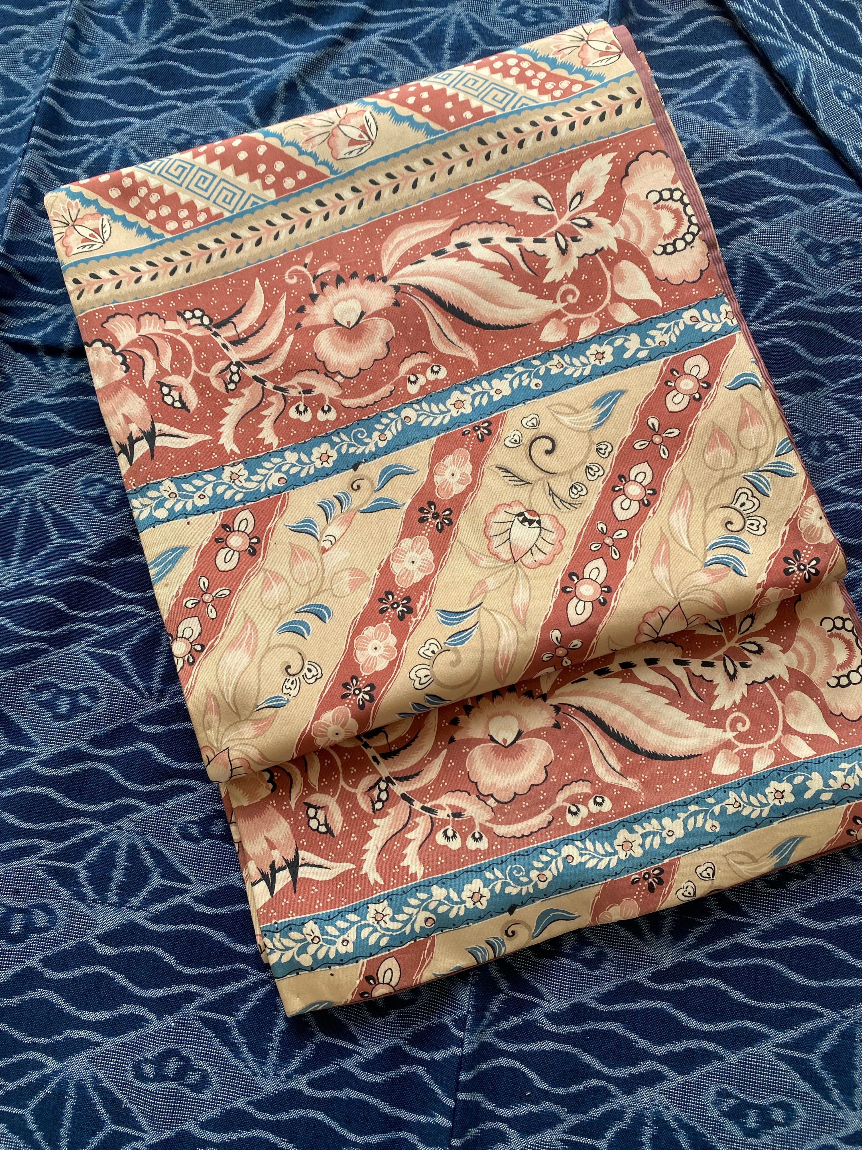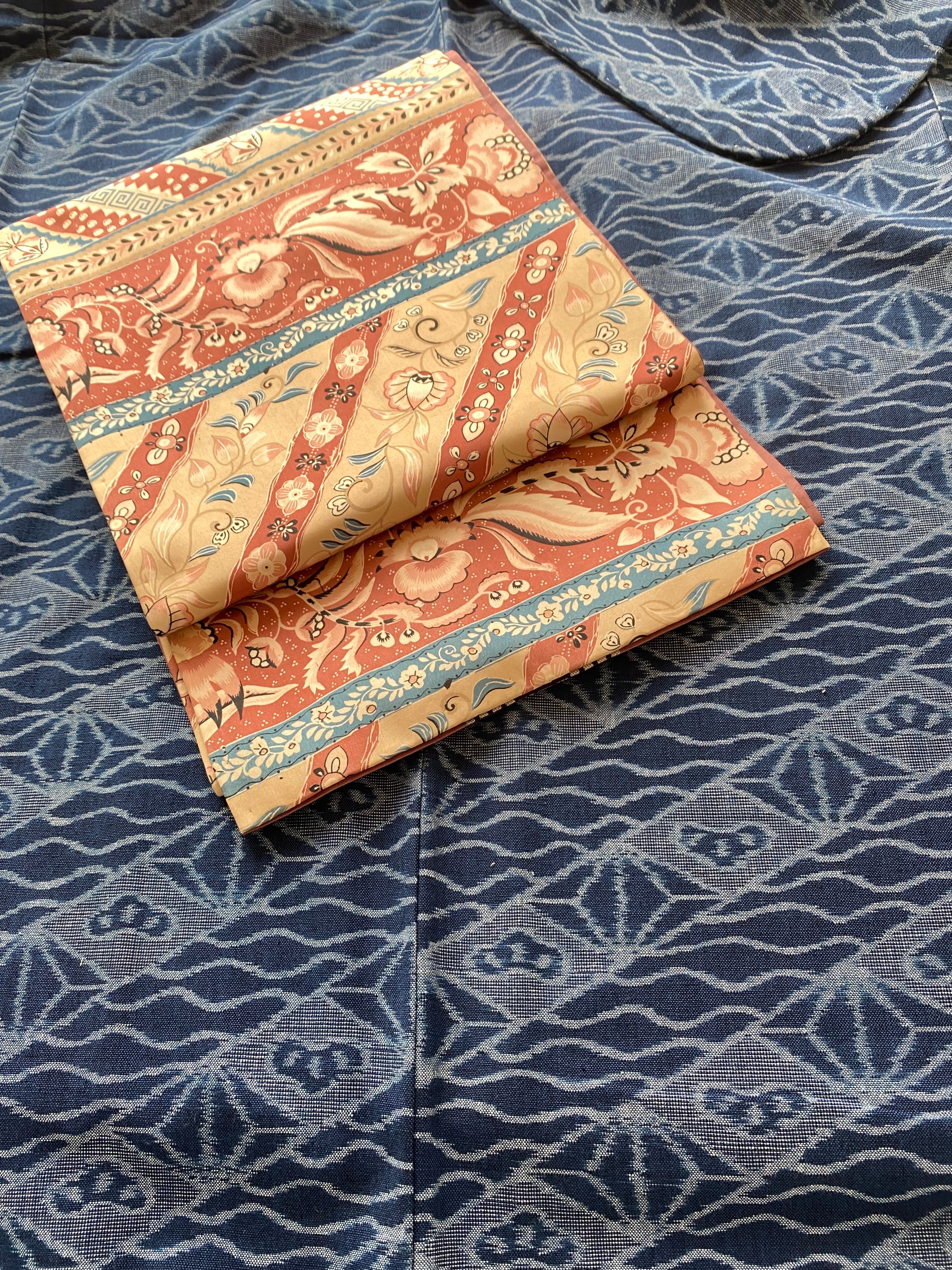 アンティーク 染め 更紗紋様 昼夜帯 名古屋帯 ピンク水色系