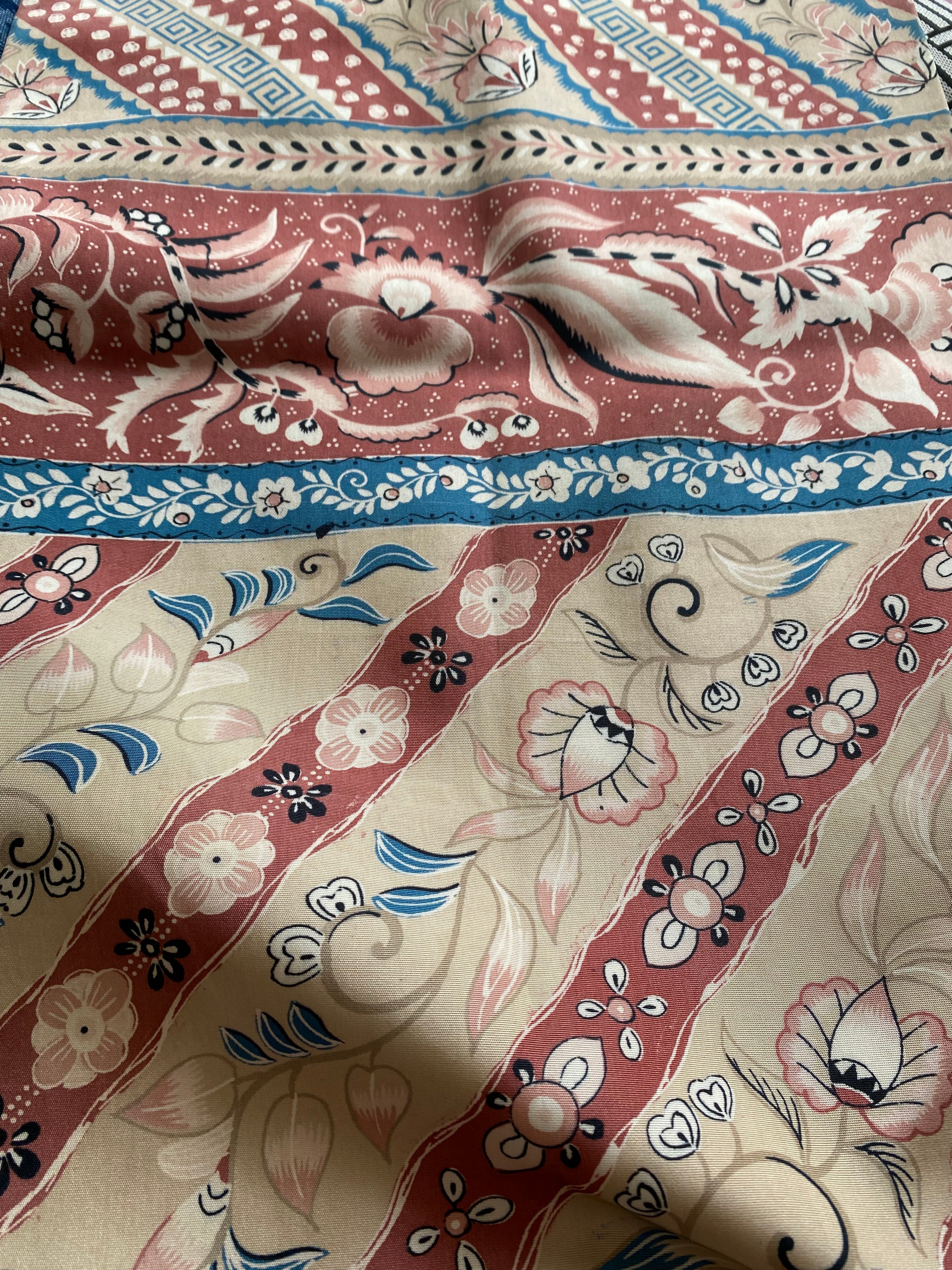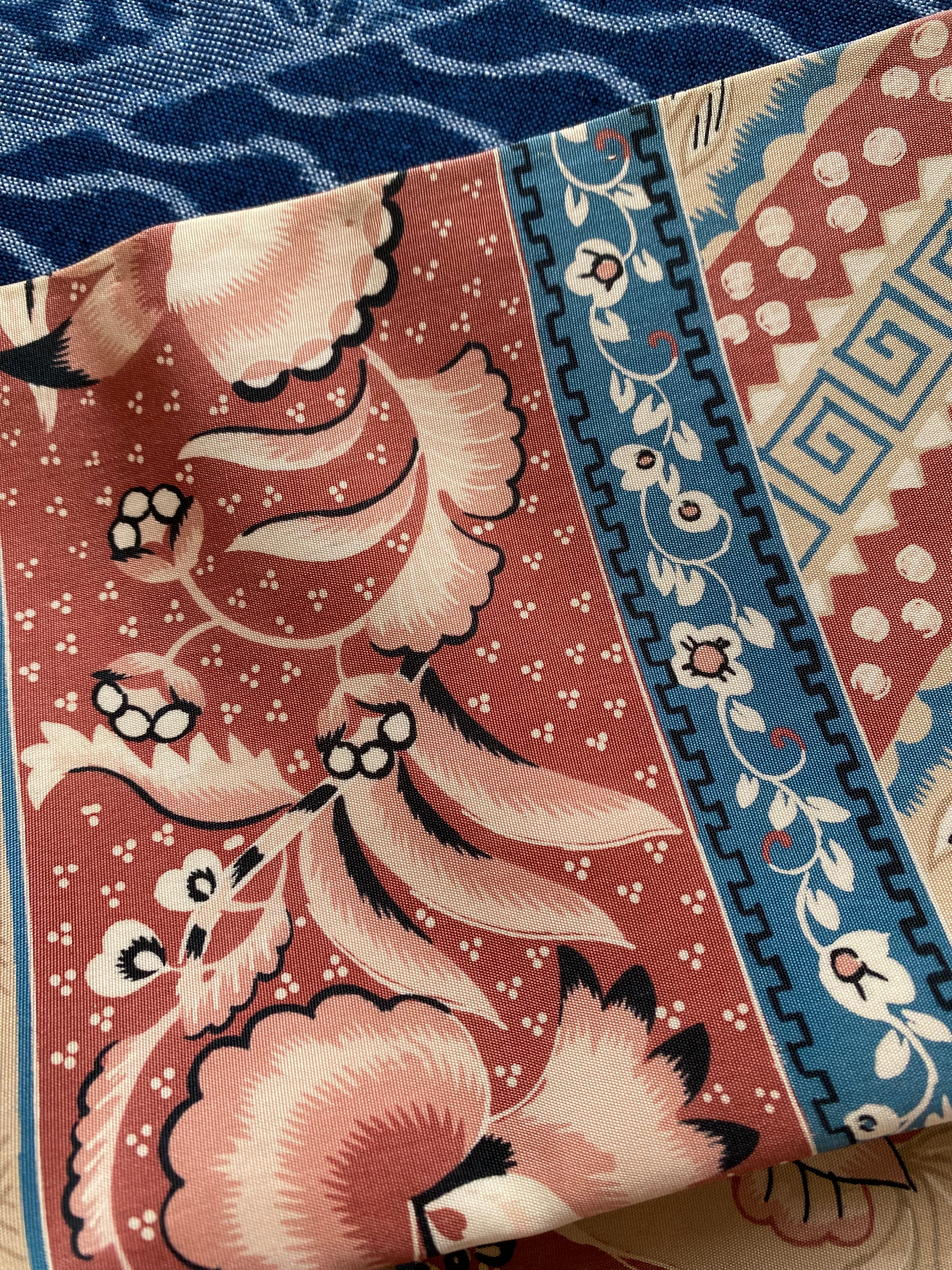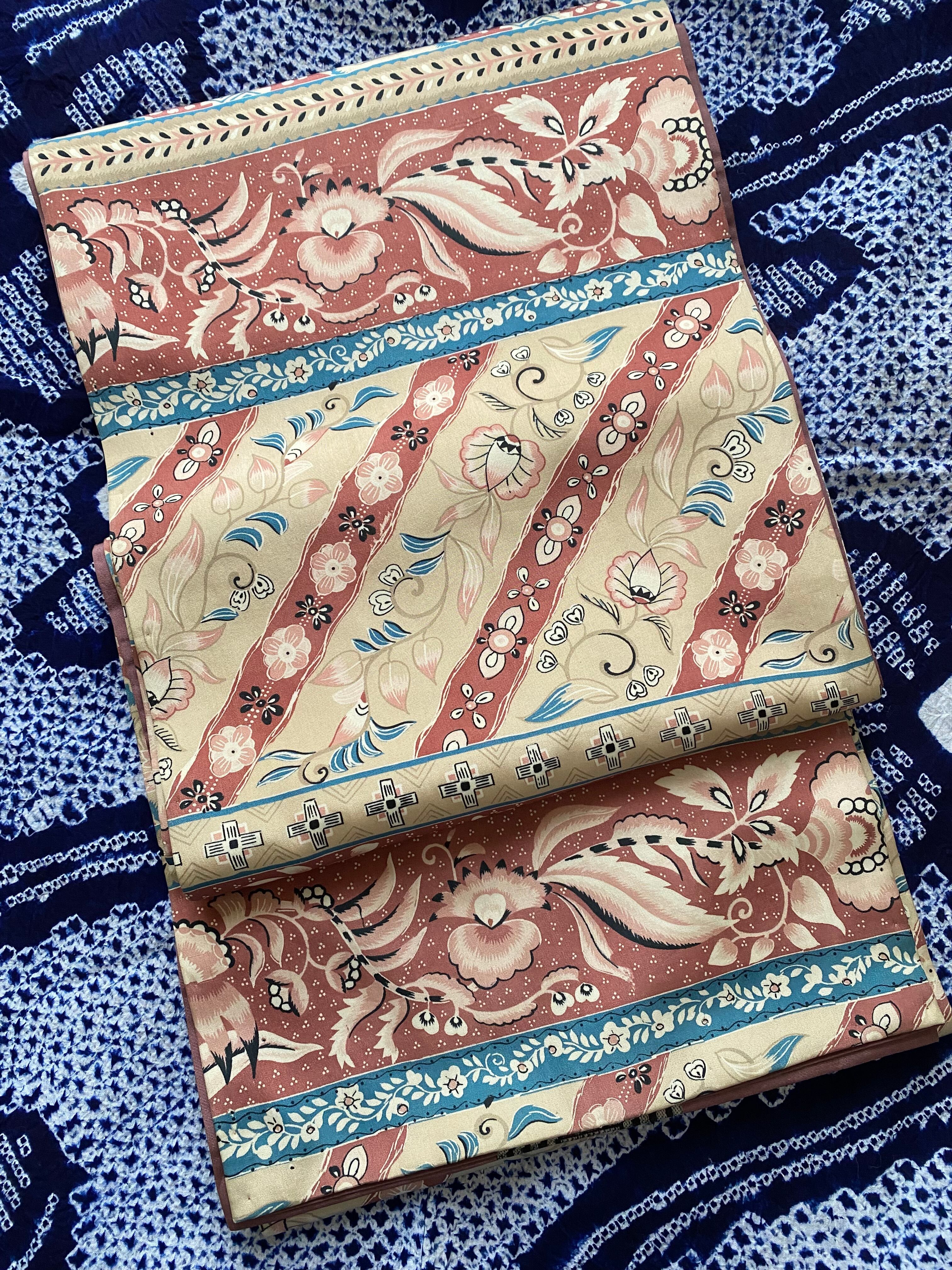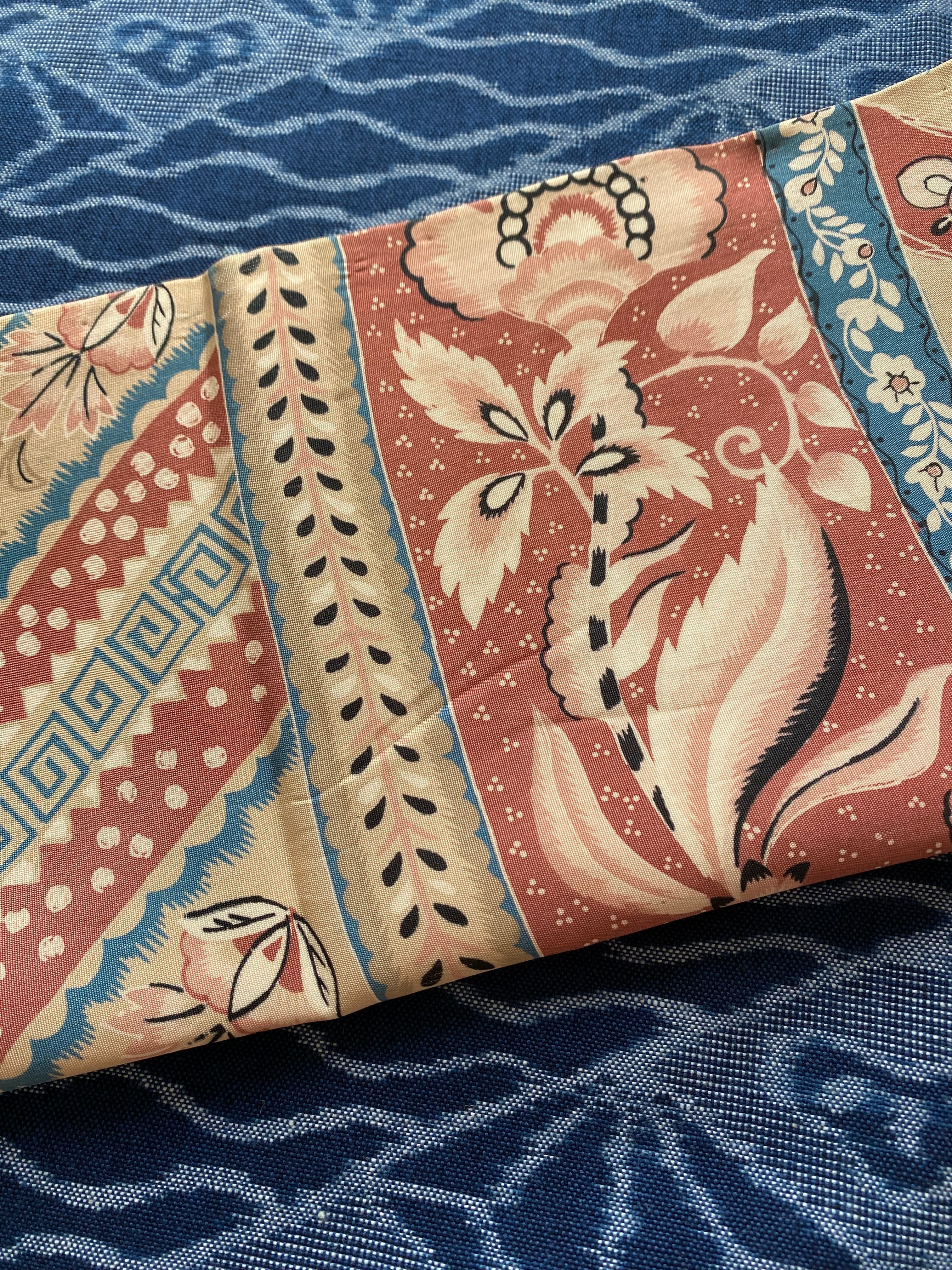 アンティーク 染め 更紗紋様 昼夜帯 名古屋帯 ピンク水色系