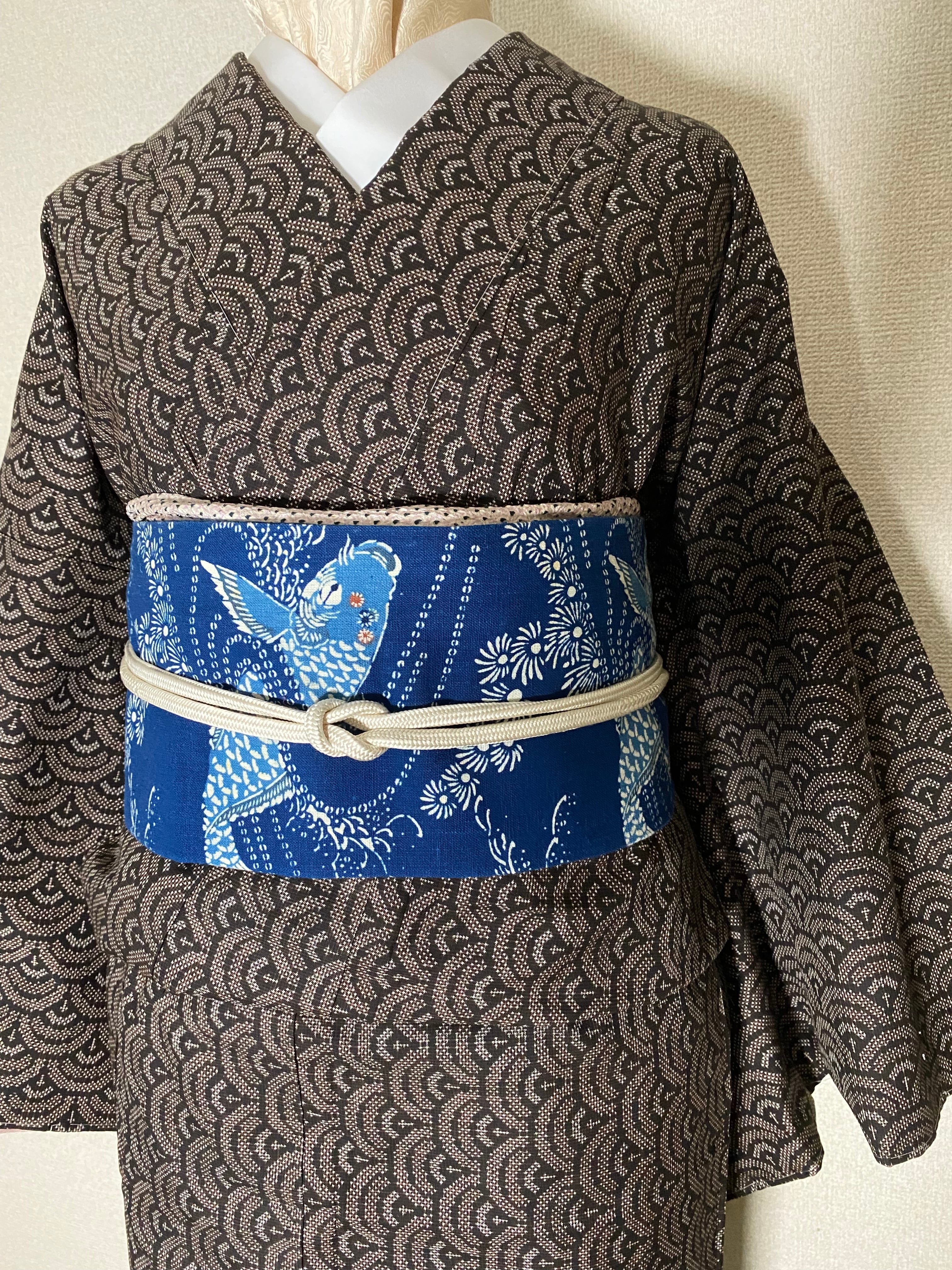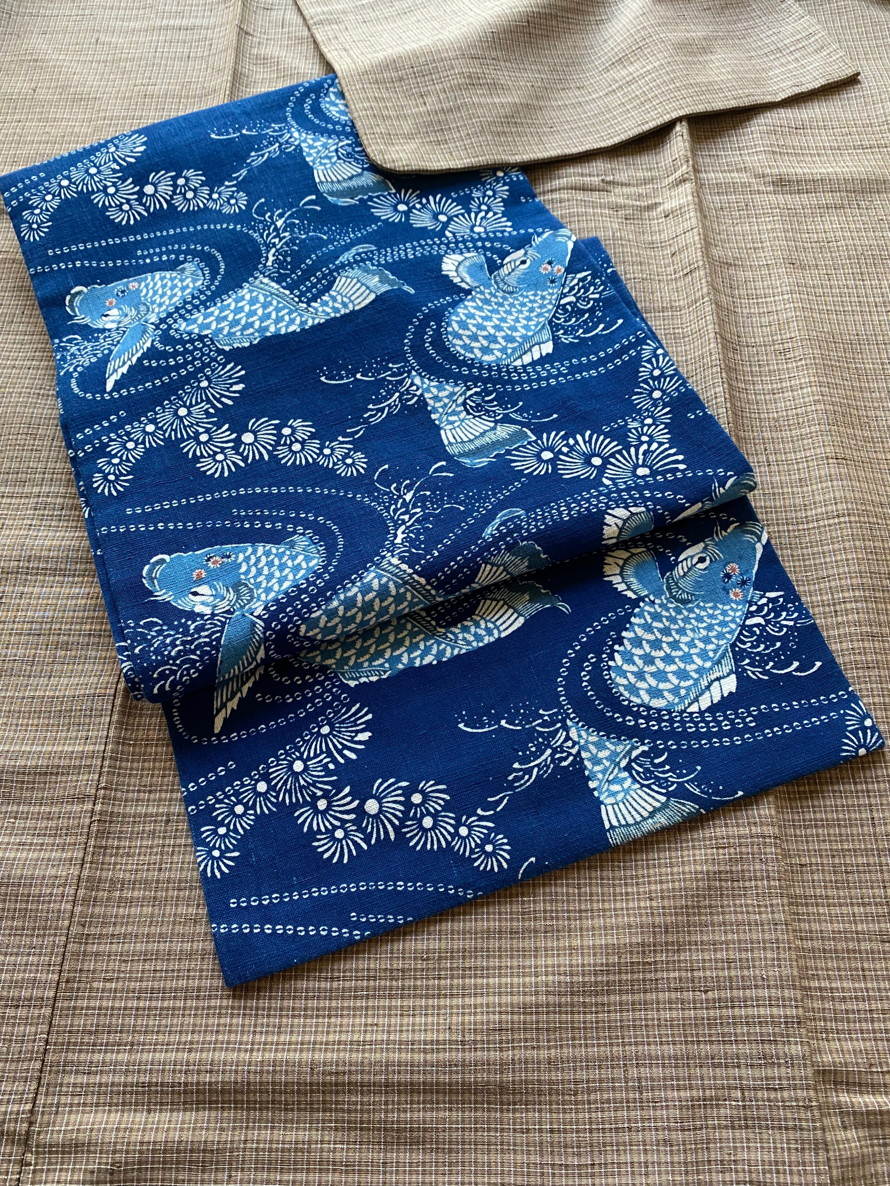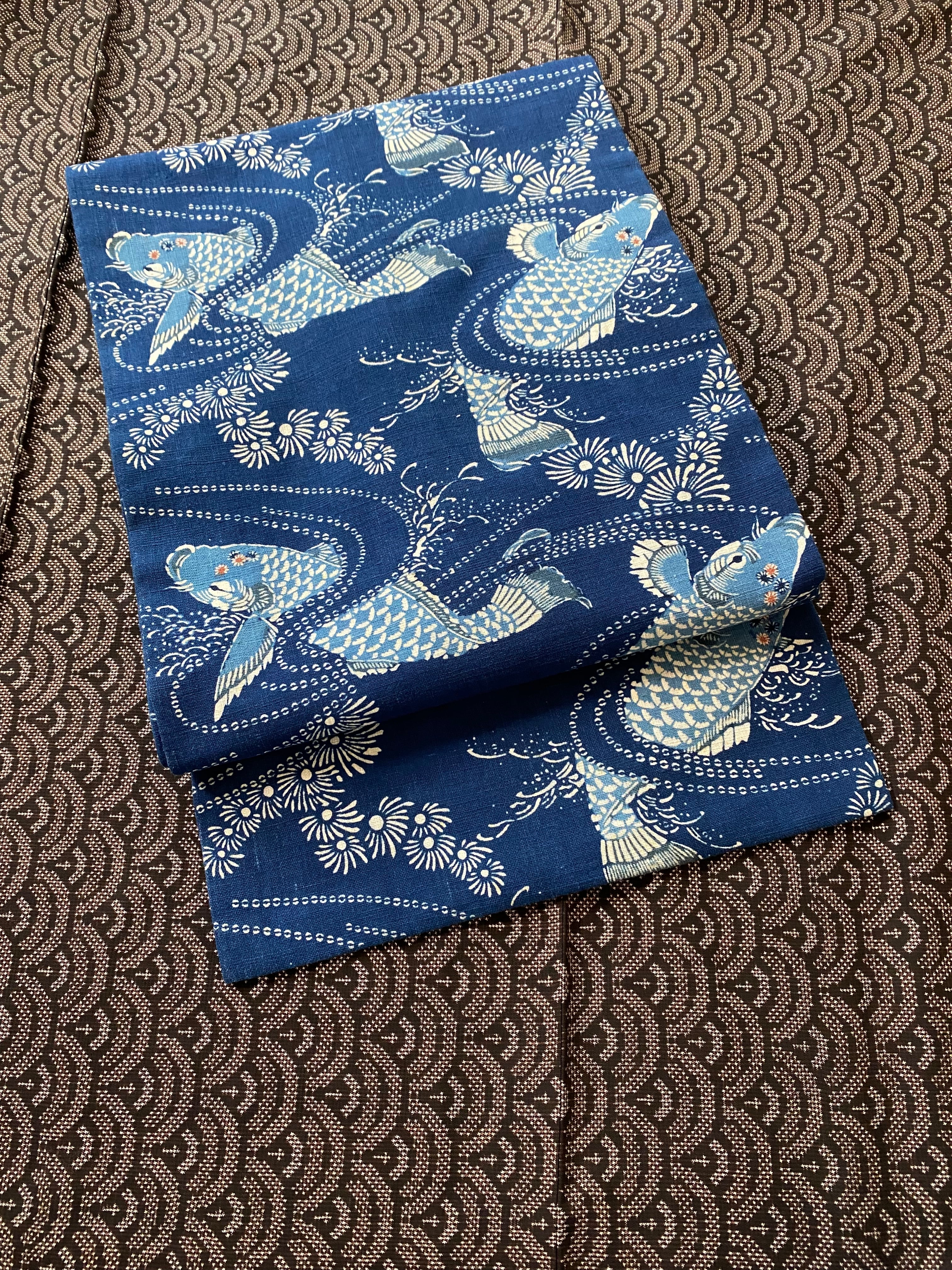 紺定 正藍型染め 田中昭夫 作品 鯉 名古屋帯