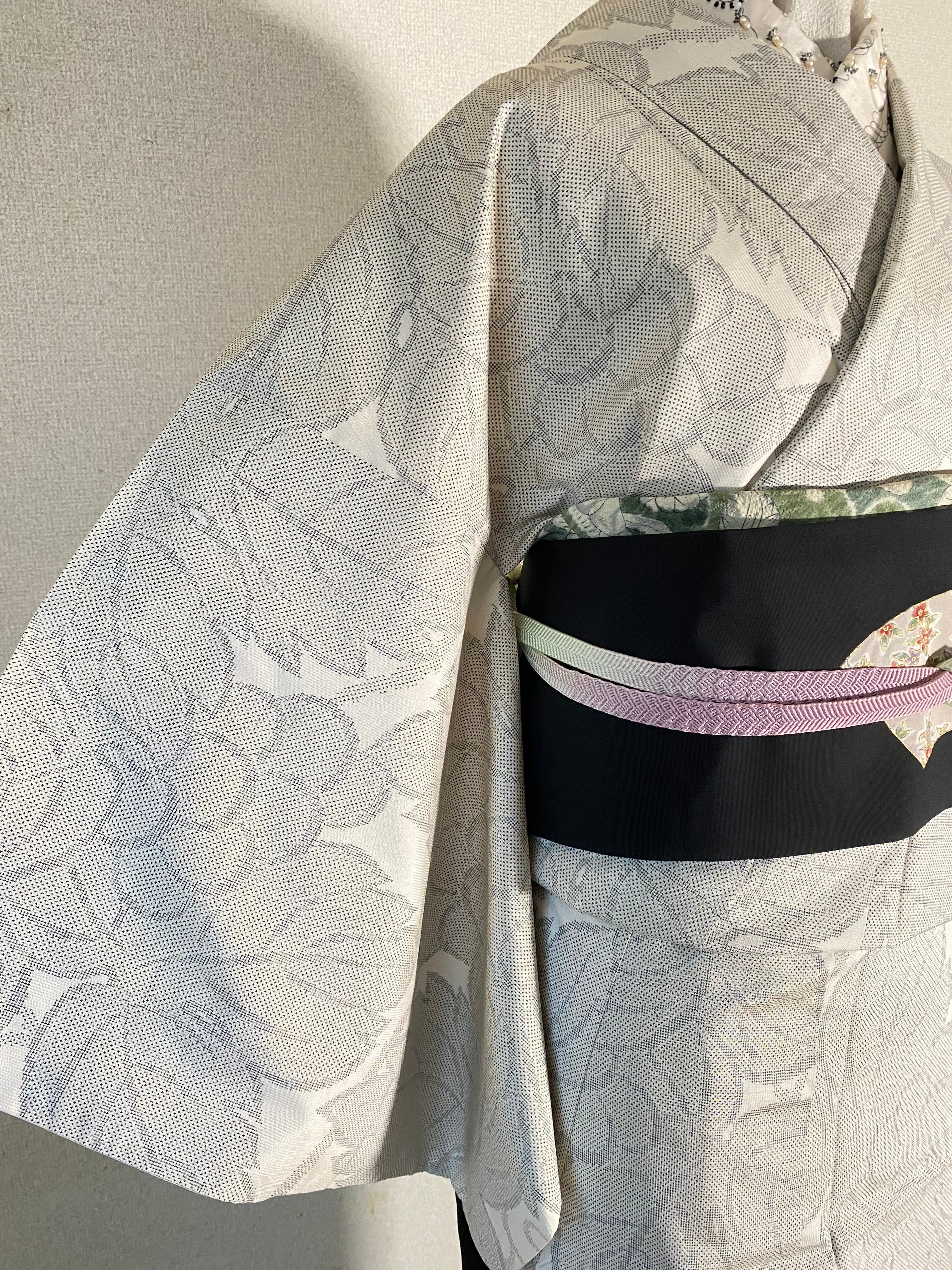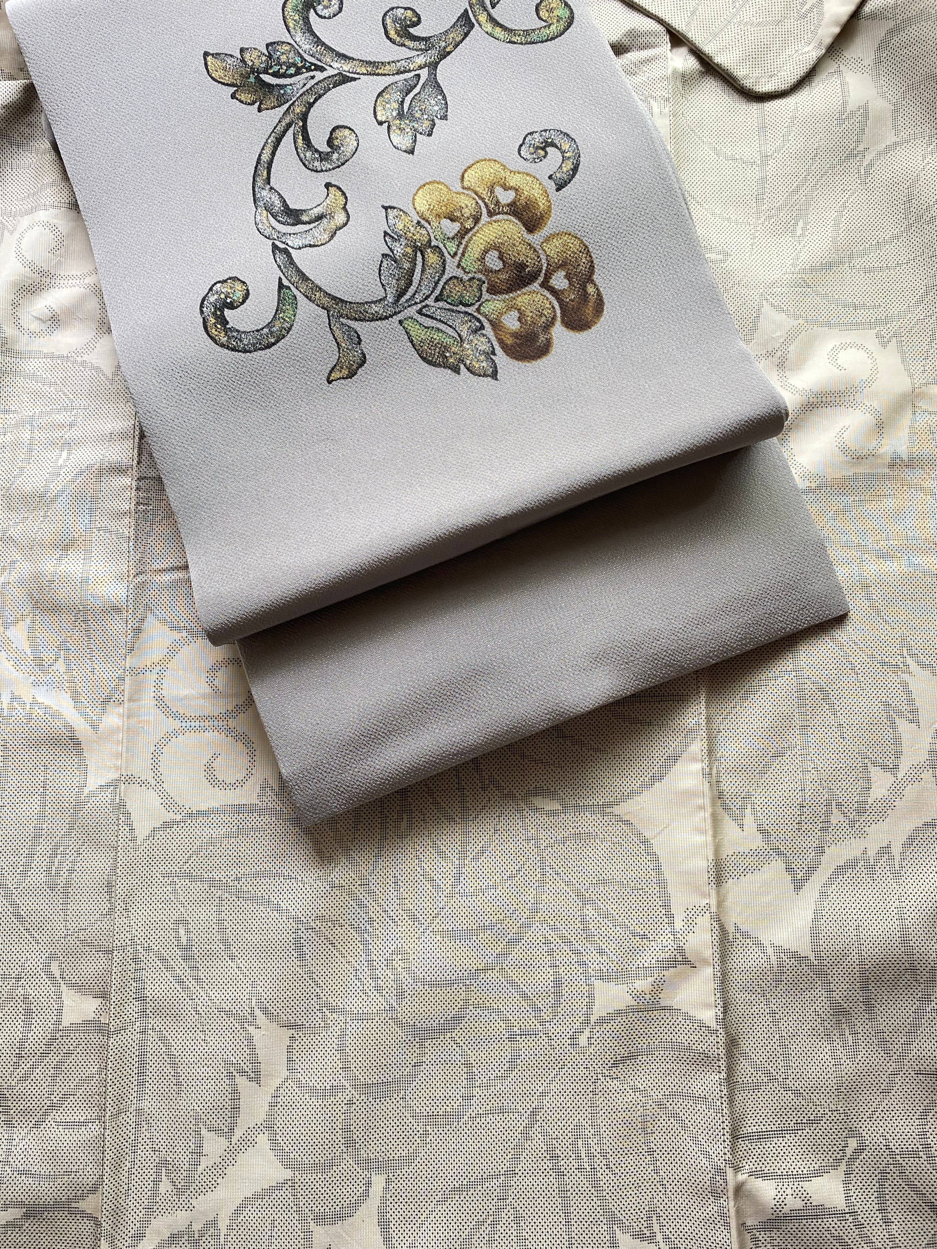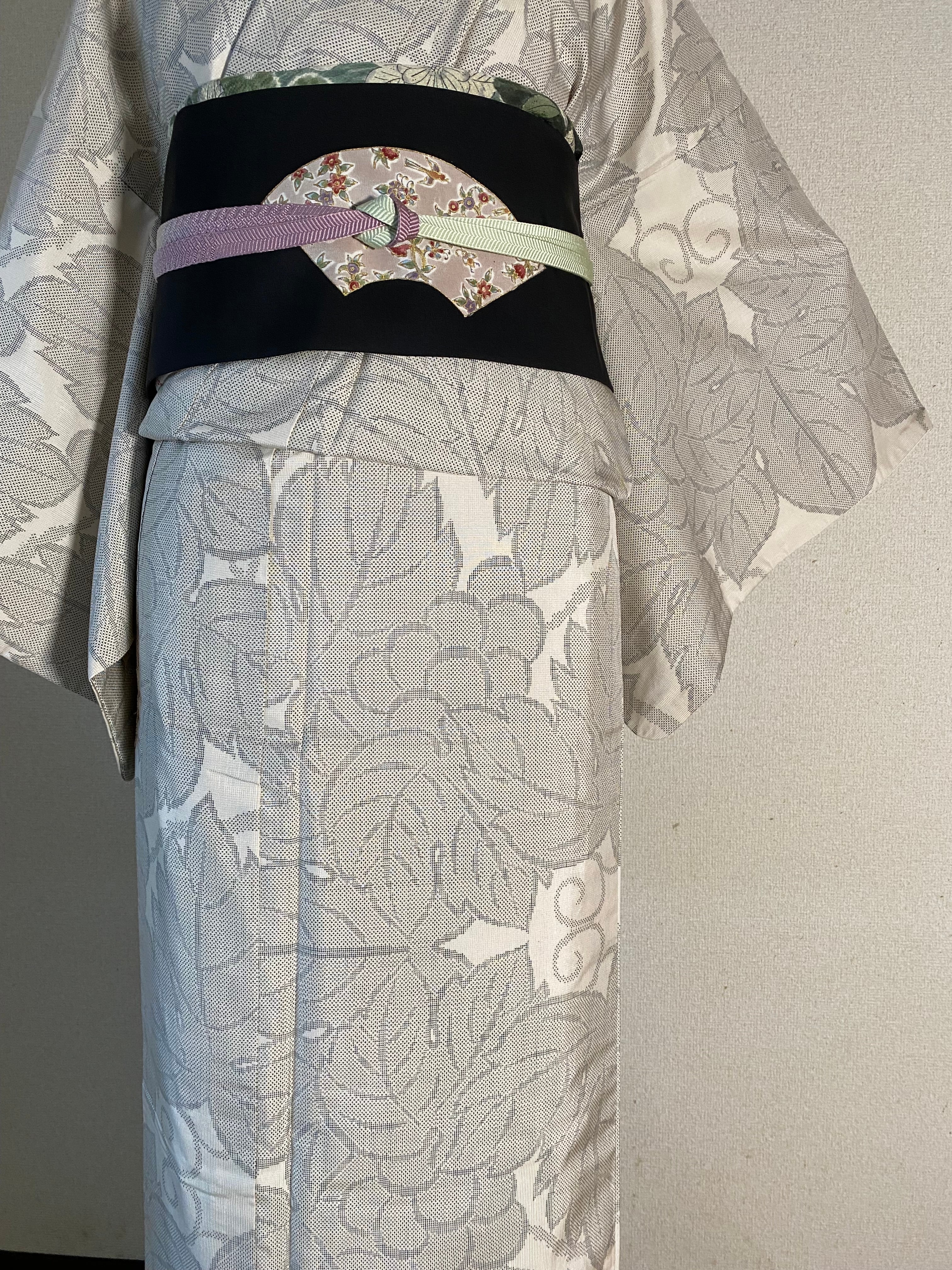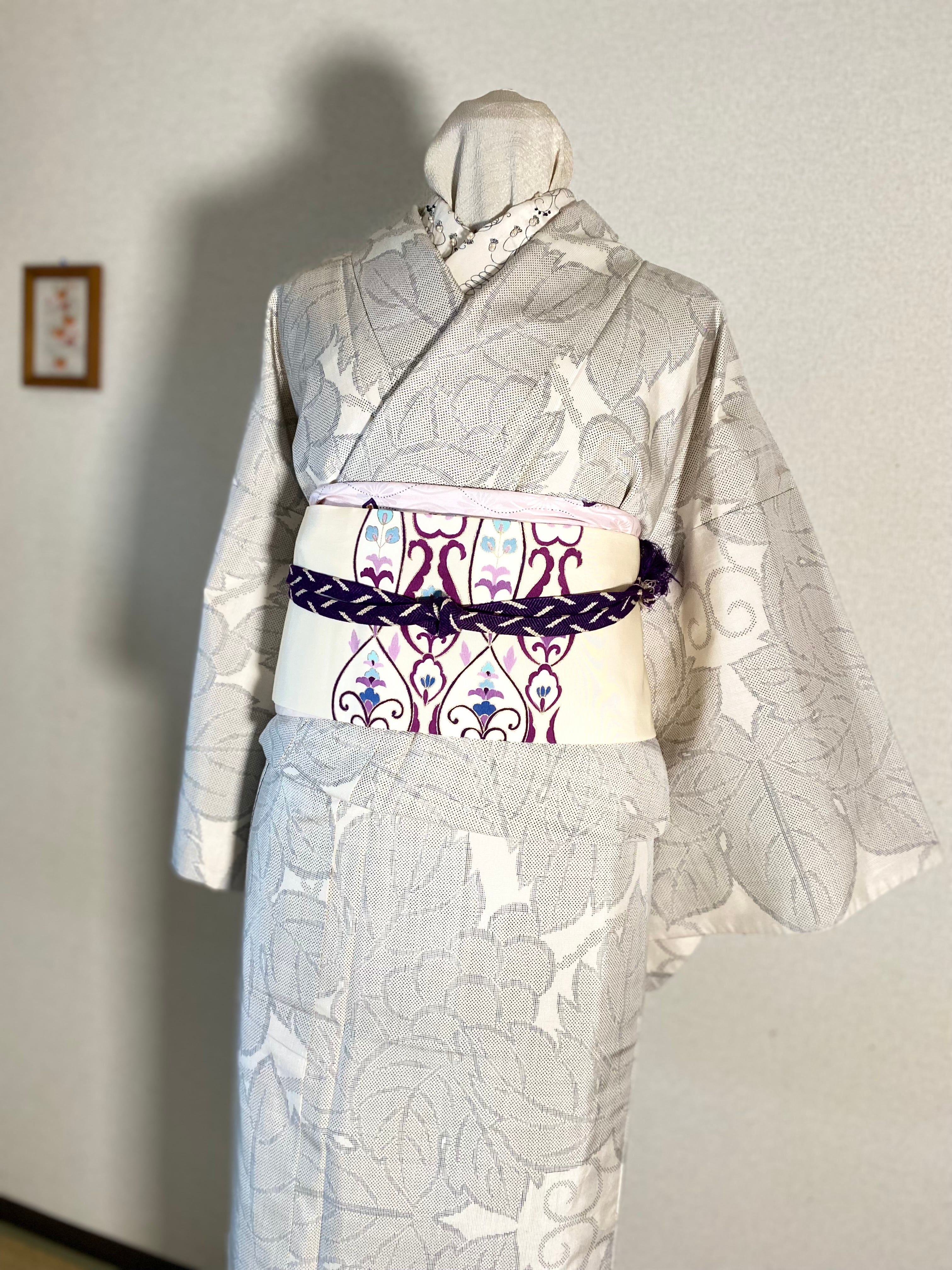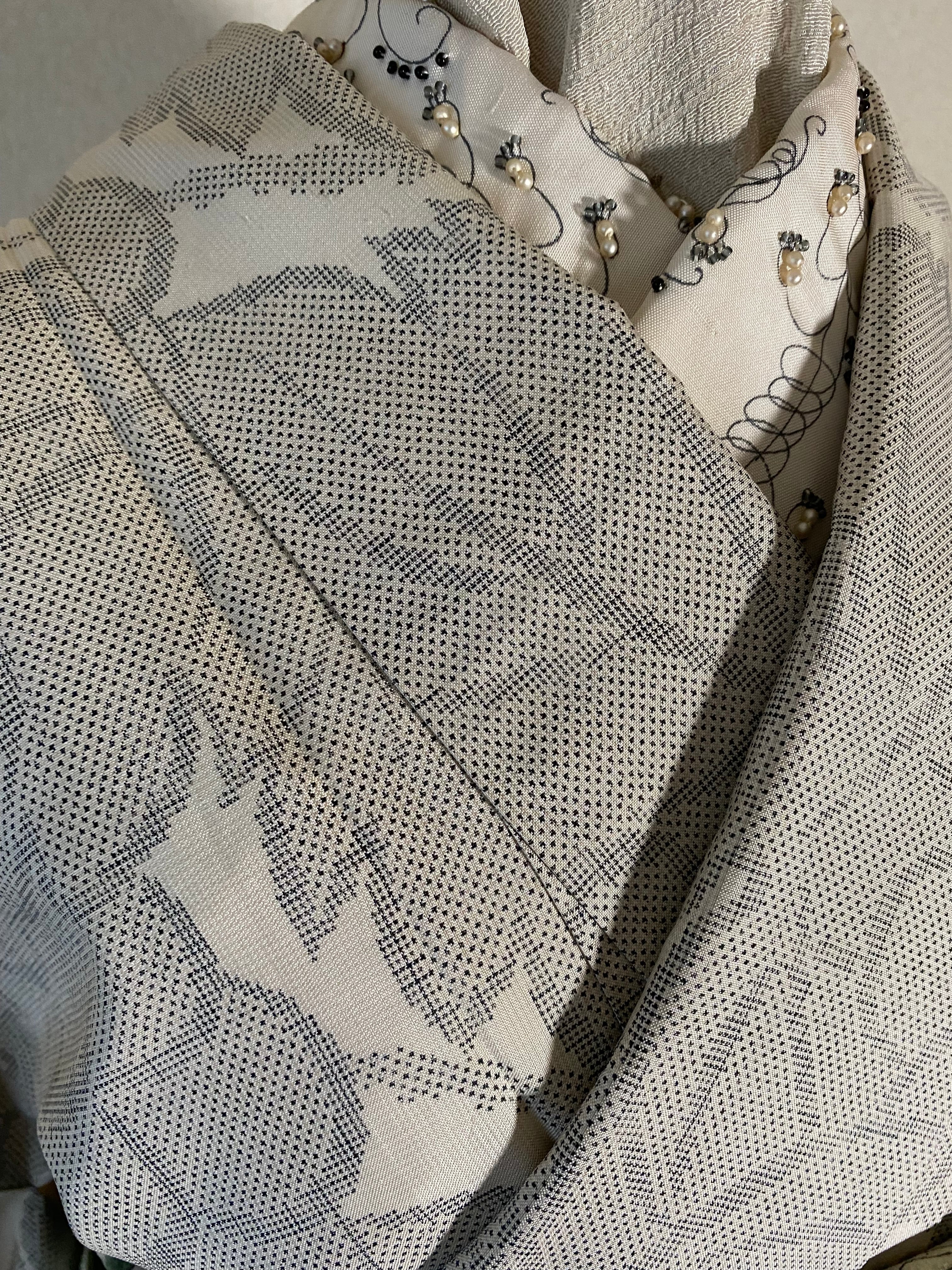 葡萄柄 光沢あり紬 白大島と思われる 白グレー