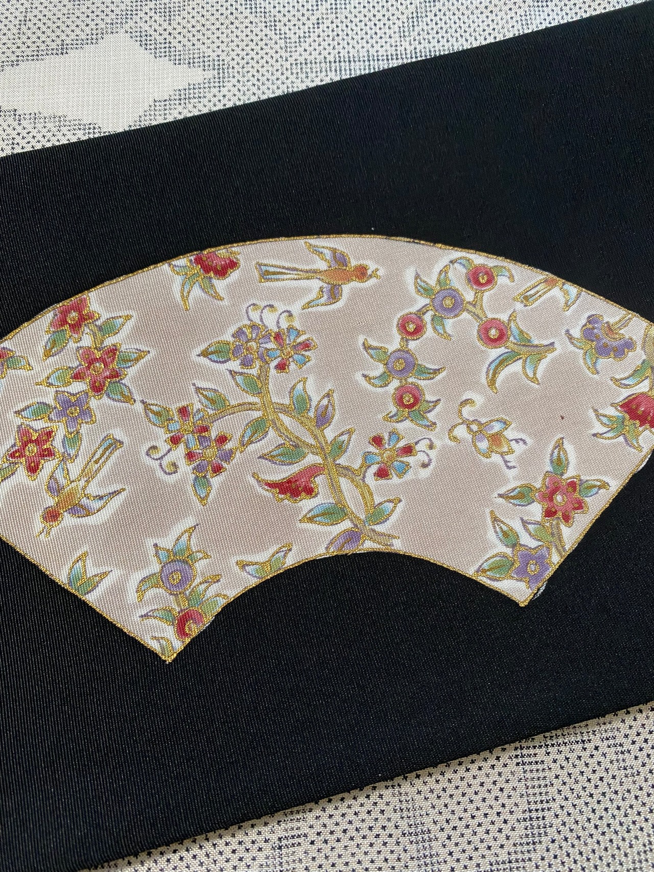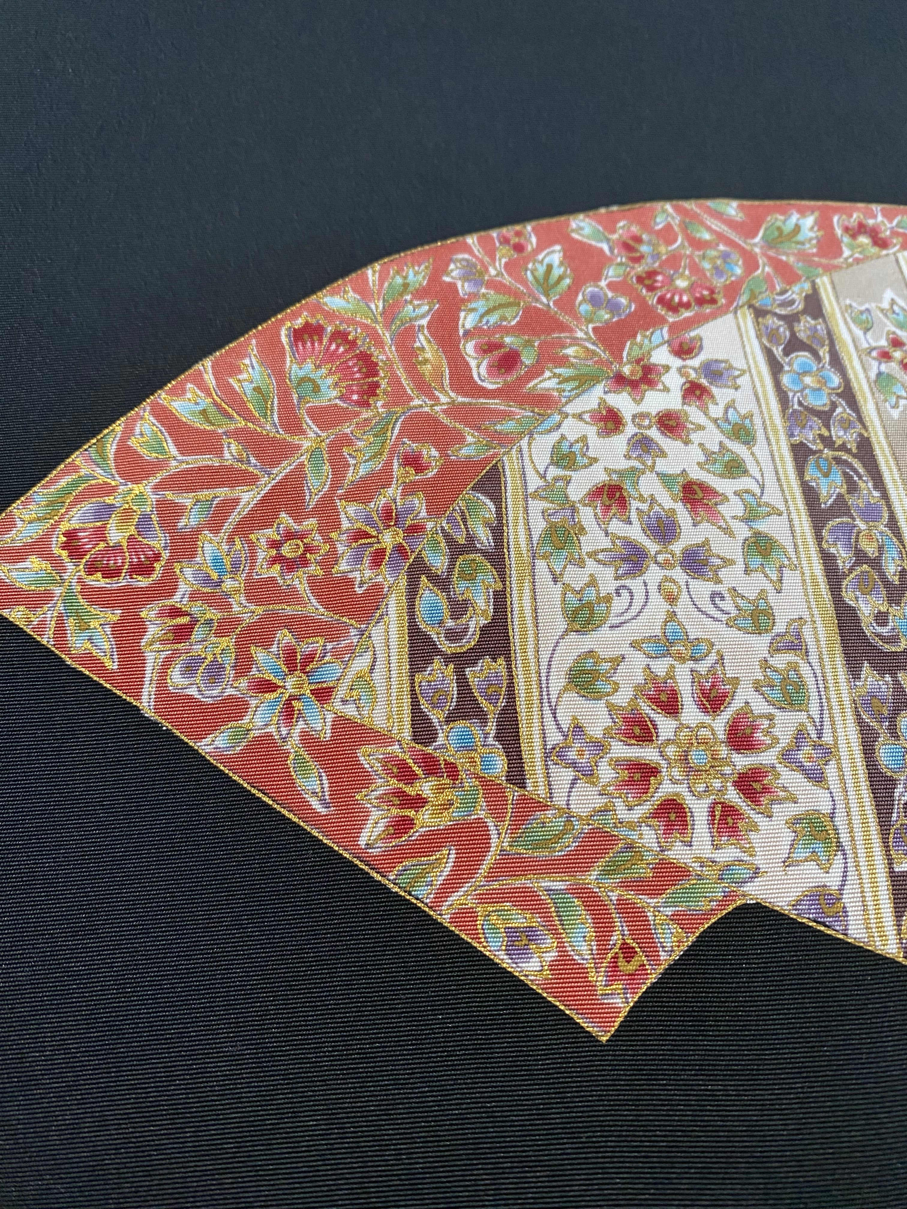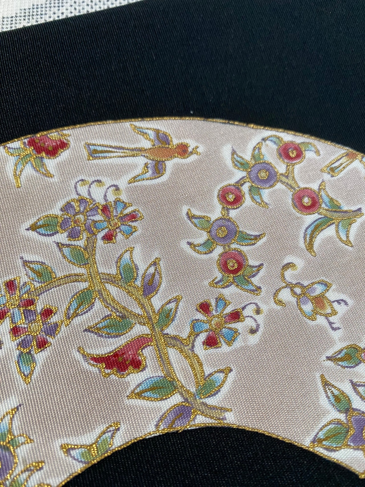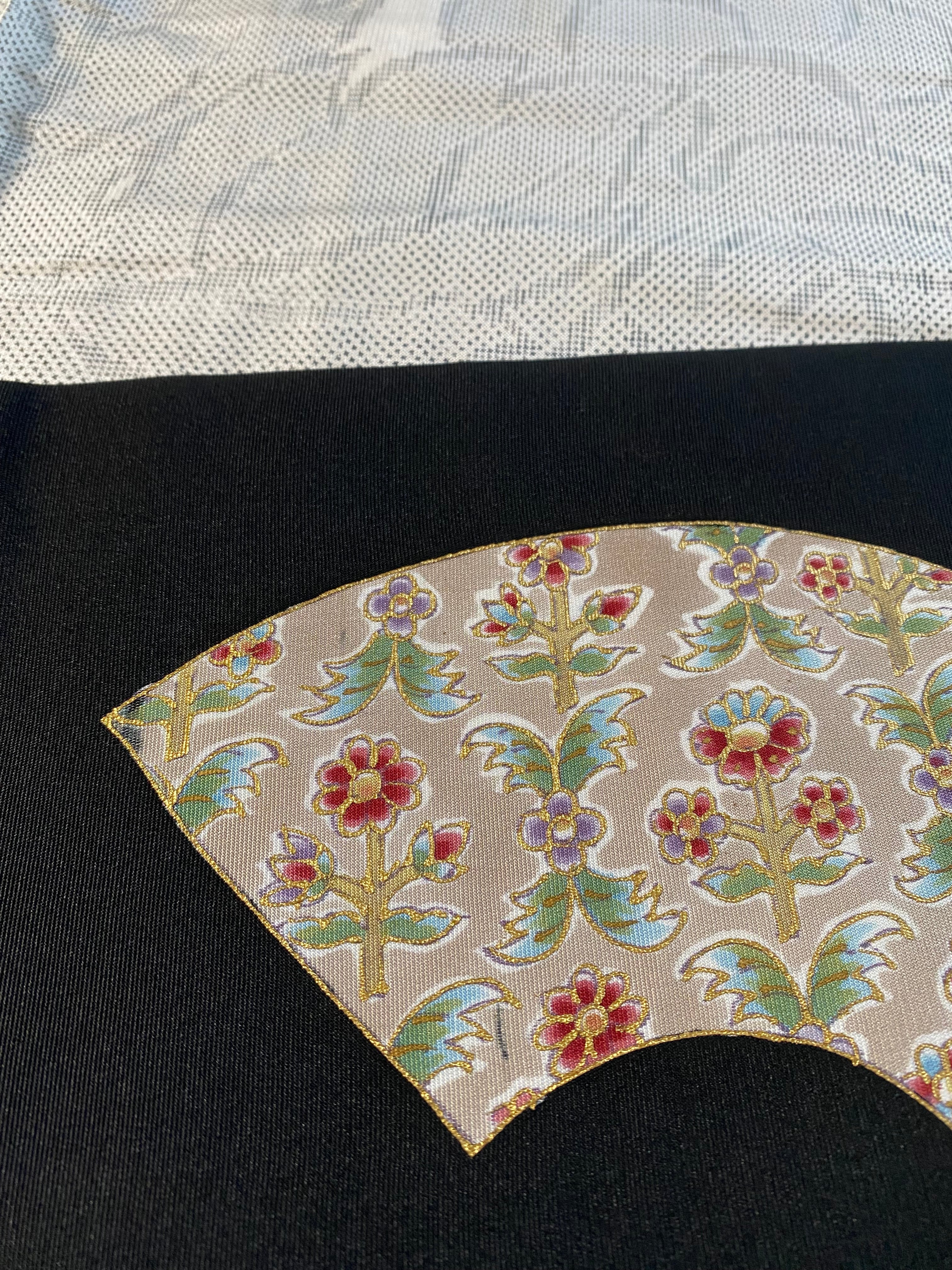 美しい更紗柄の染め、扇型のなかに描かれています。おしゃれな黒地。