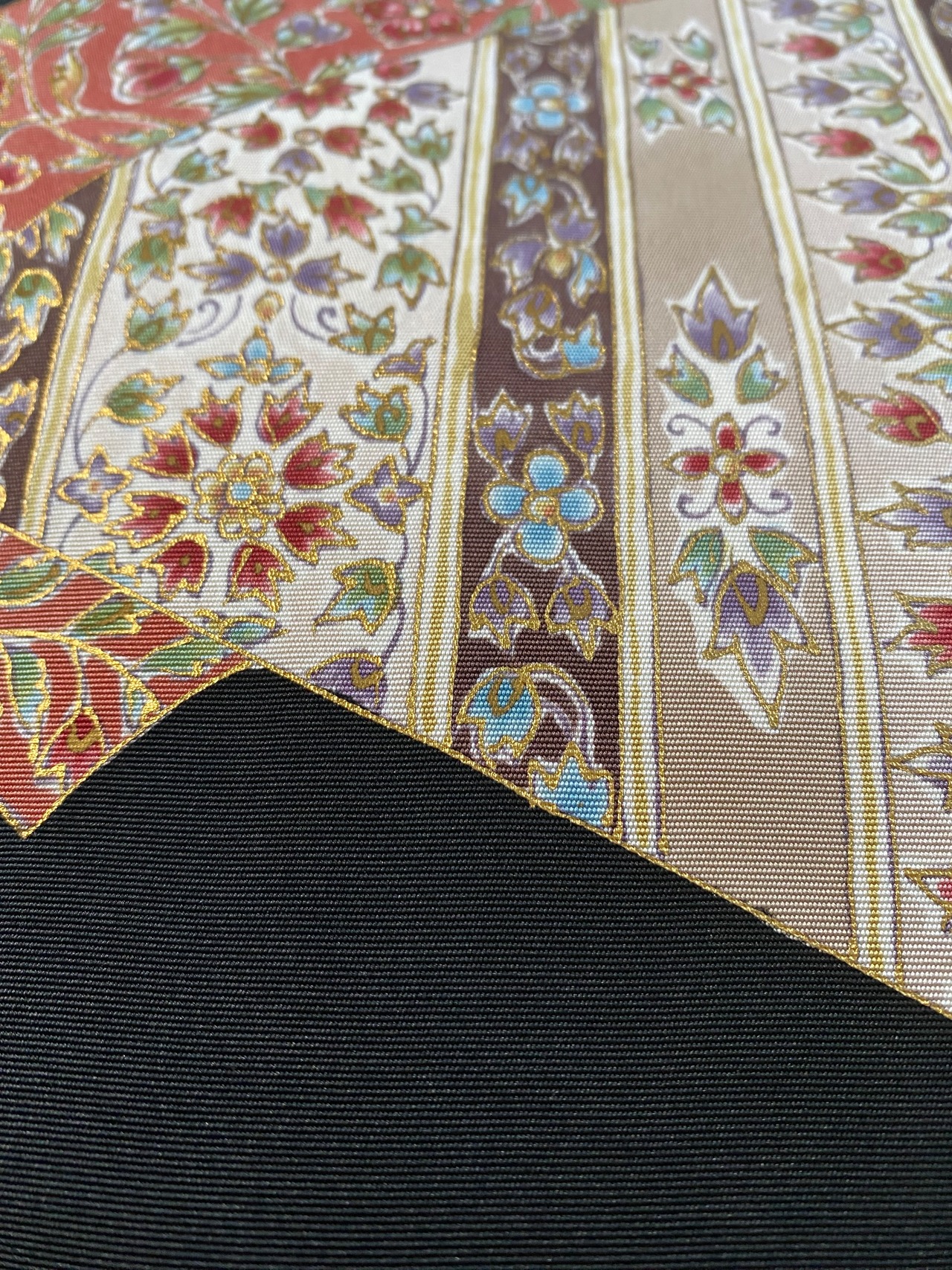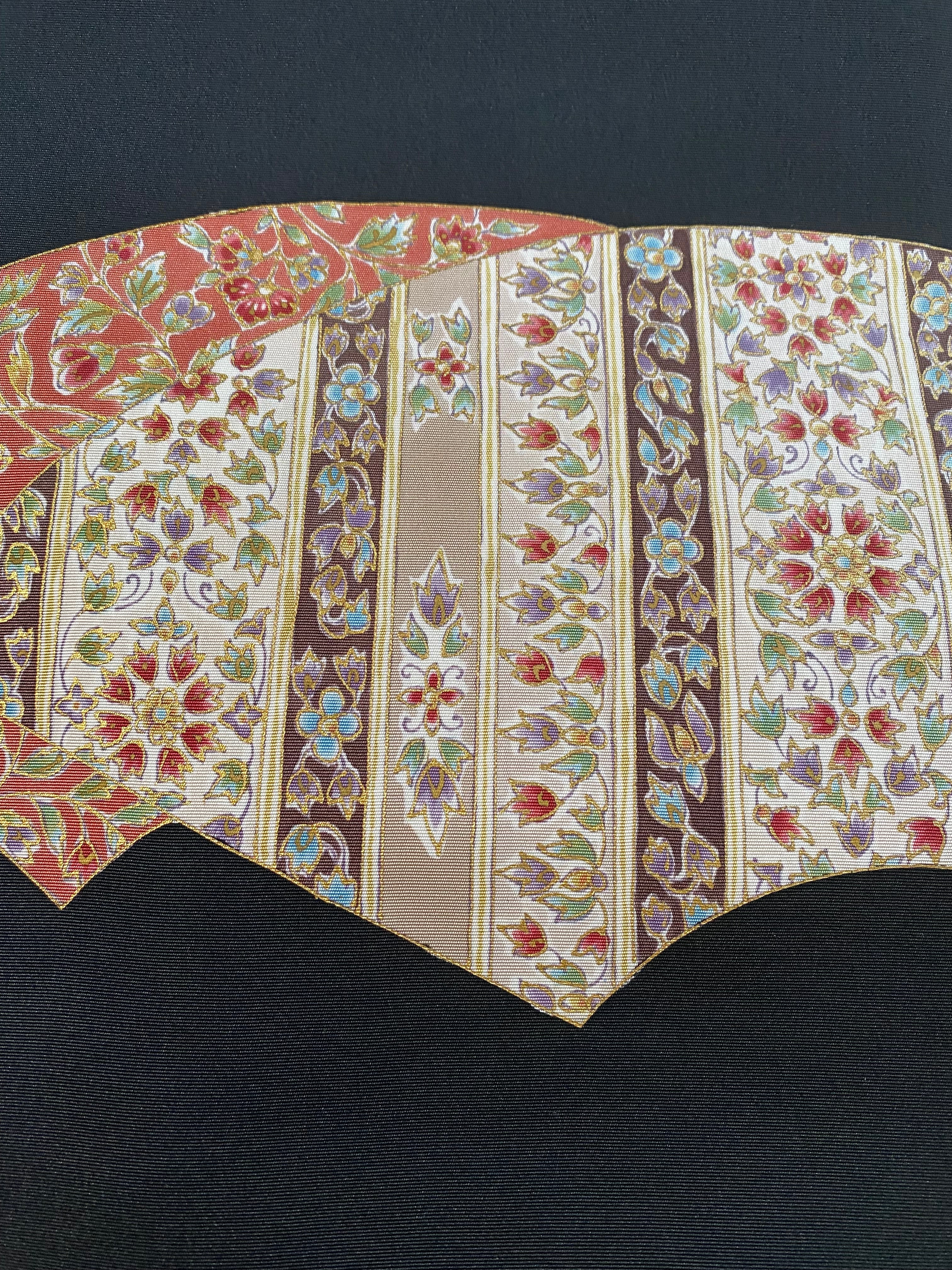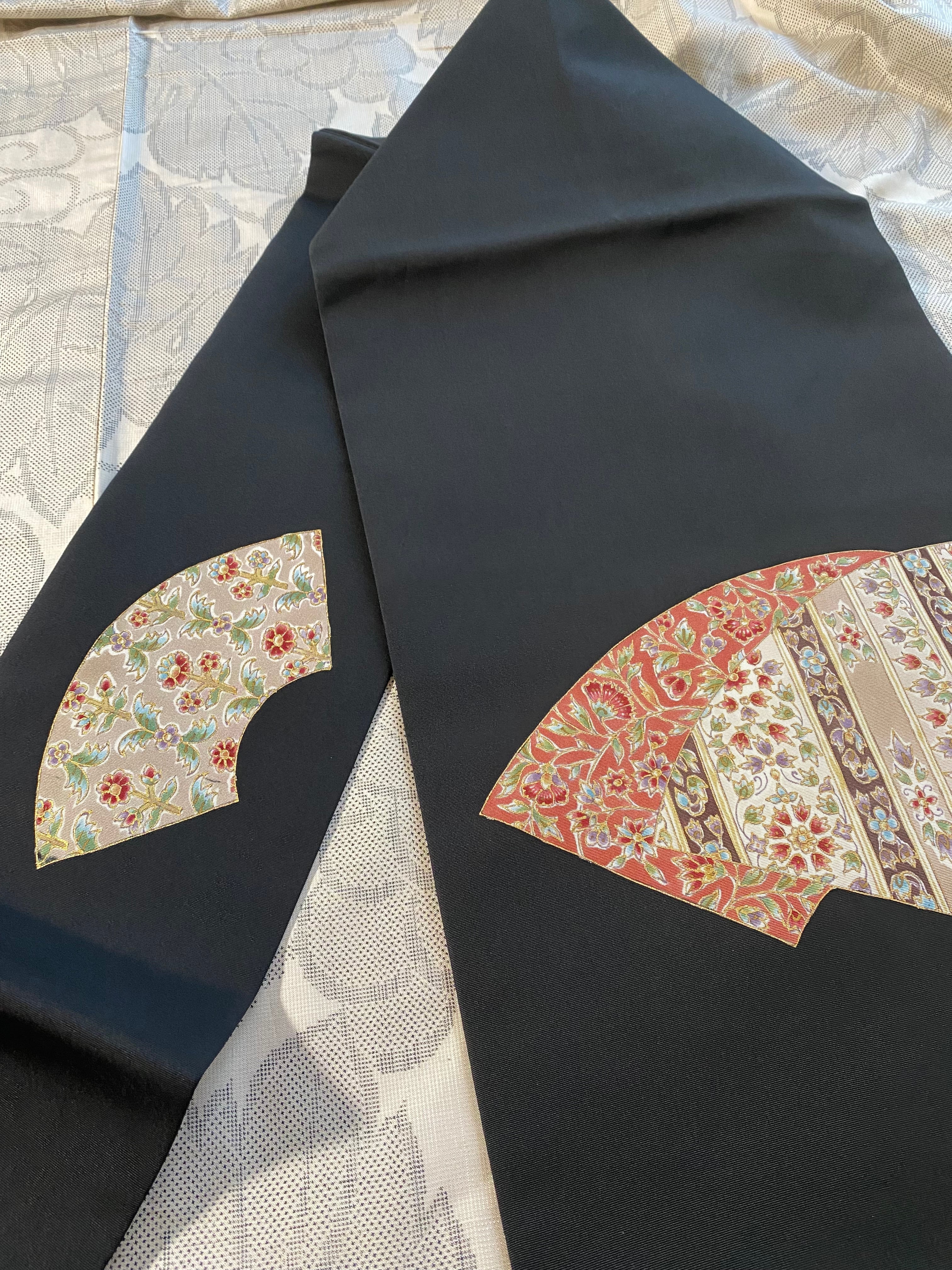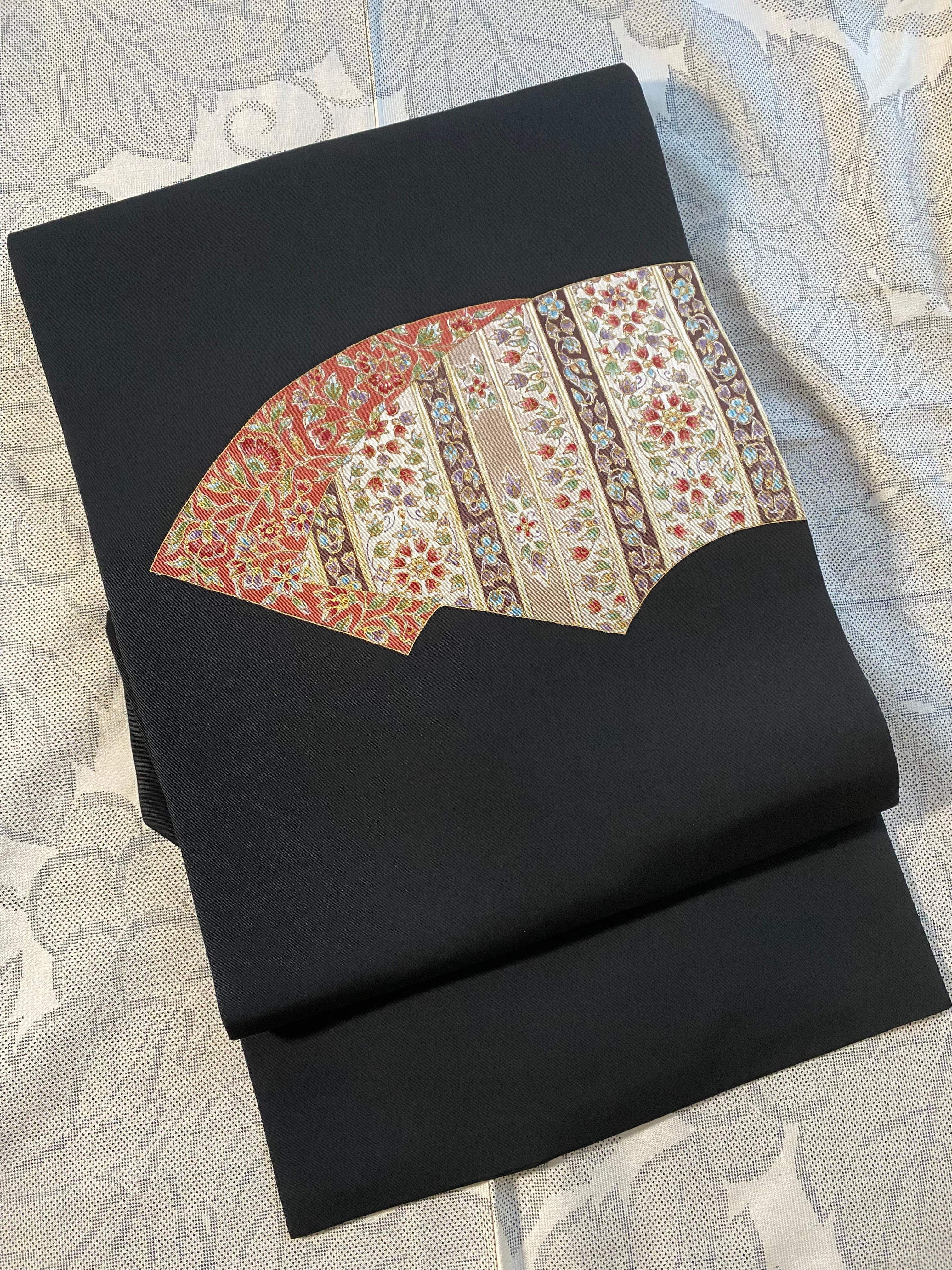 美しい更紗柄の染め、扇型のなかに描かれています。おしゃれな黒地。
