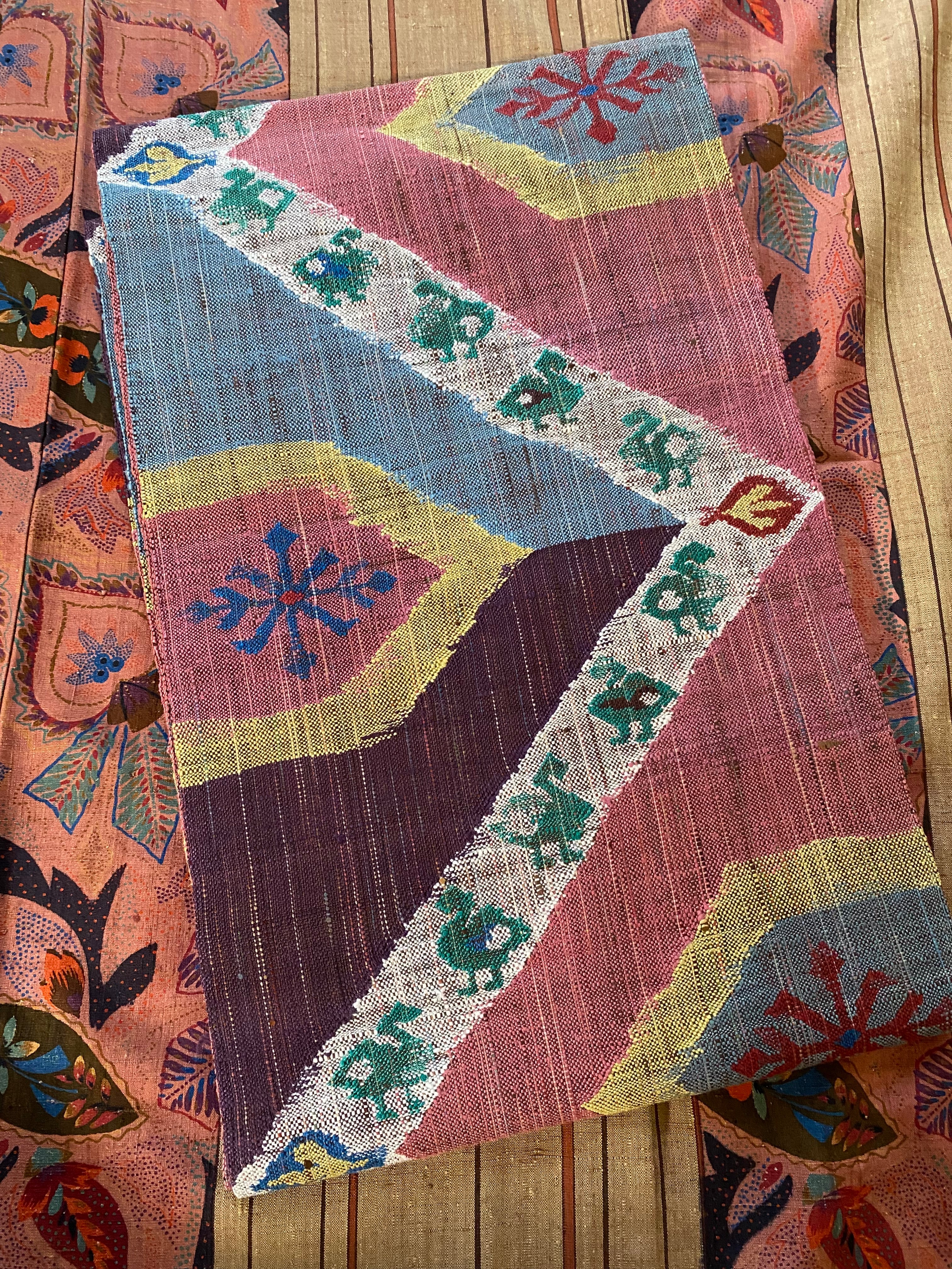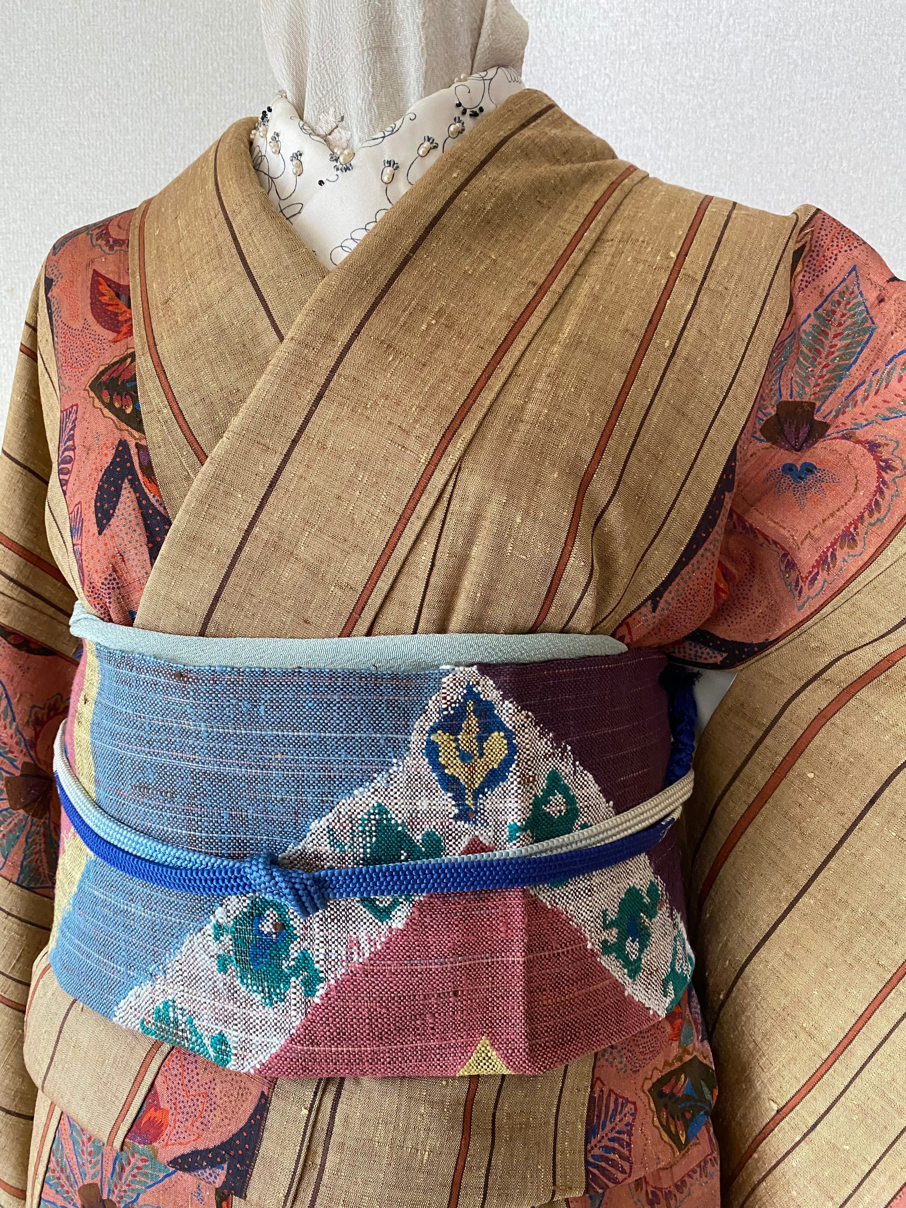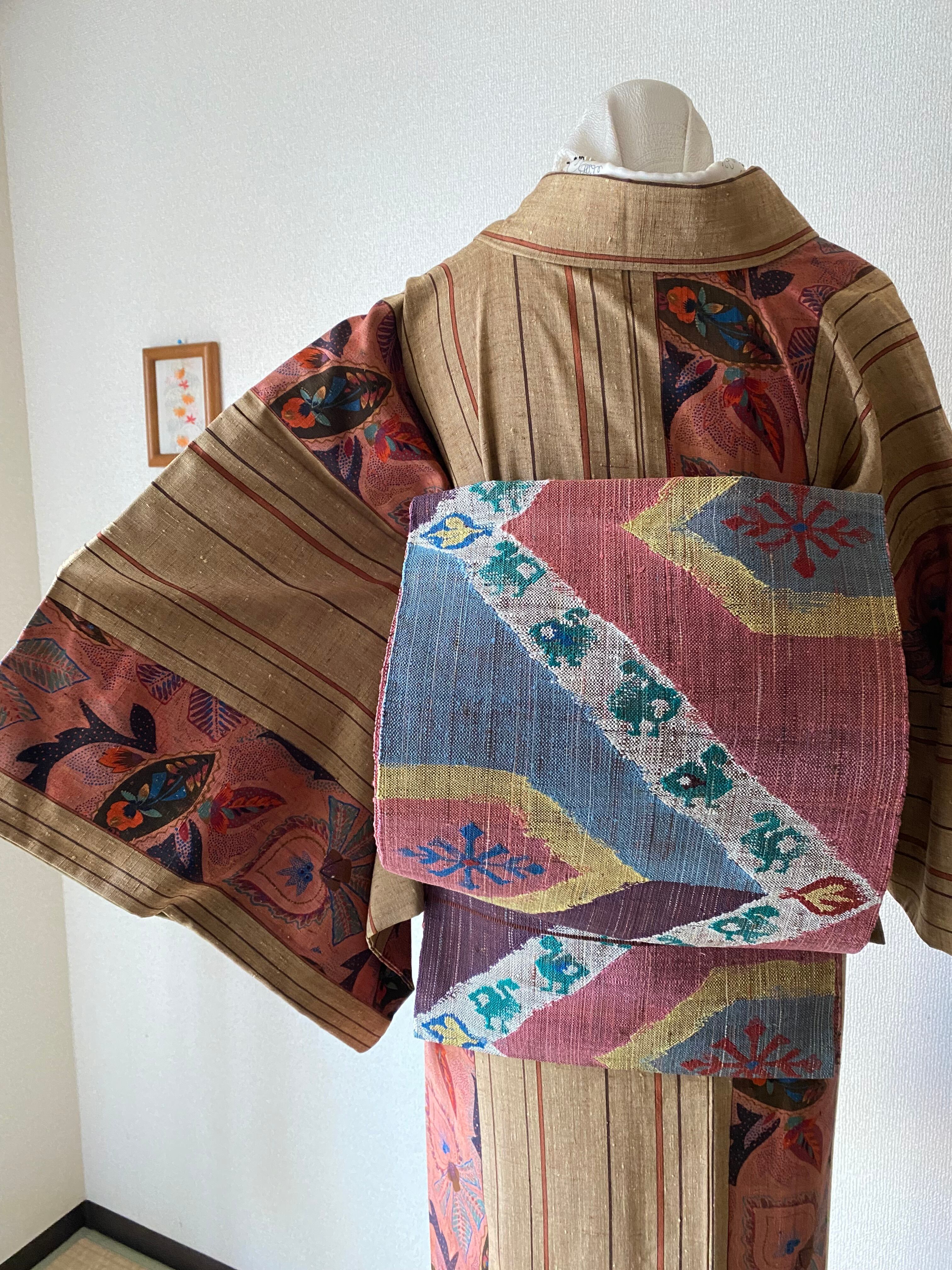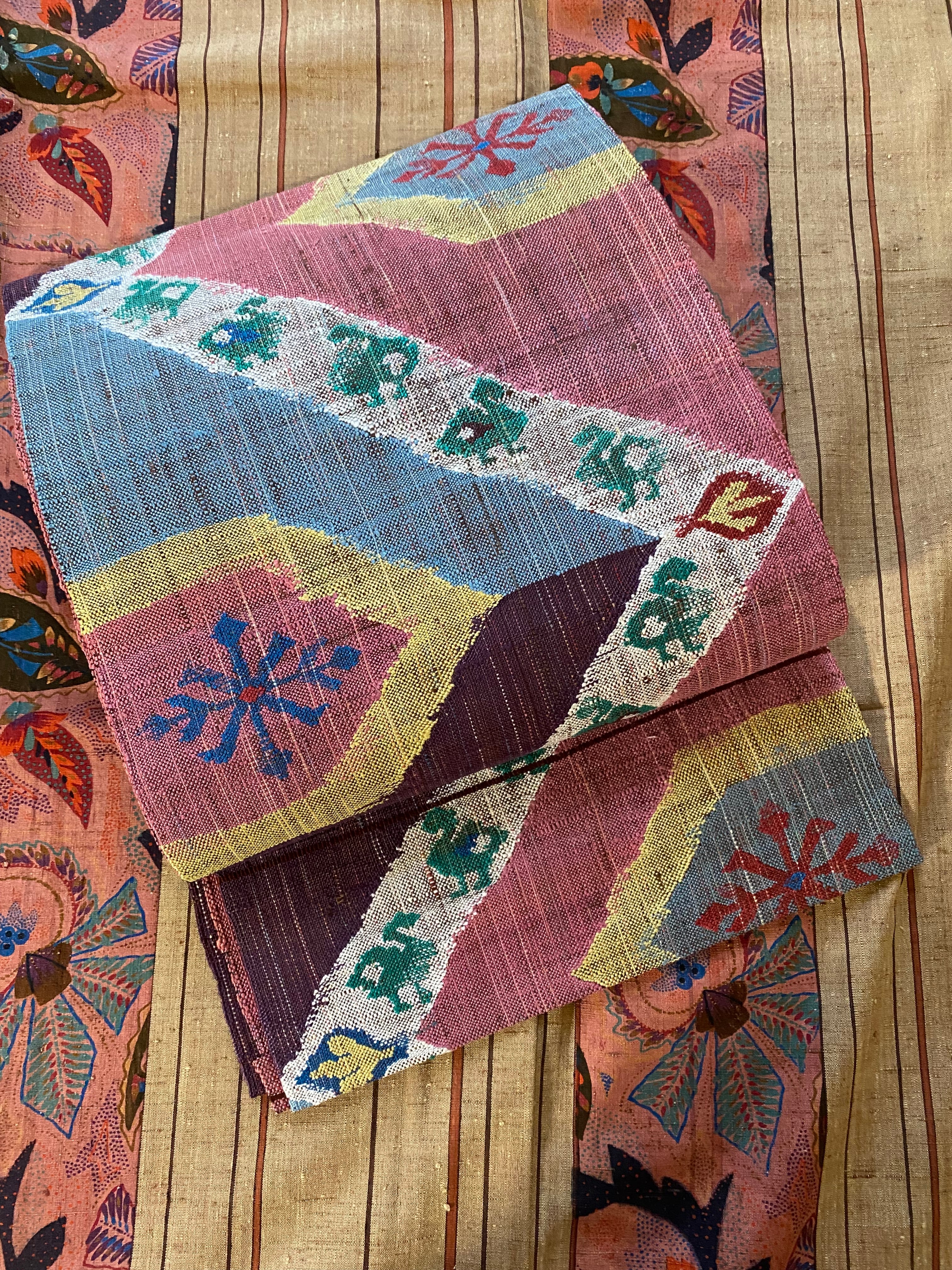 織りの名古屋帯 小さなアヒル ピンク、緑、水色、茶