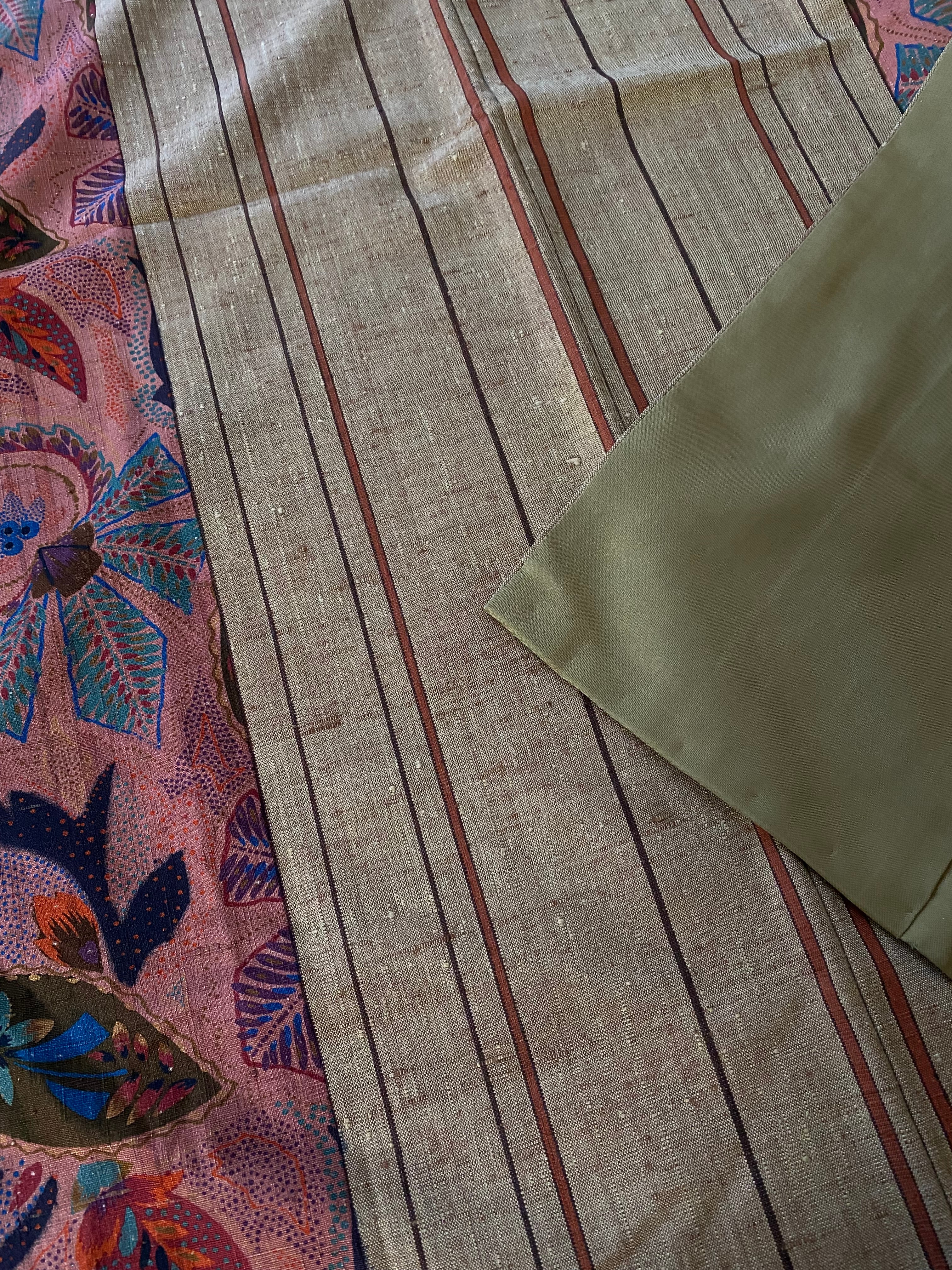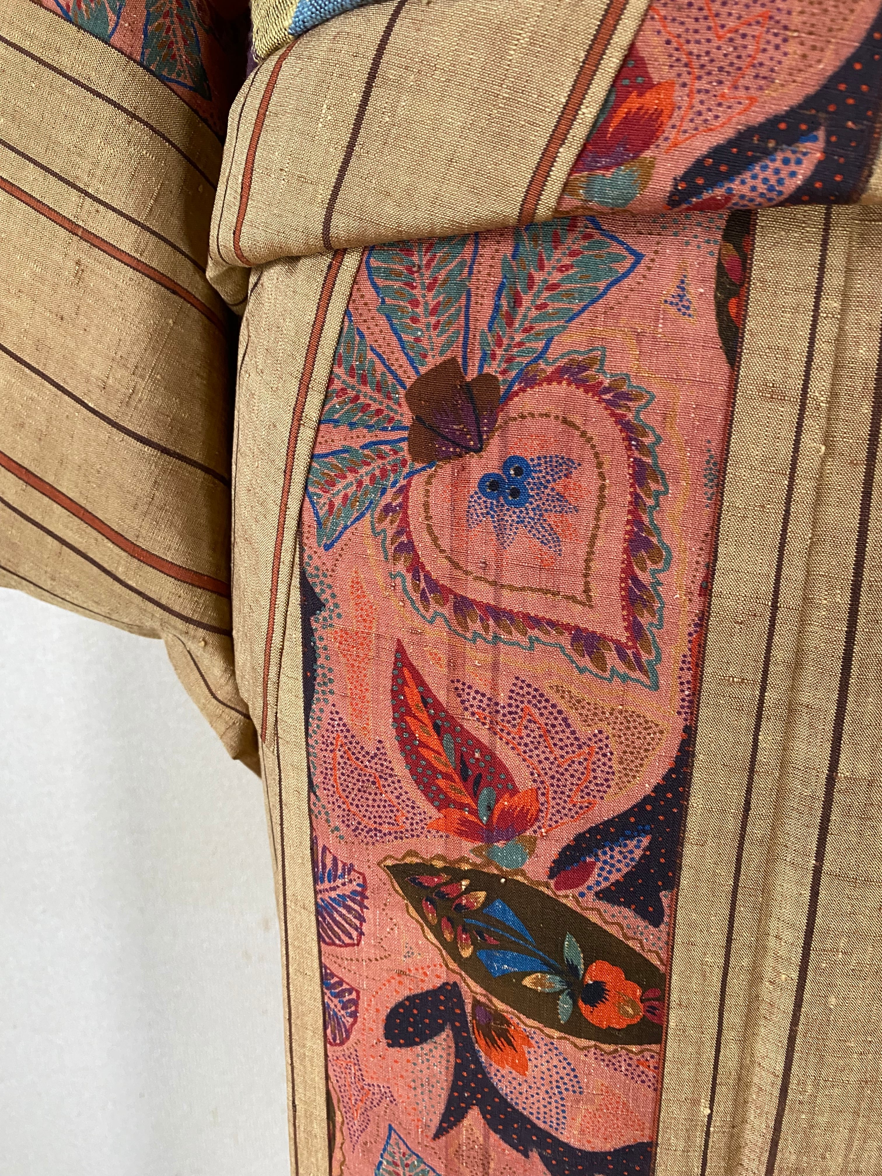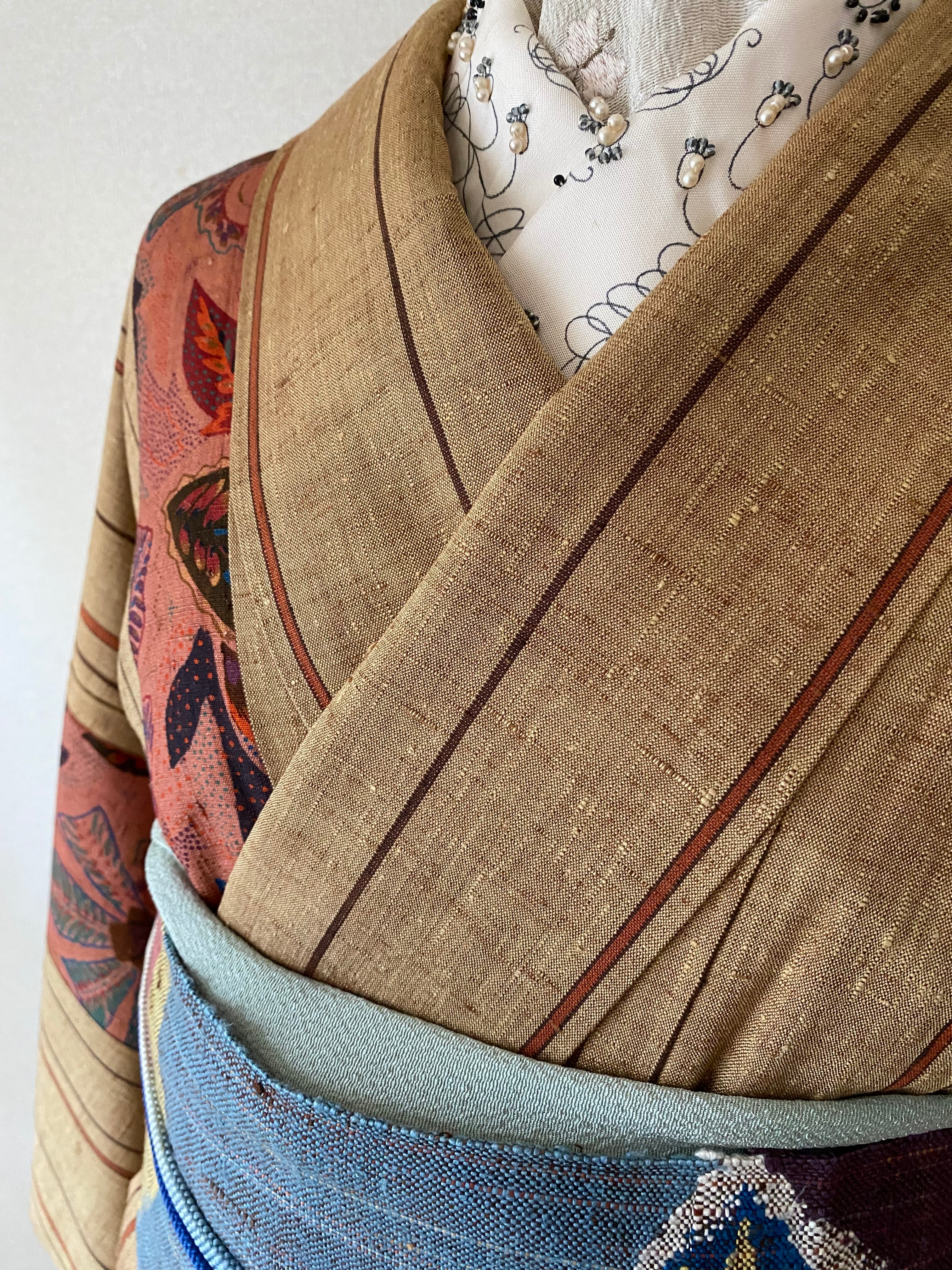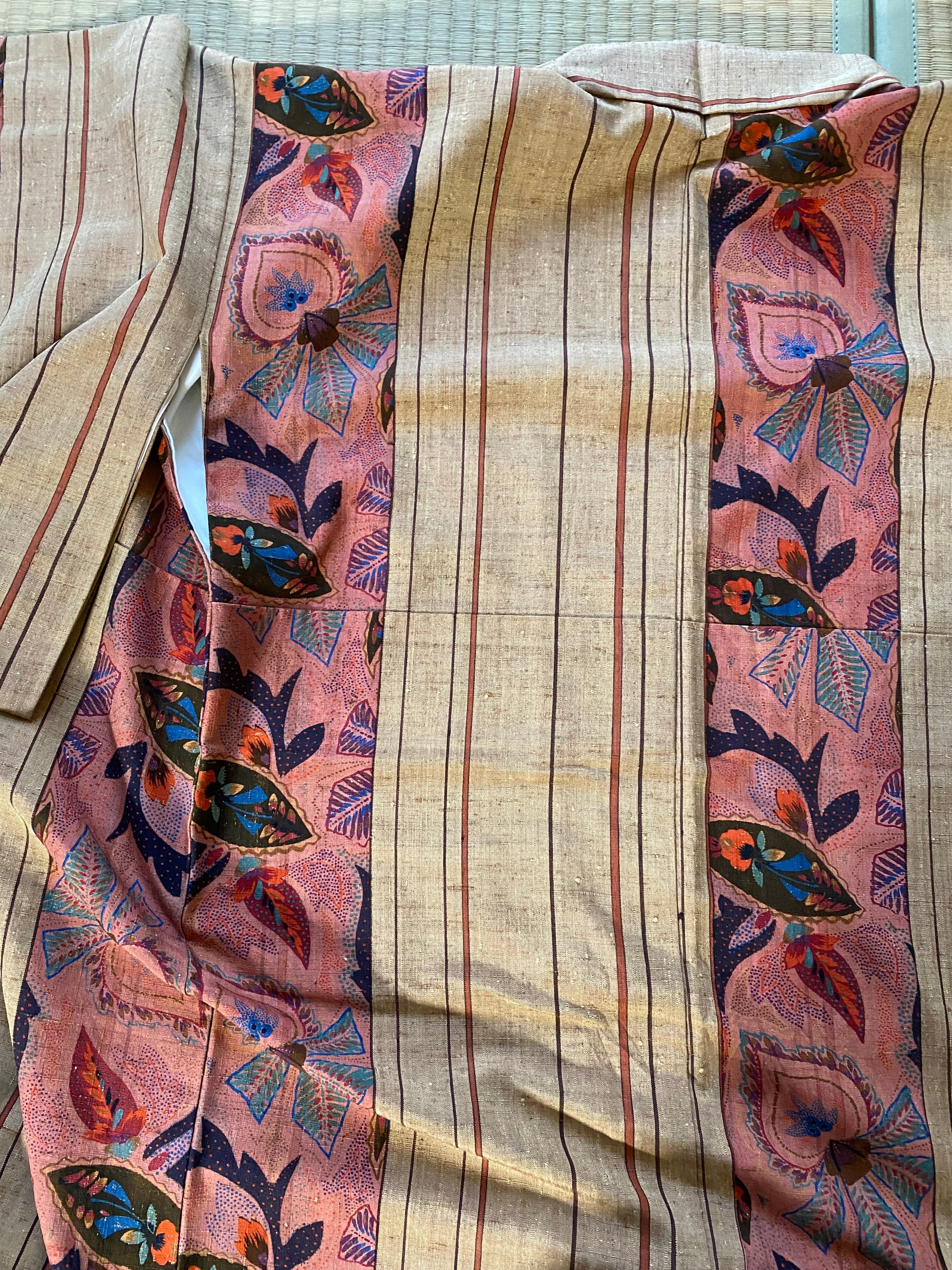 更紗と縞 染め分け紬 茶ベージュ、ピンク