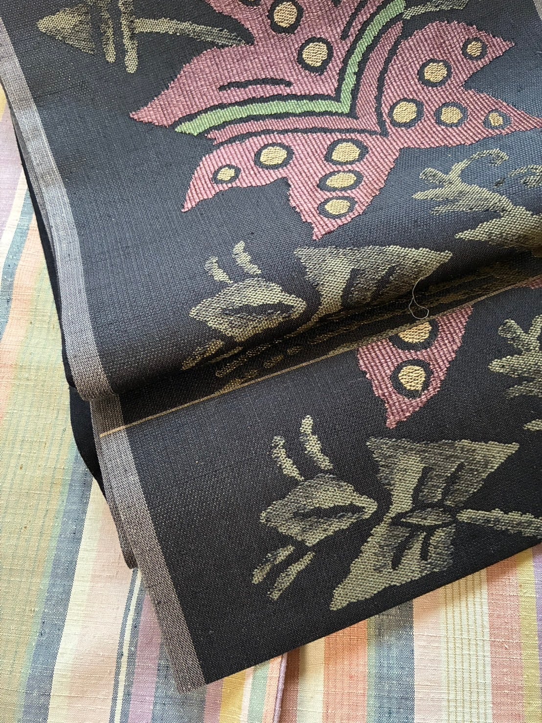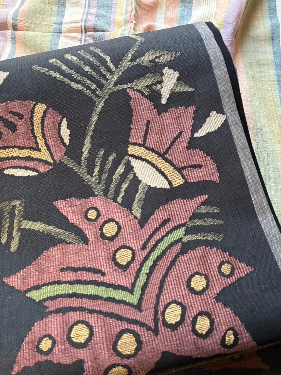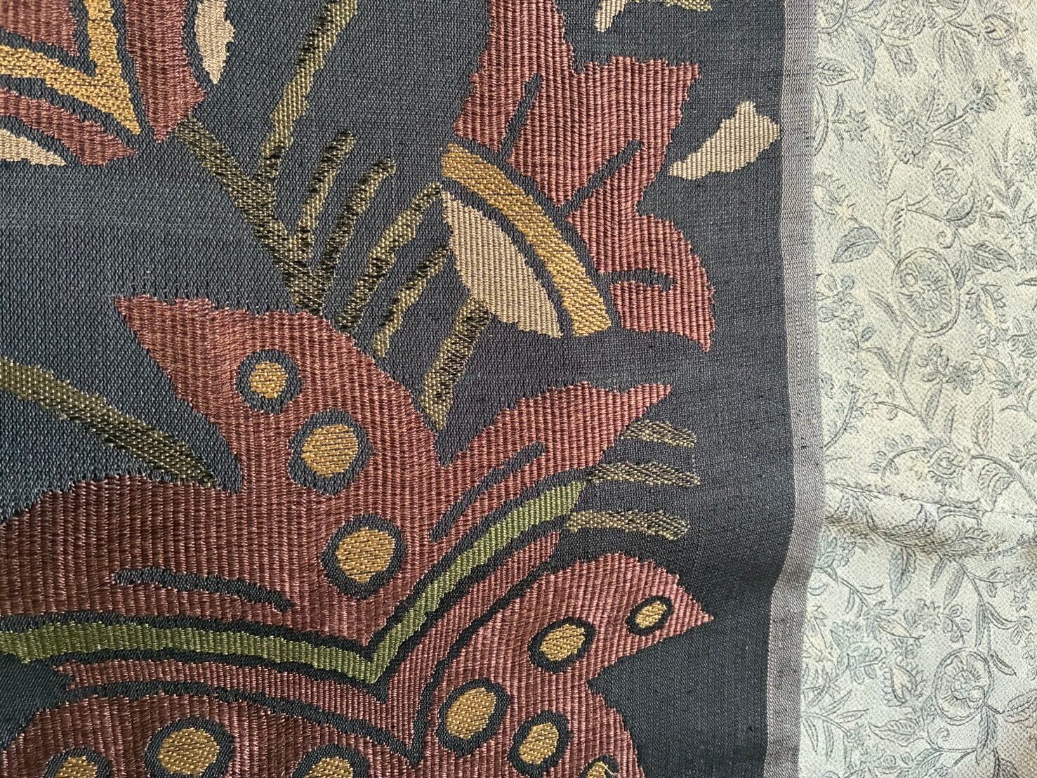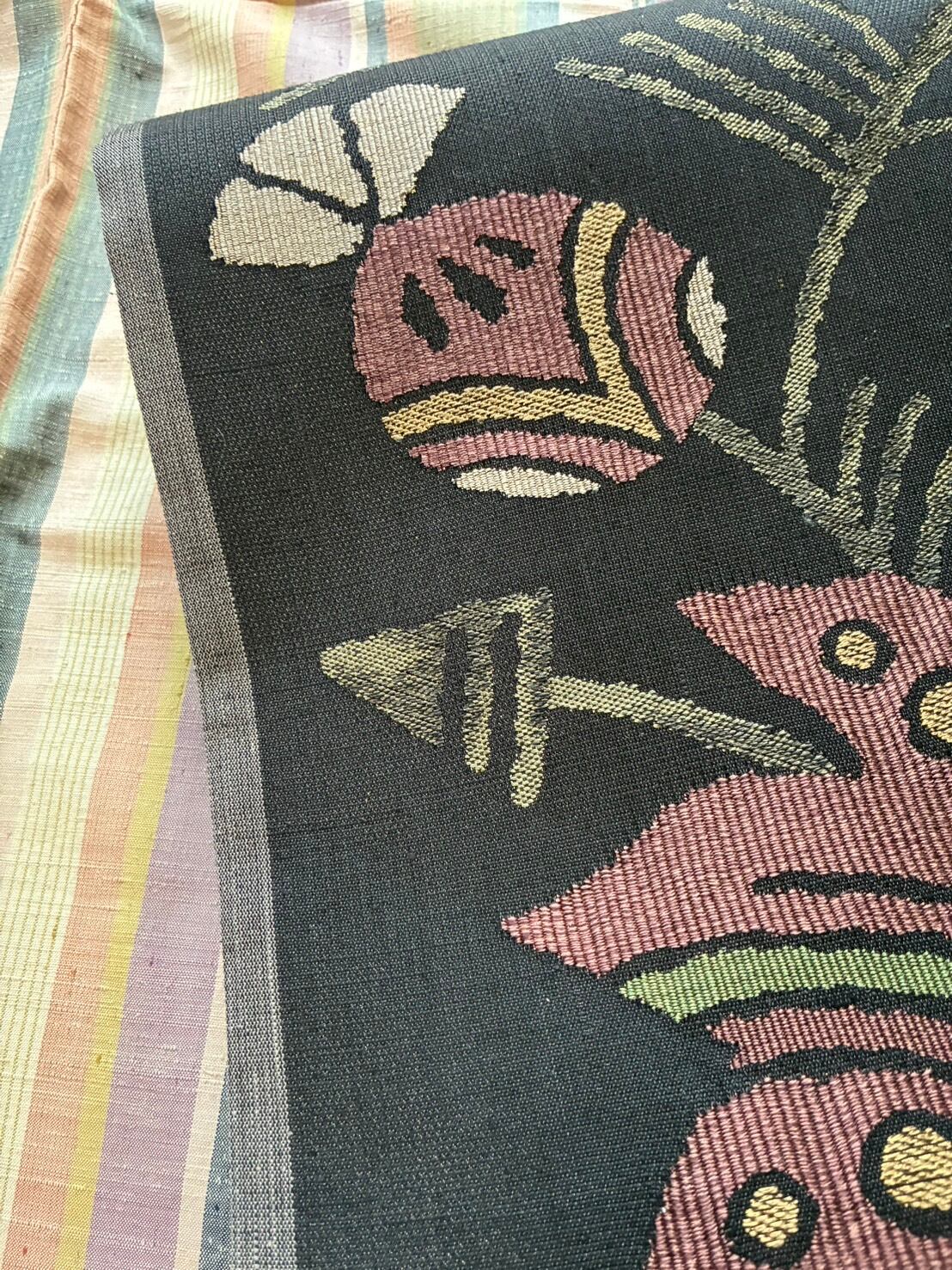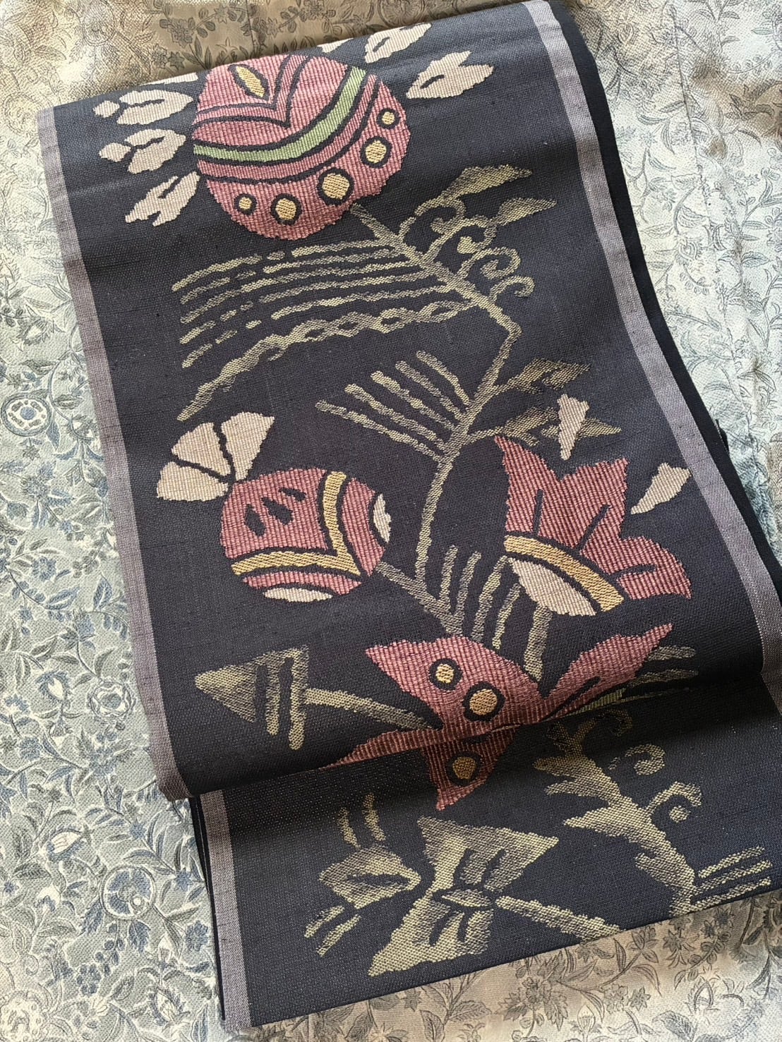チャコールグレー 更紗 深森の花とキノコ六通 袋帯