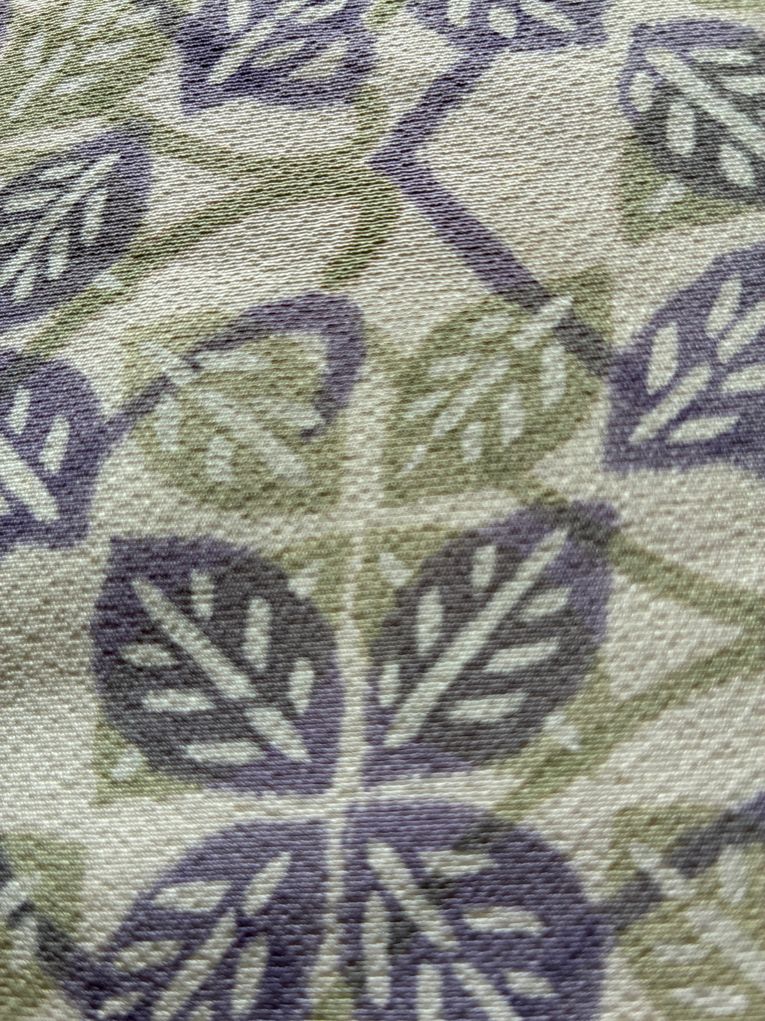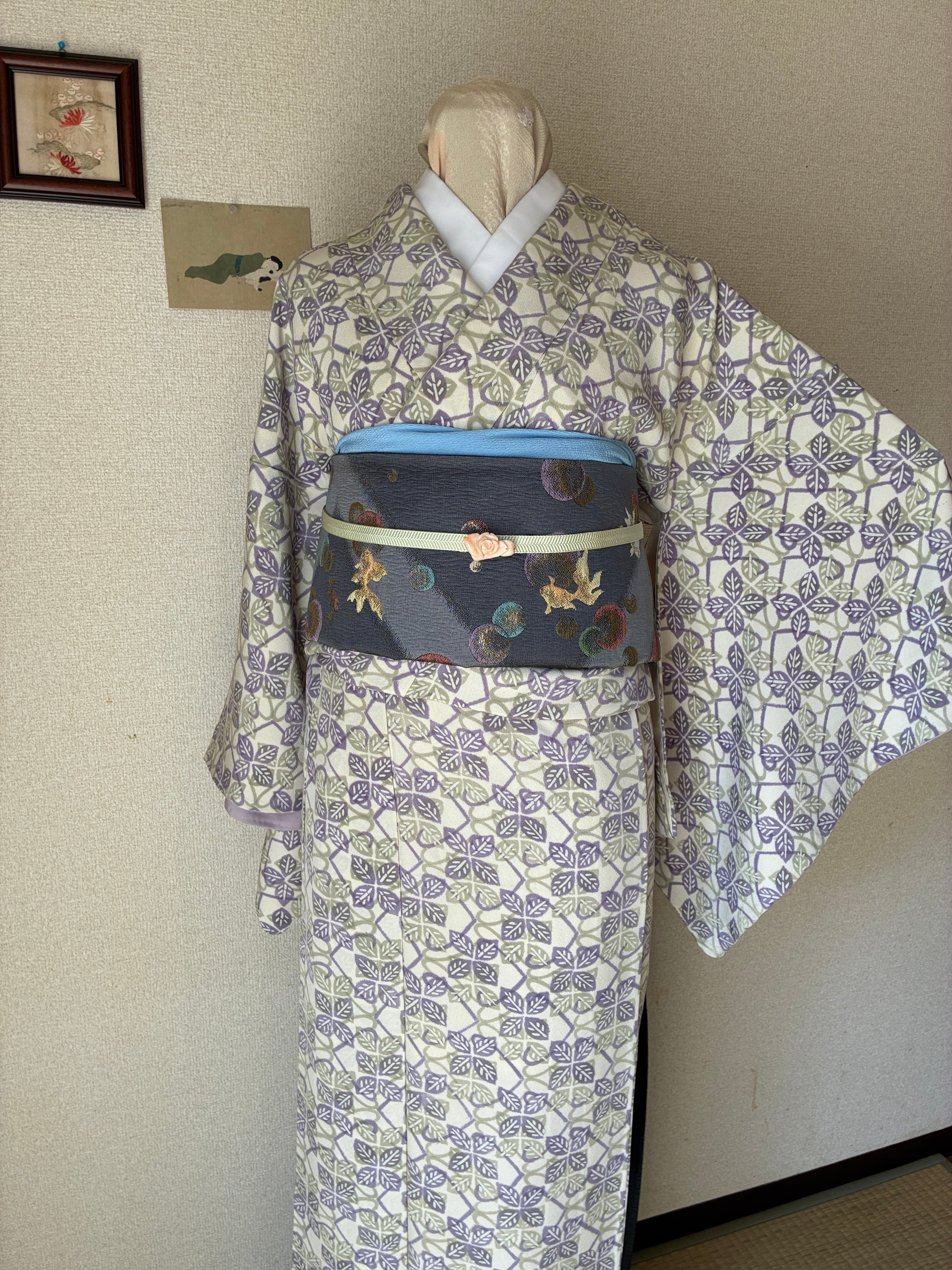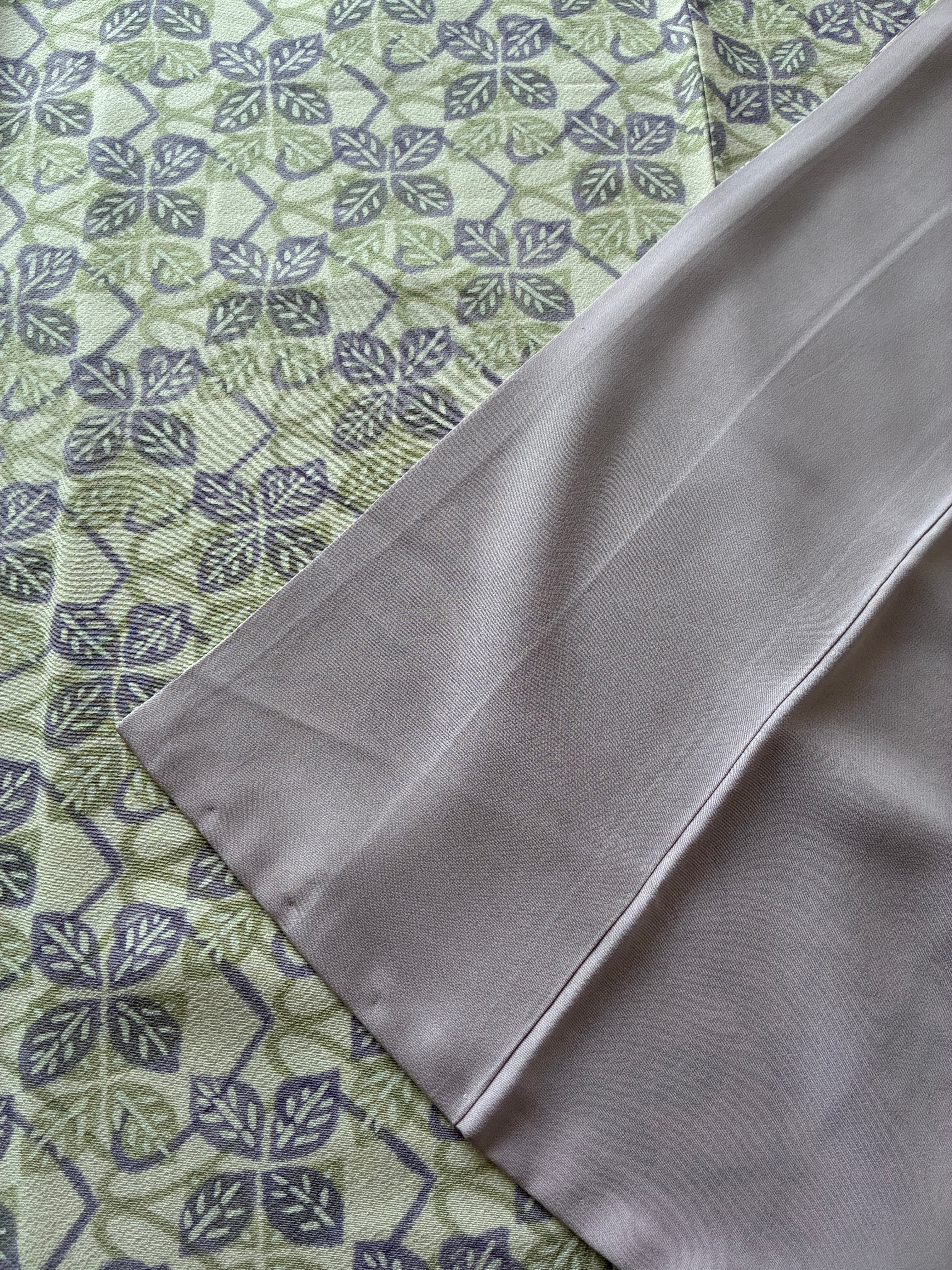 小紋 袷 白地 葉っぱ花四角 藤色ペパーミントグリーン
