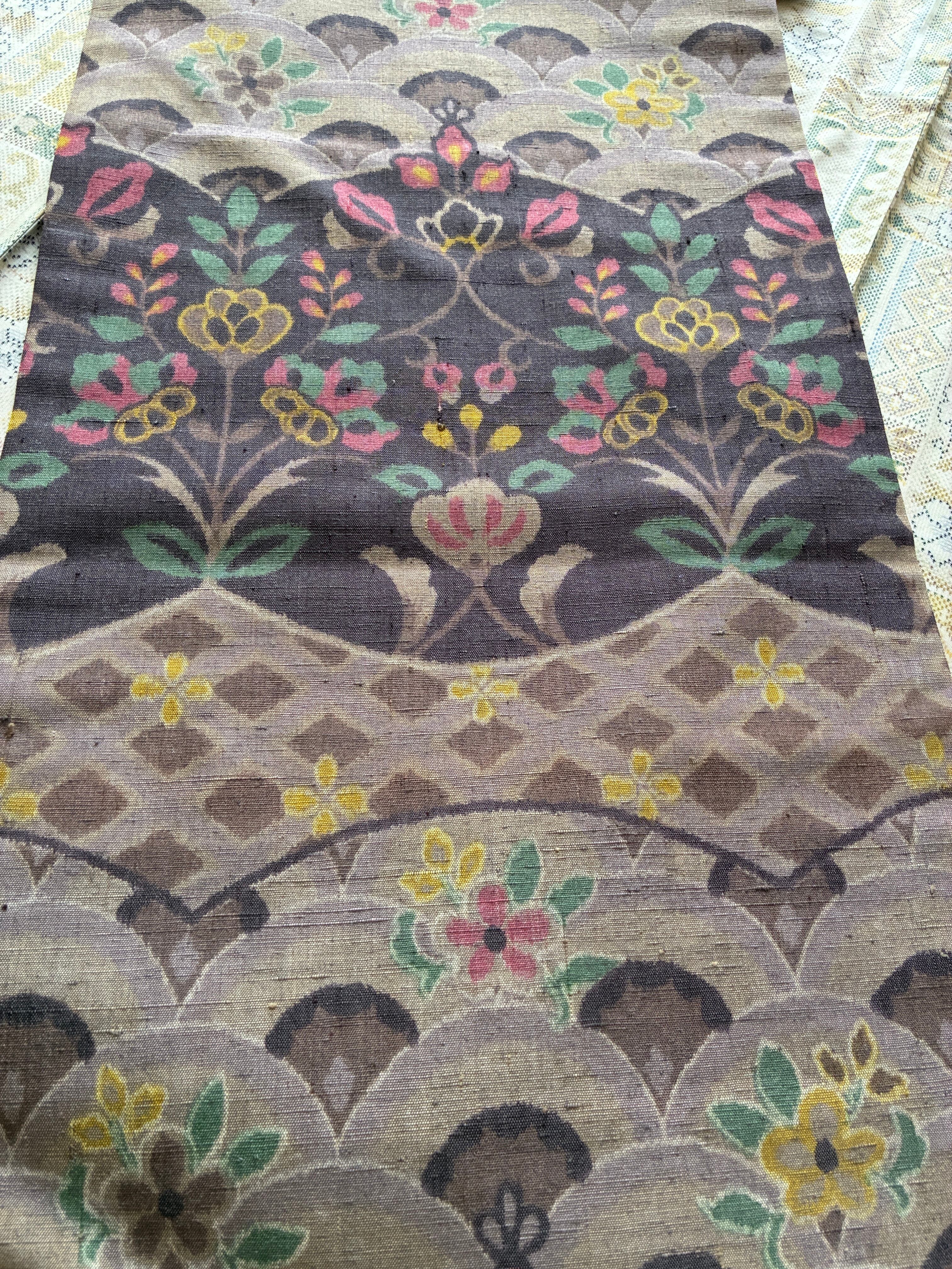 ひらき名古屋帯 染め紬 更紗柄横段文様 グレーベージュ紫ピンク茶