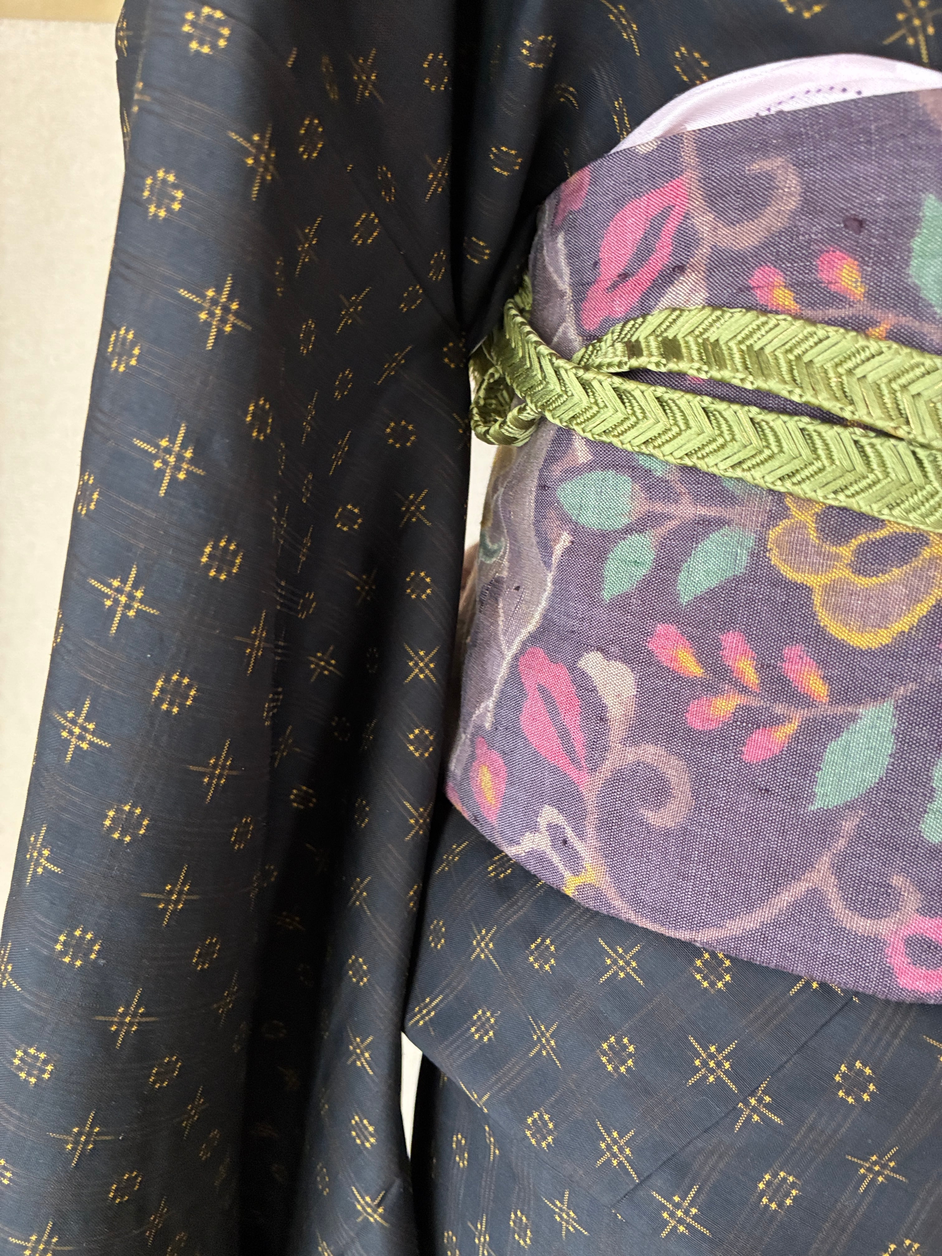 たぶんキモノ反物を帯に仕立てた創作帯と思います。