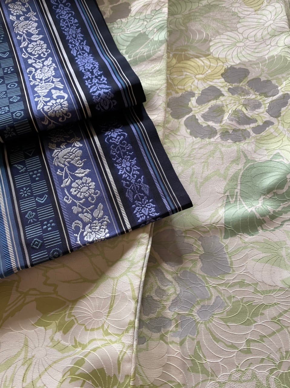 博多織りの紋様も細かくやさしい花や唐草、小鳥もいます。おめでたい宝尽くし紋様も小さく入り、ちょっと改まったお出かけにもしめられます。
