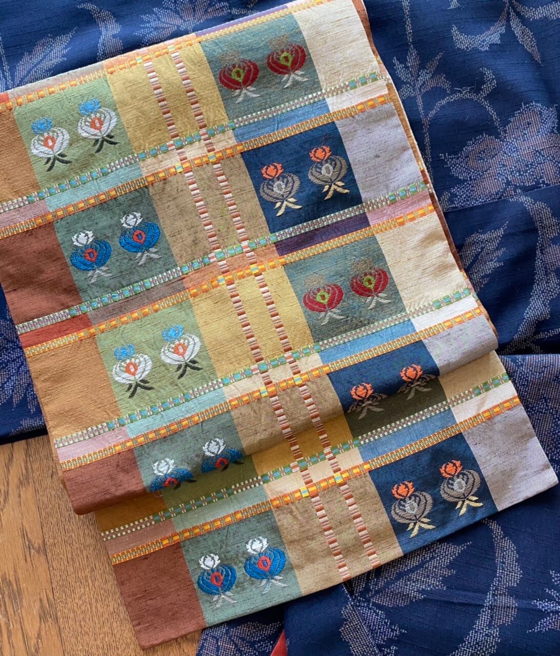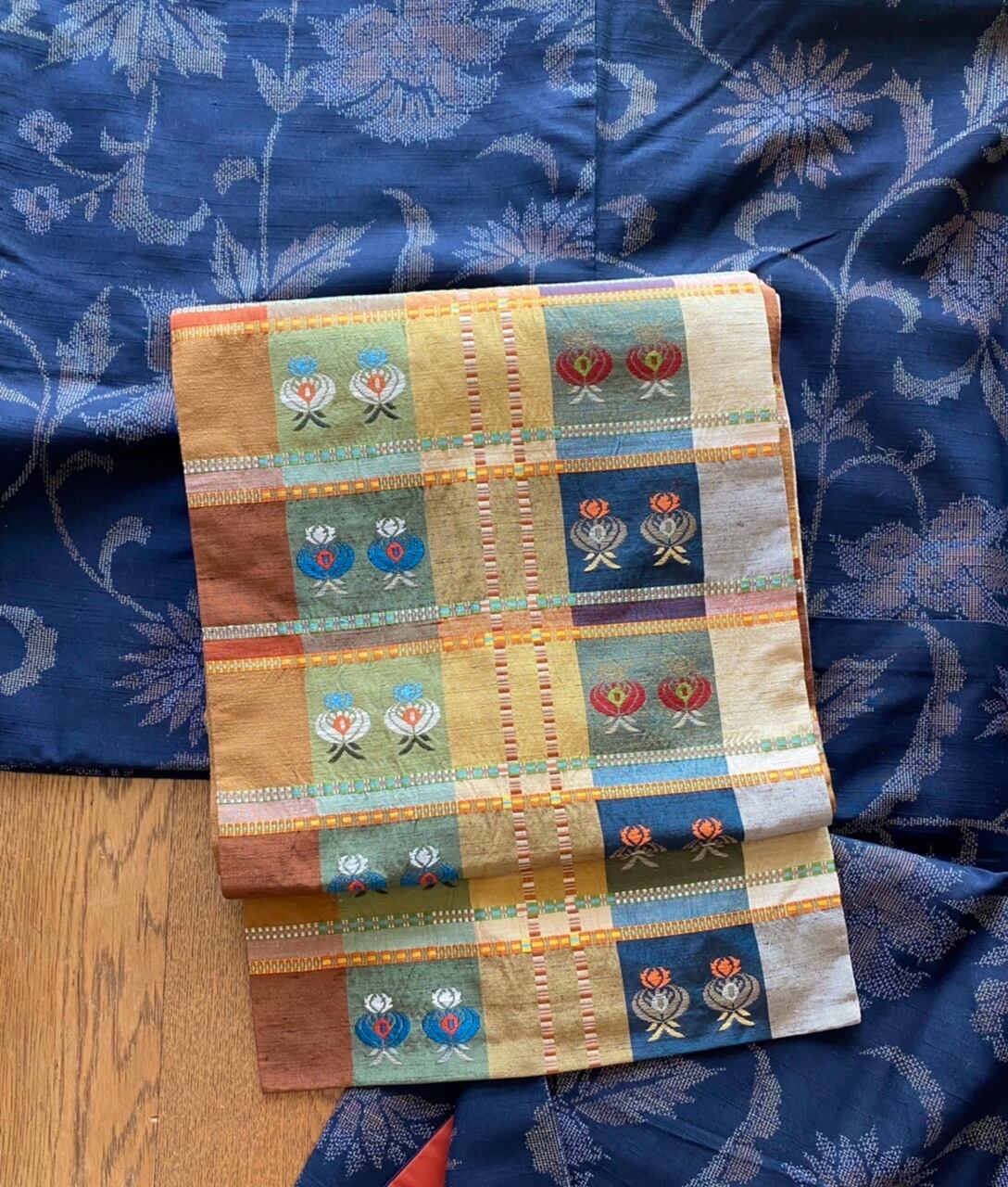 辛子色、紺色、茶色…素朴なかあいらしい帯です。