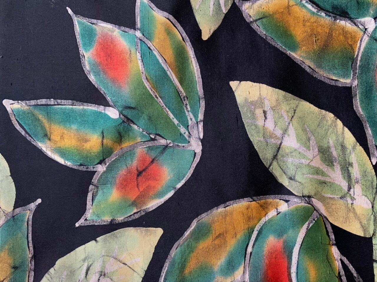 橙色、緑が黒地に映える雰囲気ある染めの帯です。