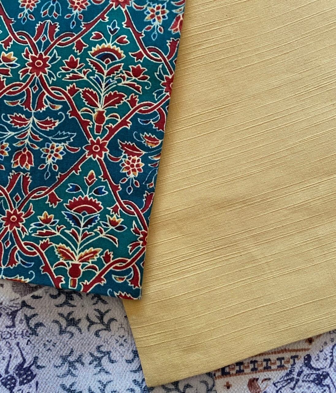 全通 名古屋帯 緑の更紗に黄色裏
