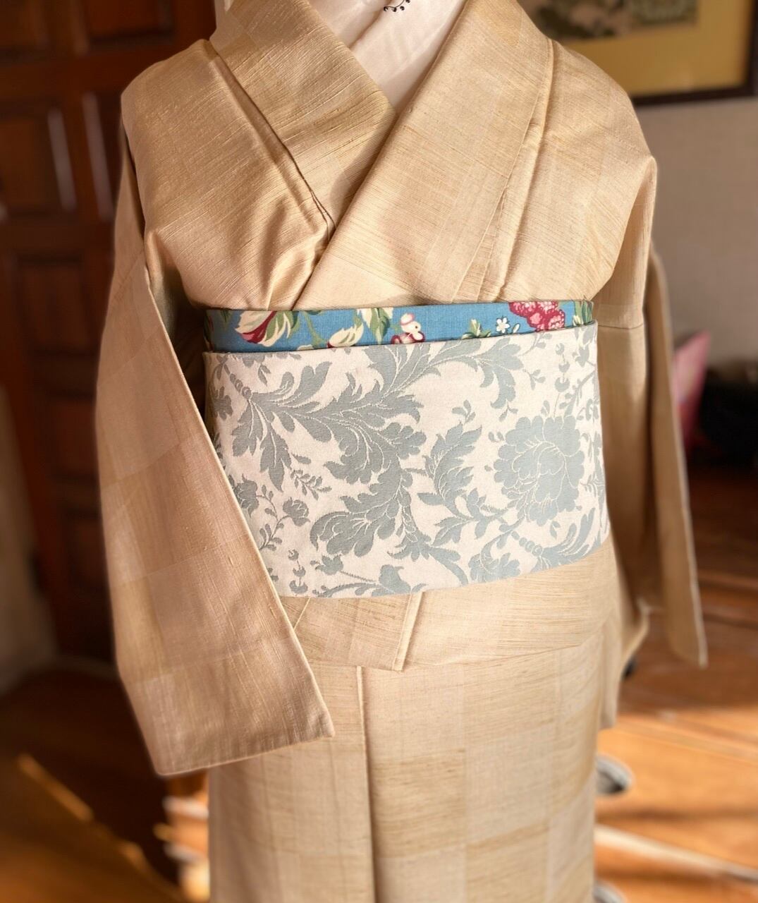 品のよいベージュ系、薄クリーム系の紬。