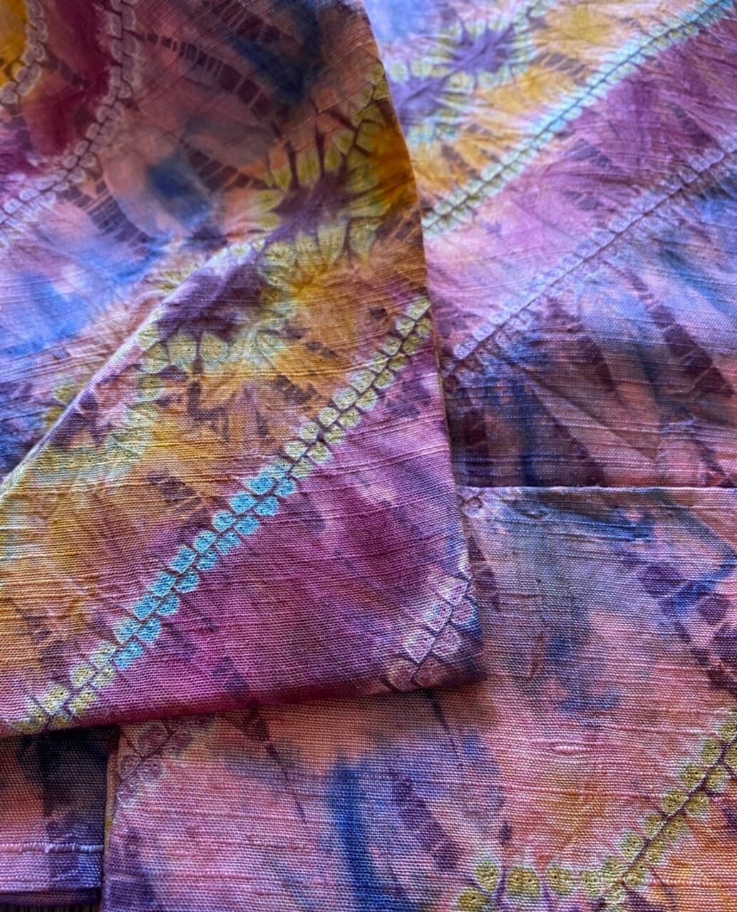 斜めに入った絞り、いろいろな絞りが本当にこだわりの染め、お色味、なかなか珍しいお品です。
