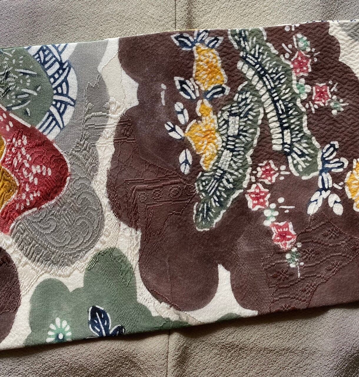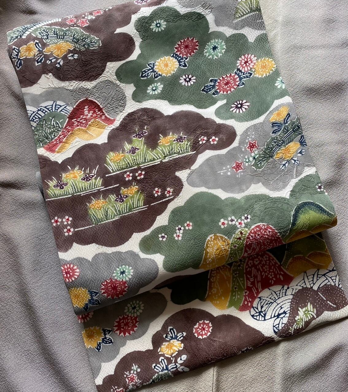 紅型 冨重さん 名古屋帯 緑茶 野の花々