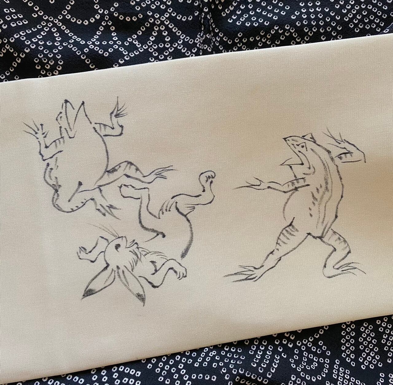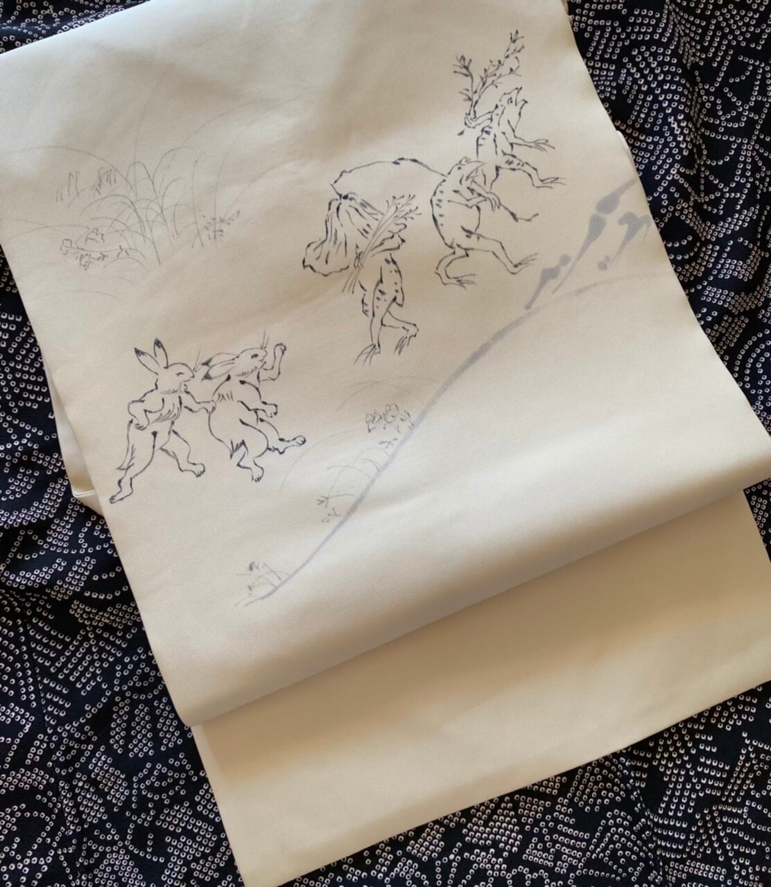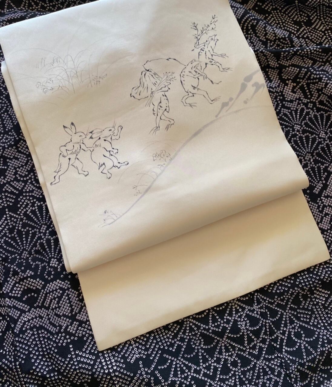 鳥獣戯画 塩瀬の染め帯 白