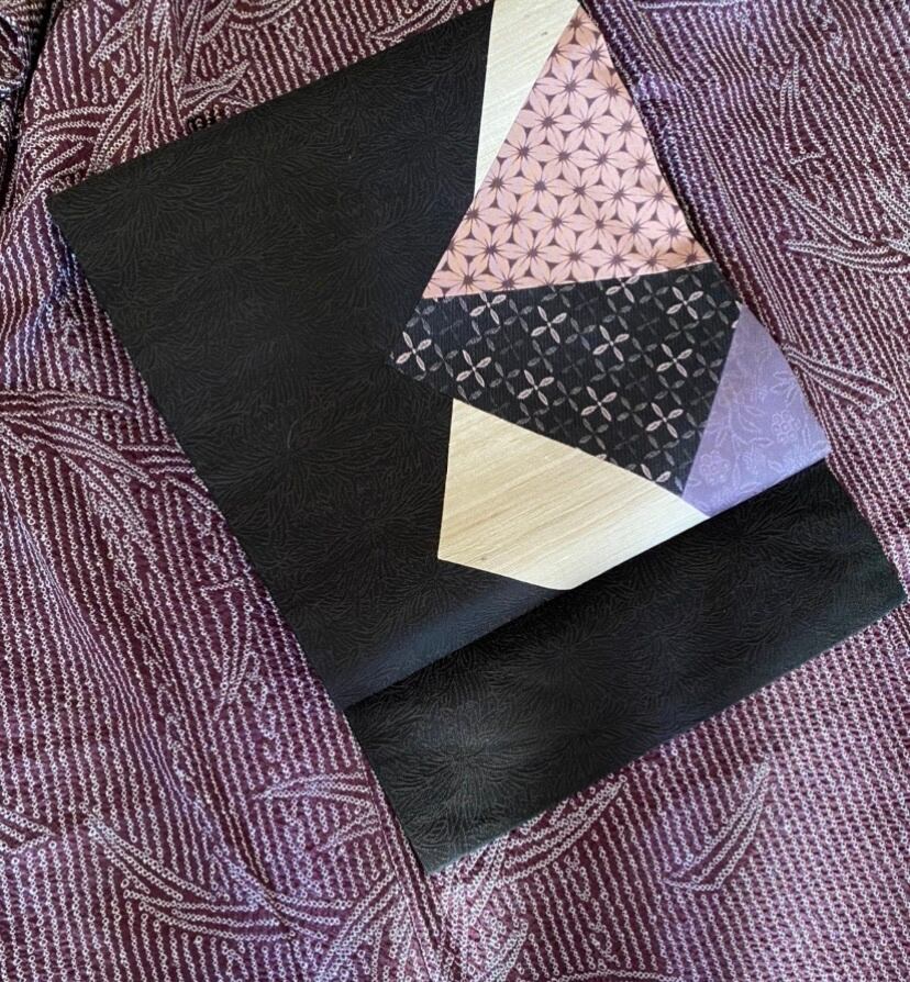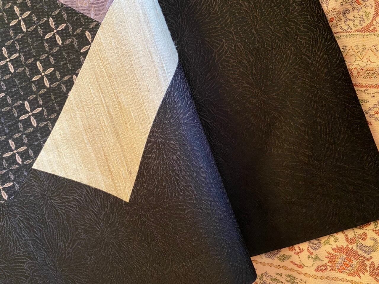 きりばめ=パッチワークでムガシルクのようなベージュ、藤色、黒に十字の花、桜を思わせるピンクの布