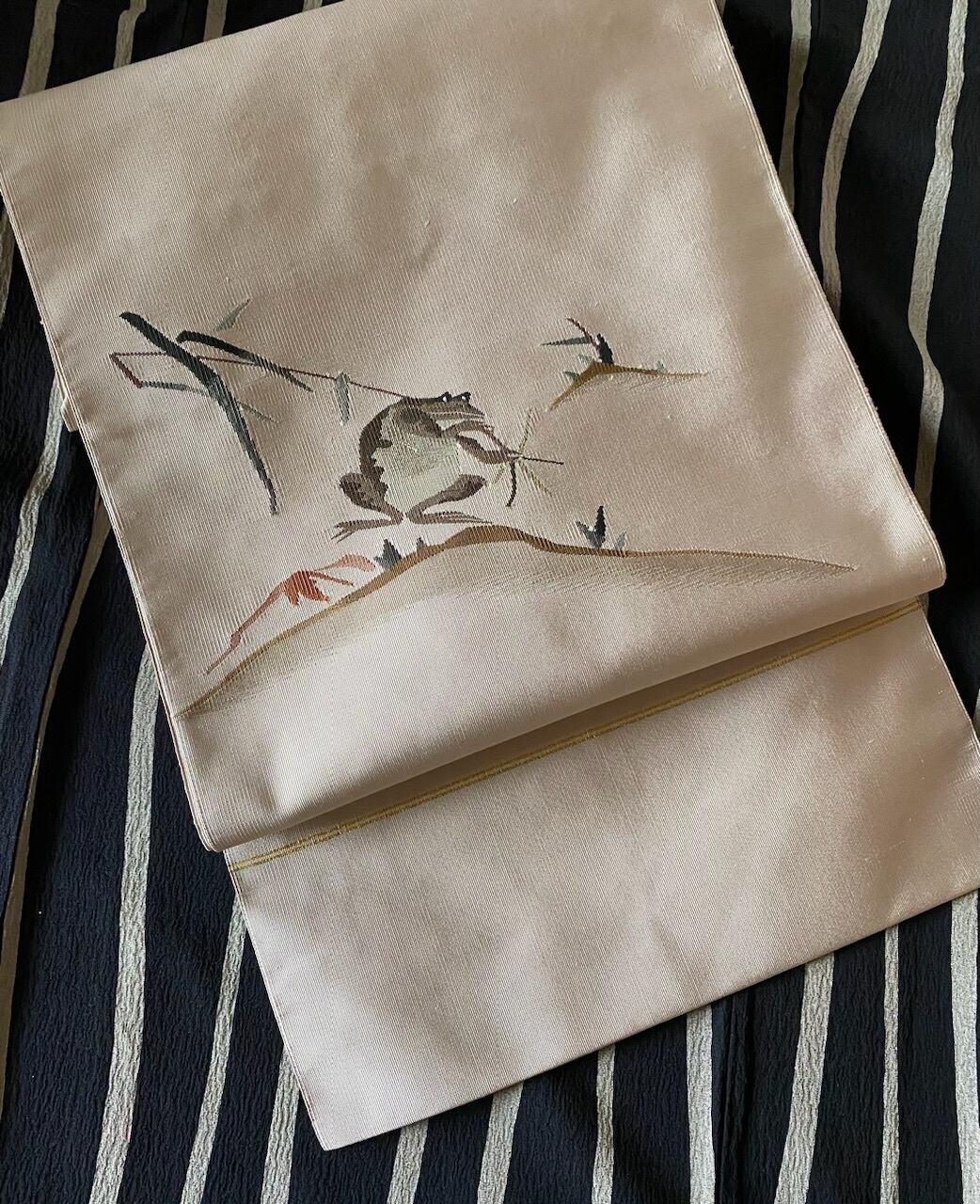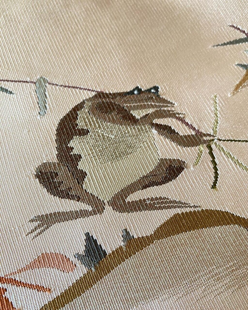 生成り色の地色にシックな緑茶のカエル、前柄にもかえるいます。