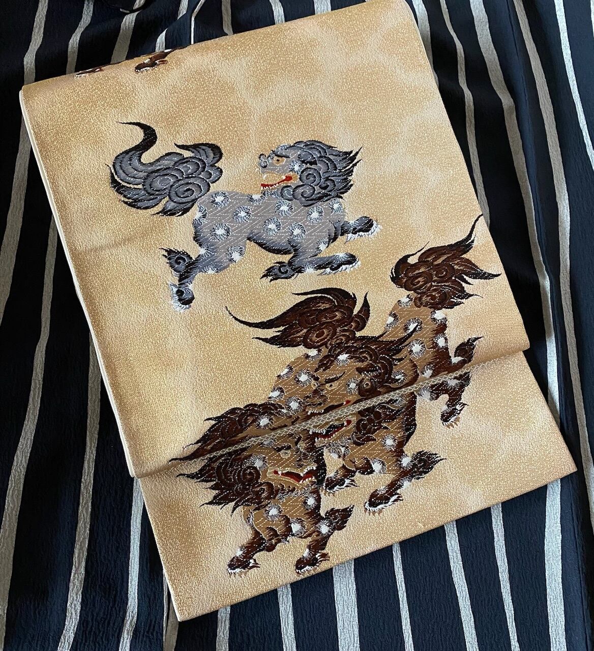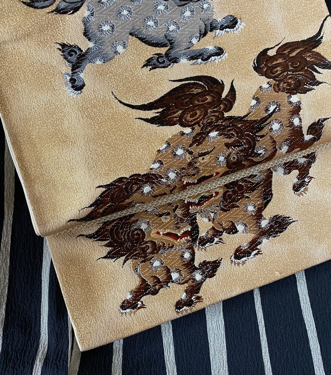 唐獅子のお顔もかあいらしさも感じさせる風情ある帯です。
