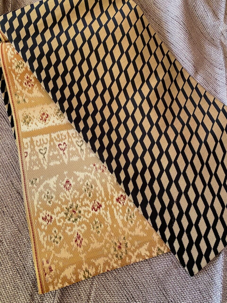 やわらかいクリーム色に正倉院紋様のようなイカット 絣にもう片面は黒✖️ベージュの網目のようなモダンな紋様のステキな帯です。
