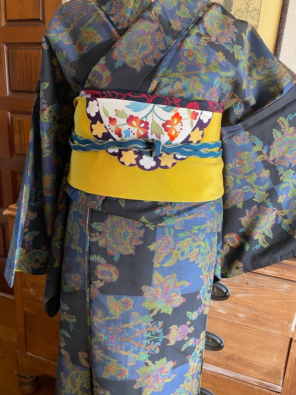 大きな黒✖️青の市松に更紗紋様が織られている