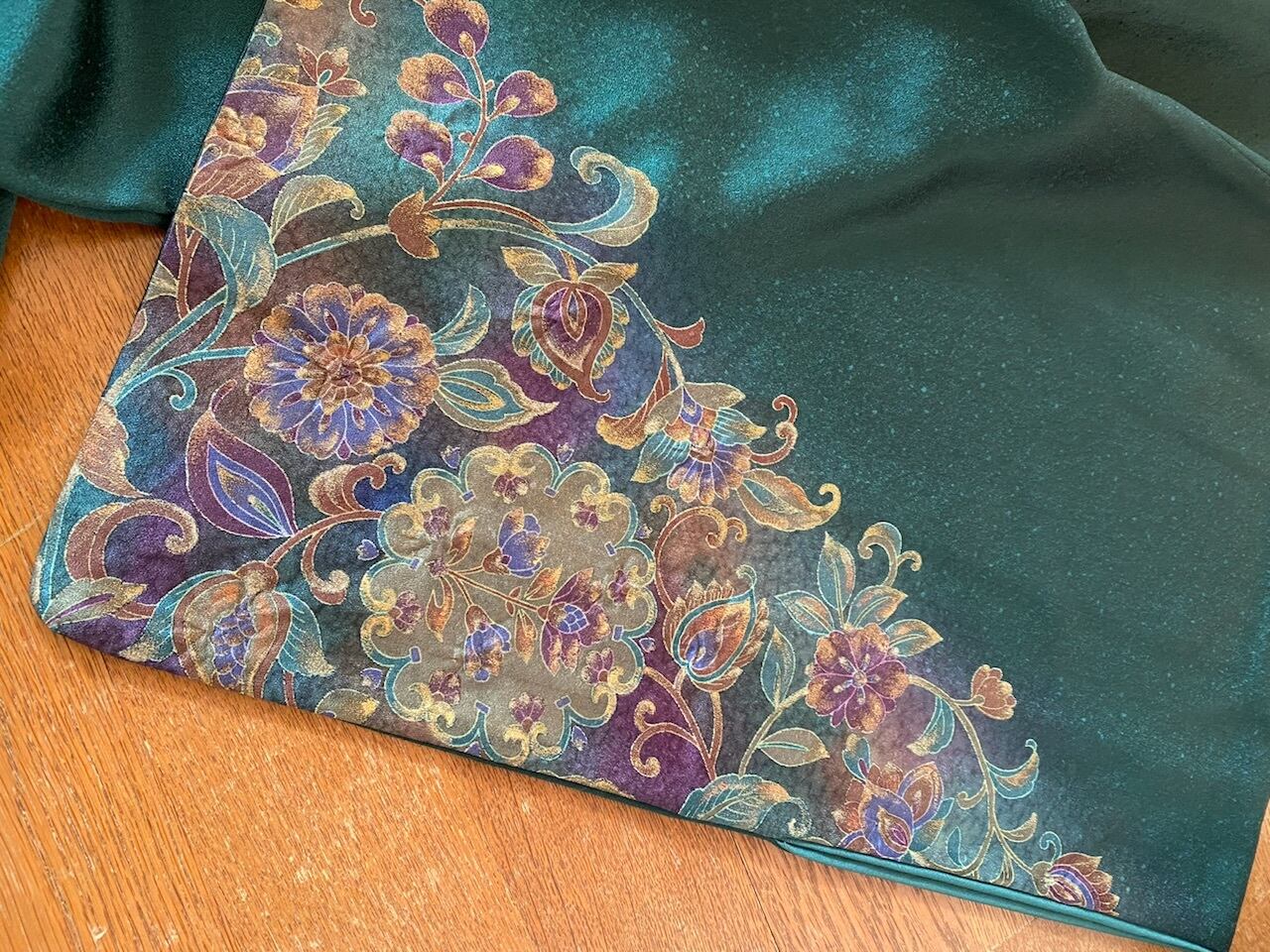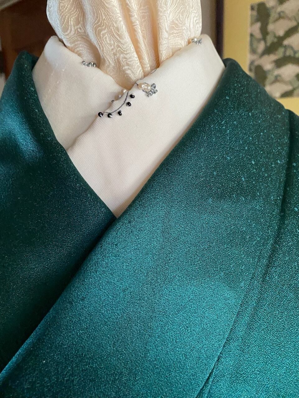 深く濃いエメラルドグリーン、梨地、綸子の付け下げ。