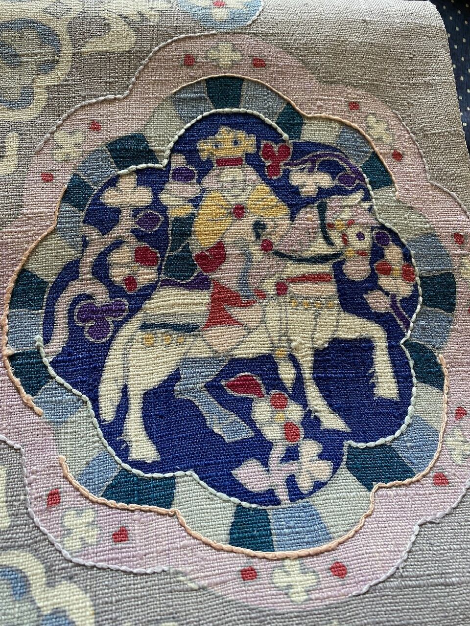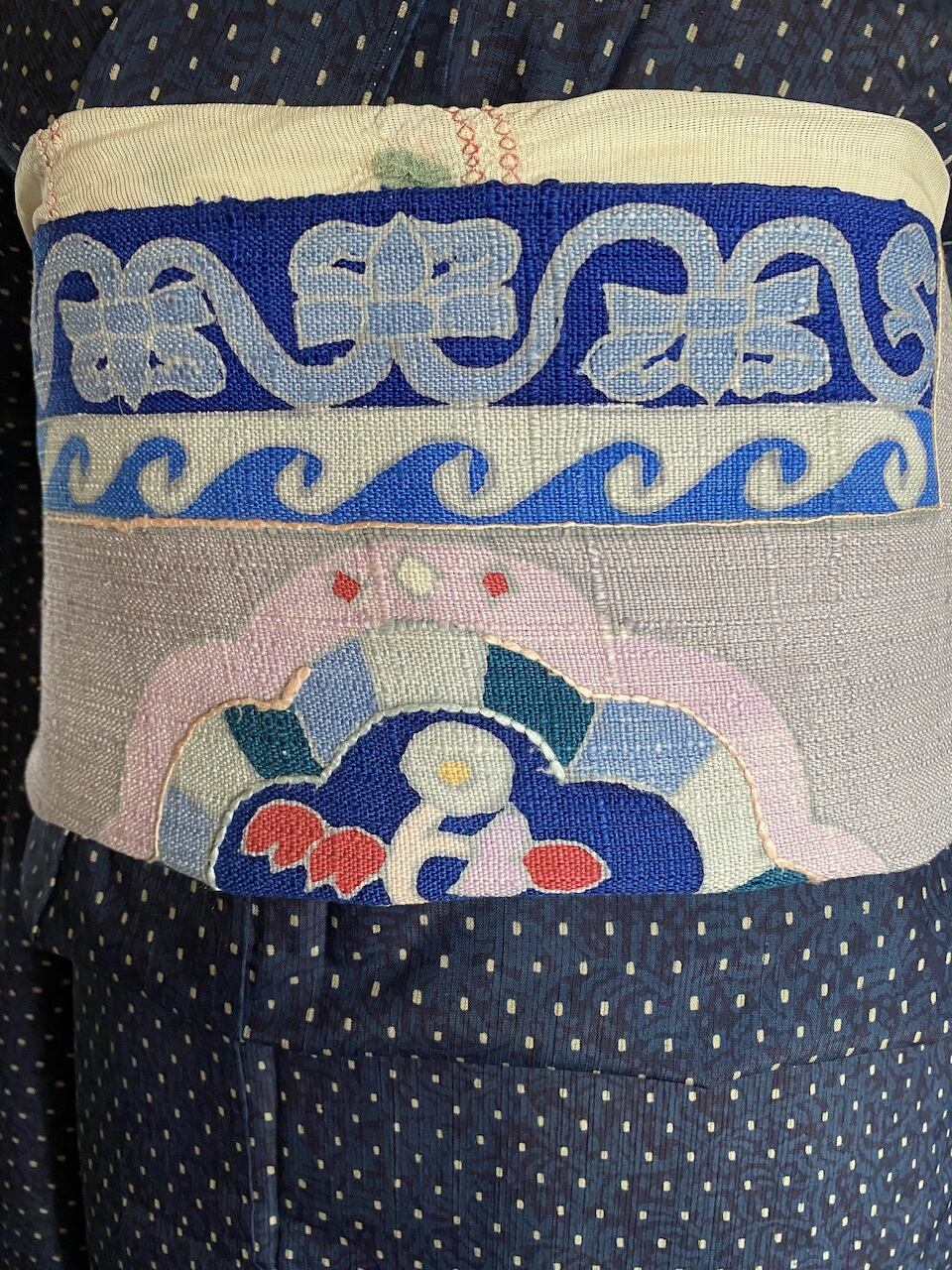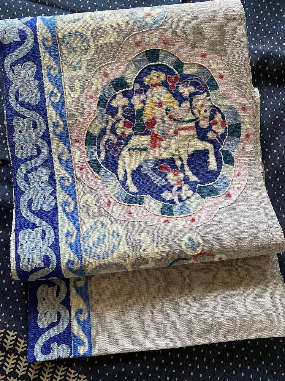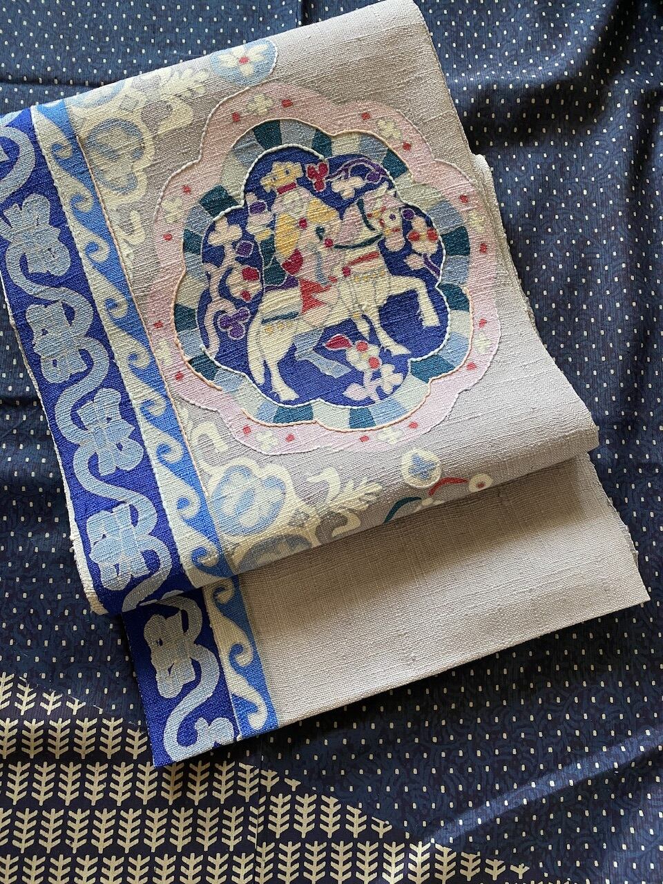 染め 紬 名古屋帯 王さまと馬 グレー水色