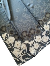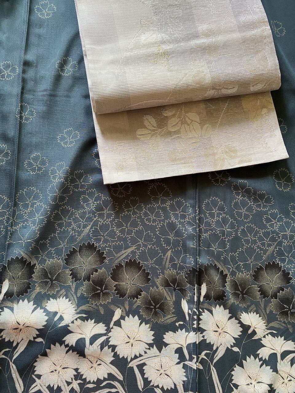 美しい付け下げ、ニュアンスあるブルーグレー色、グレートーンの撫子 なでしこ の花がモダンな印象。