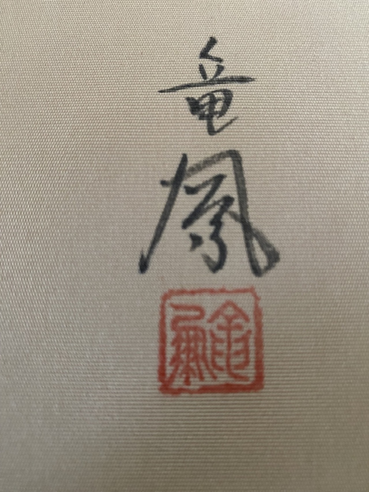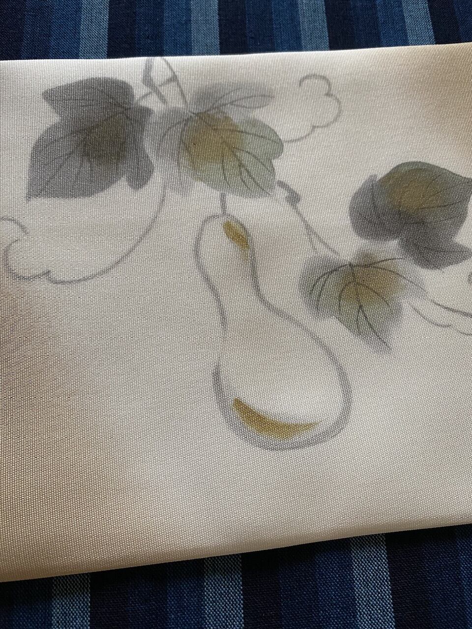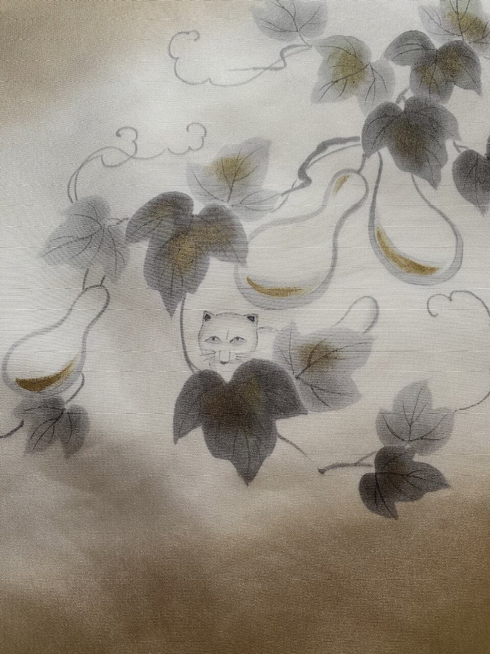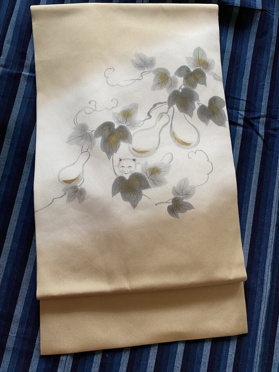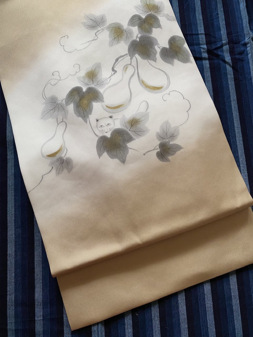 塩瀬の美しい白に茶ベージュのグラデーション染め色に風情があり、手描きの瓢箪、葉っぱ、たぬき が素晴らしい帯です。