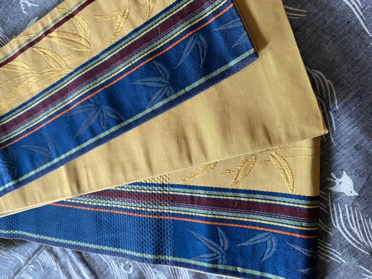 博多織り 半幅帯 黄色✖️青 笹紋様
