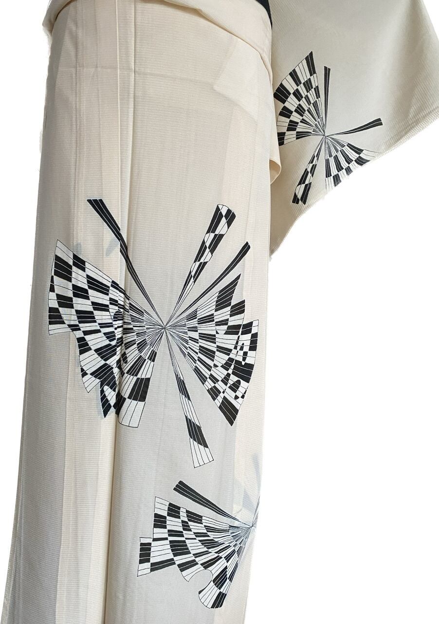 絽 付け下げ 生成り系 黒蝶々アールデコ調