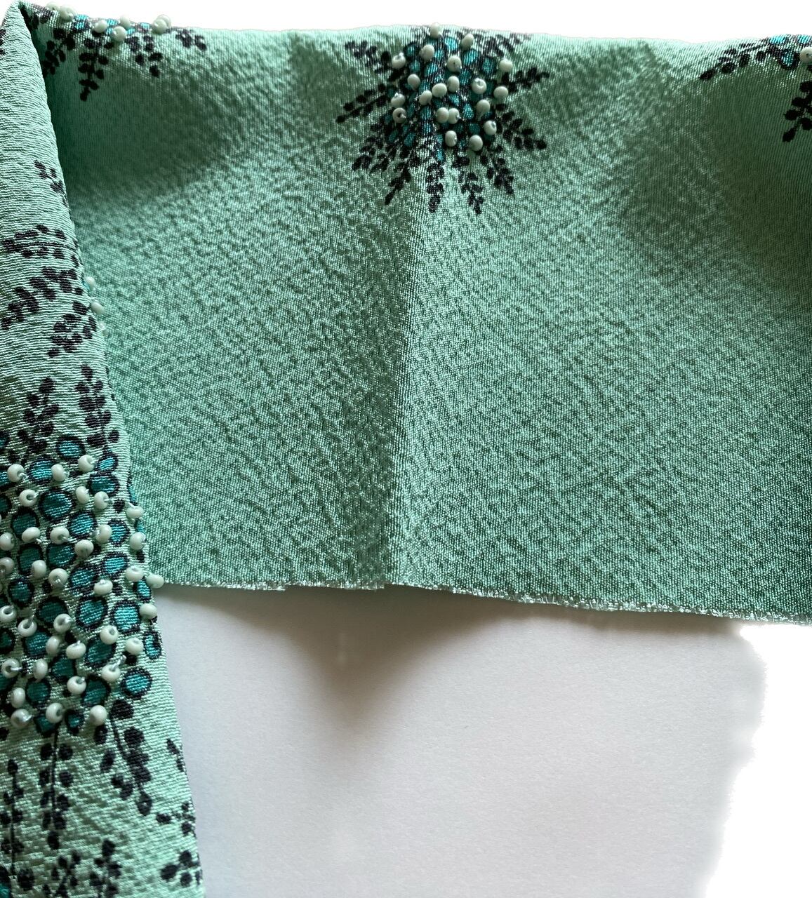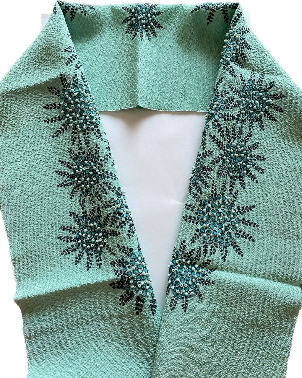 縮緬の絹地を染め、ビーズ刺繍、手描きをしています。