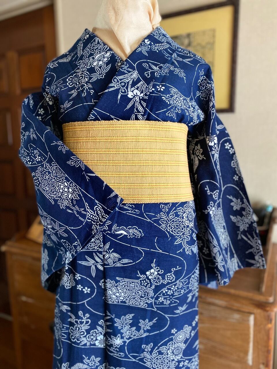 綿絽 綿紅梅 浴衣 藍色白 花々