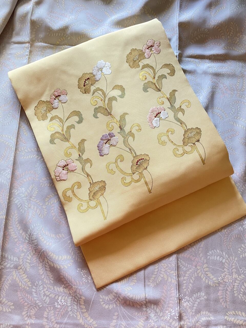 塩瀬の染め、刺繍 名古屋帯 花更紗