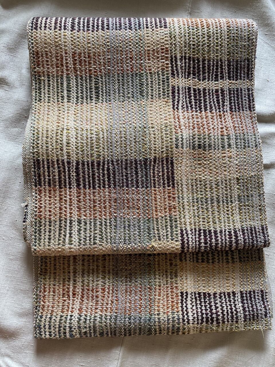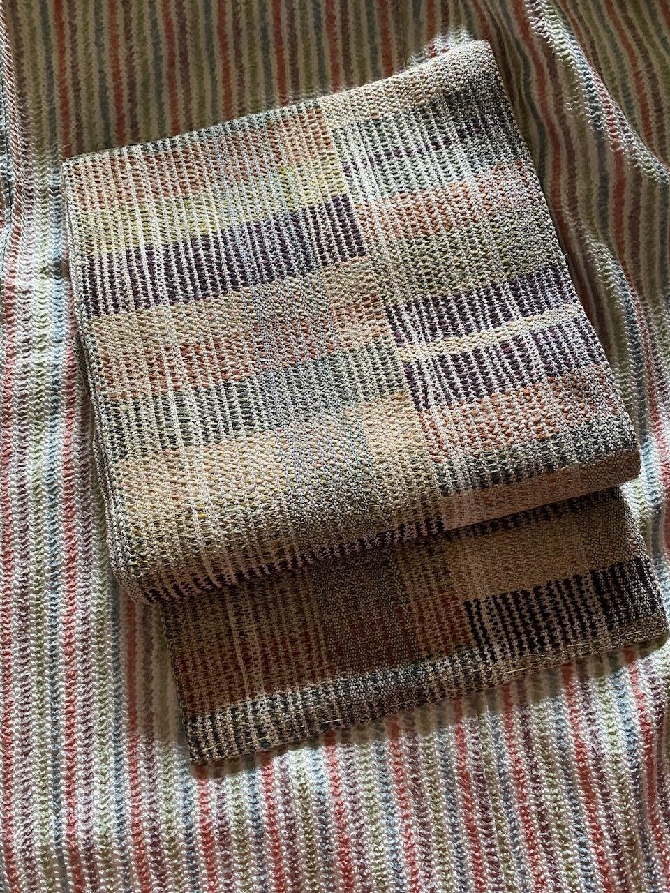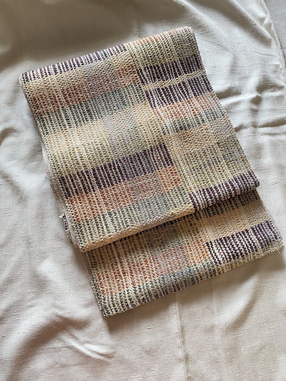 織りの帯 格子 ベージュ、ピンク、茶、緑