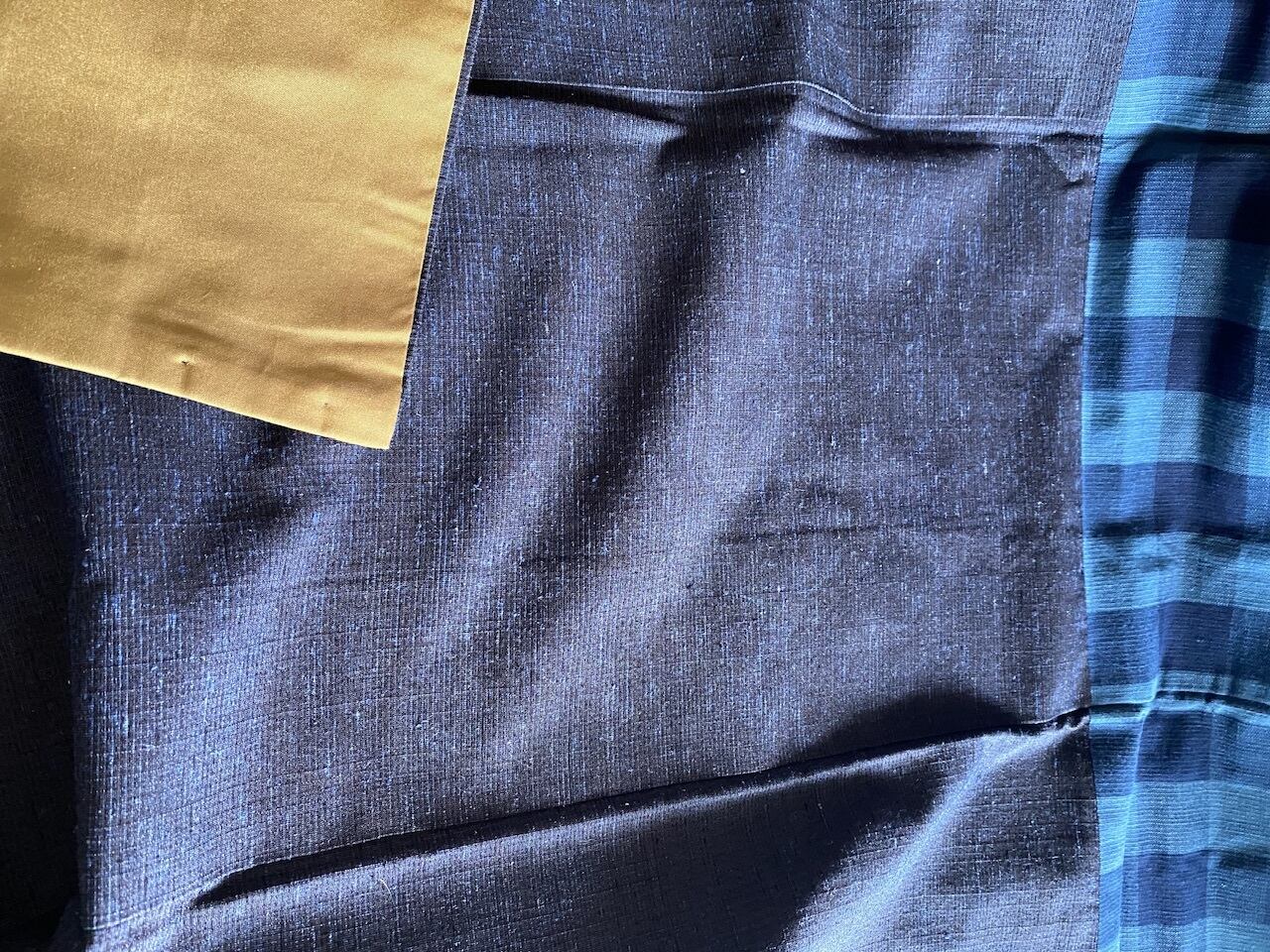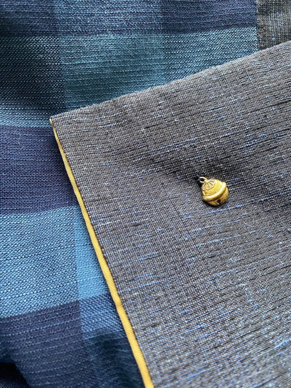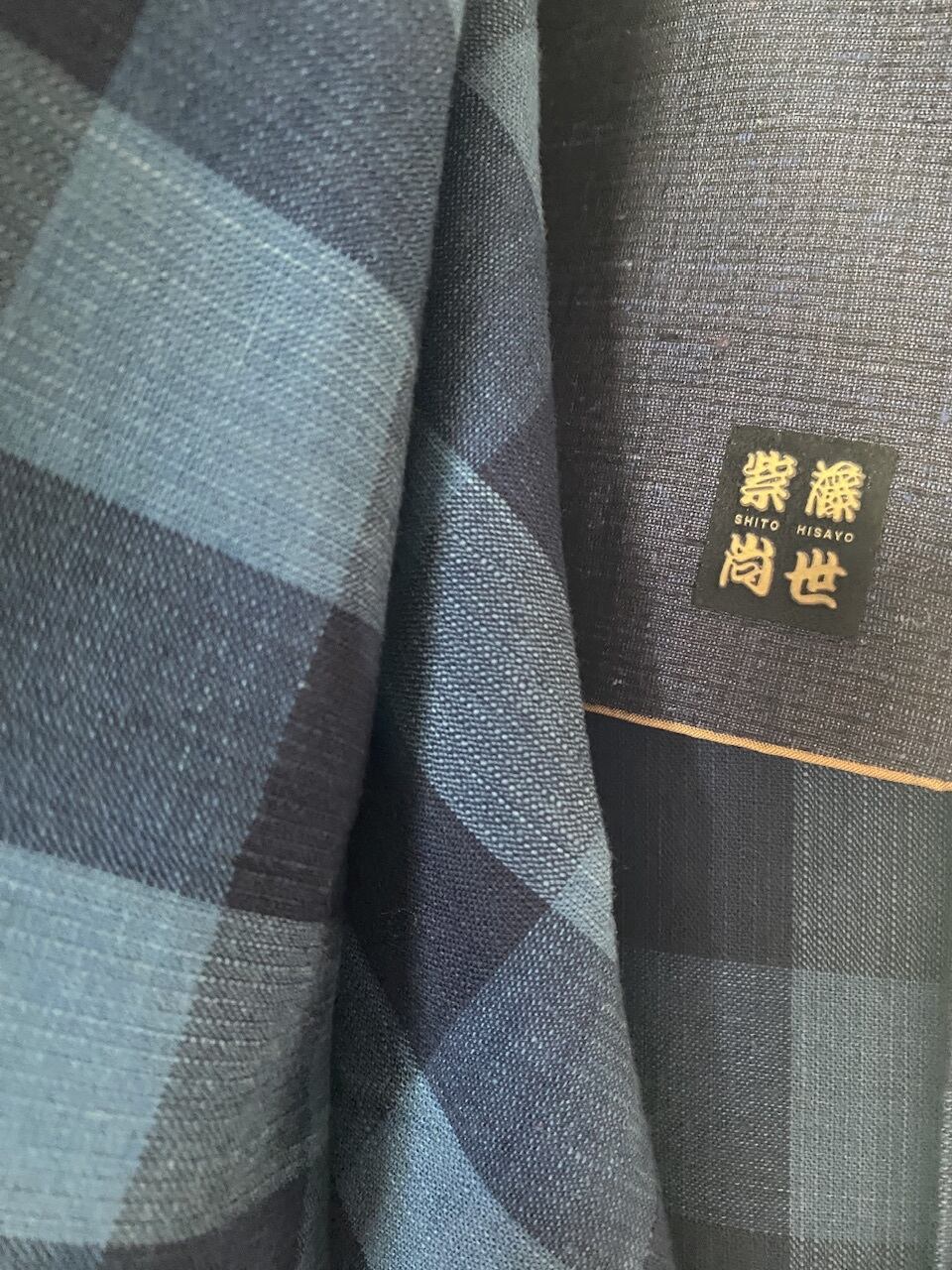 藍色無地と市松の2反の反物を使用して仕立てられたこだわりの逸品。