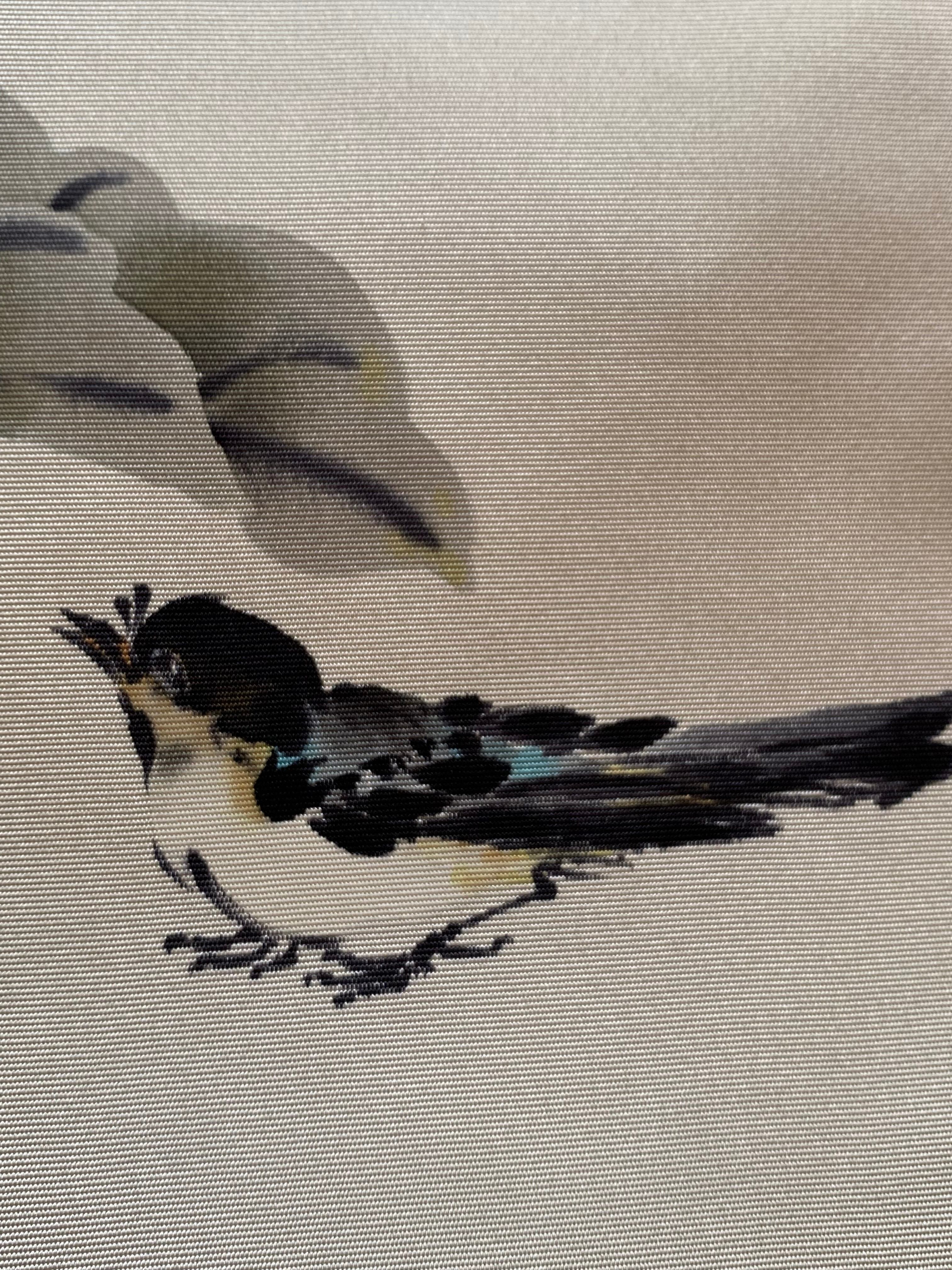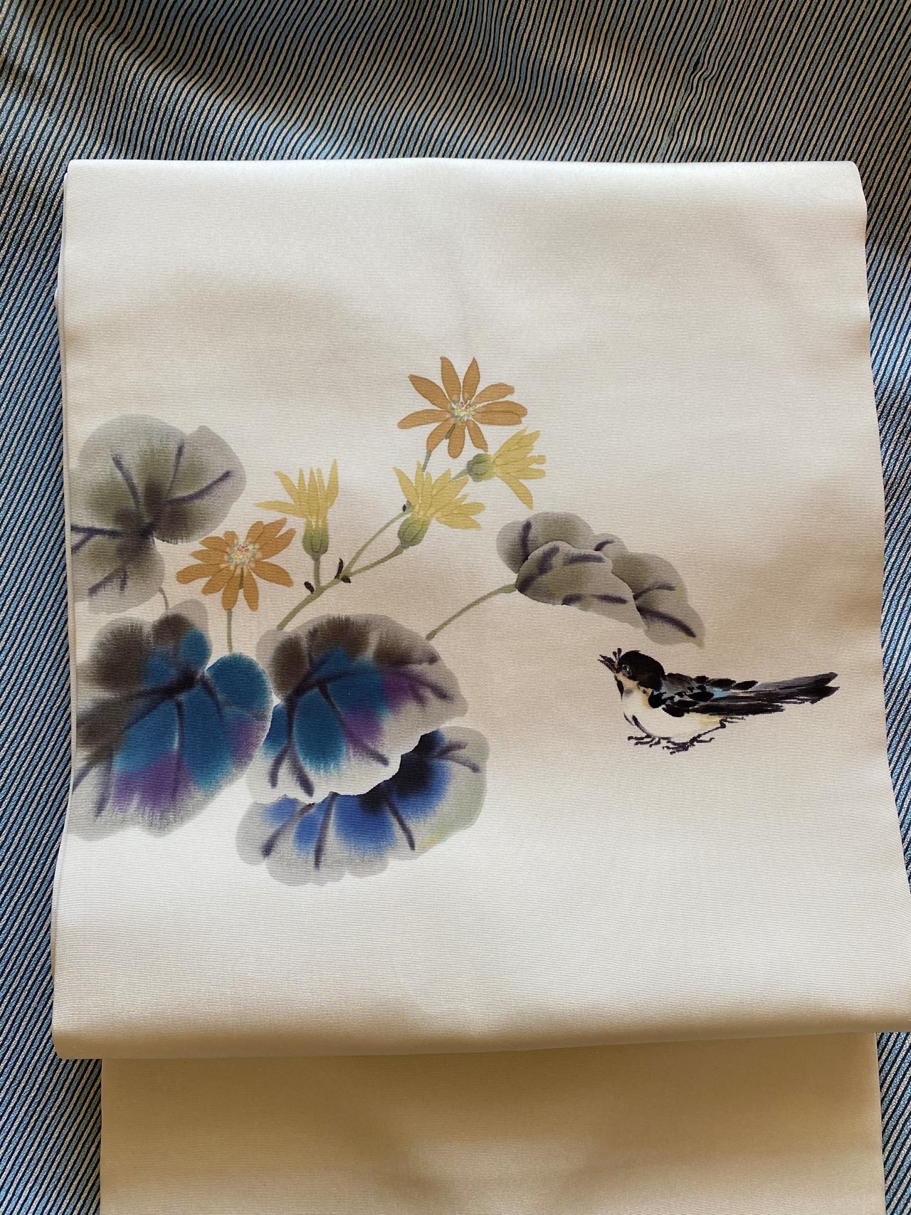 塩瀬の染め帯 ツハブキ、カササギ 二代目清次郎