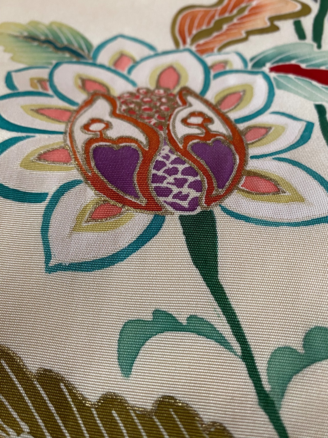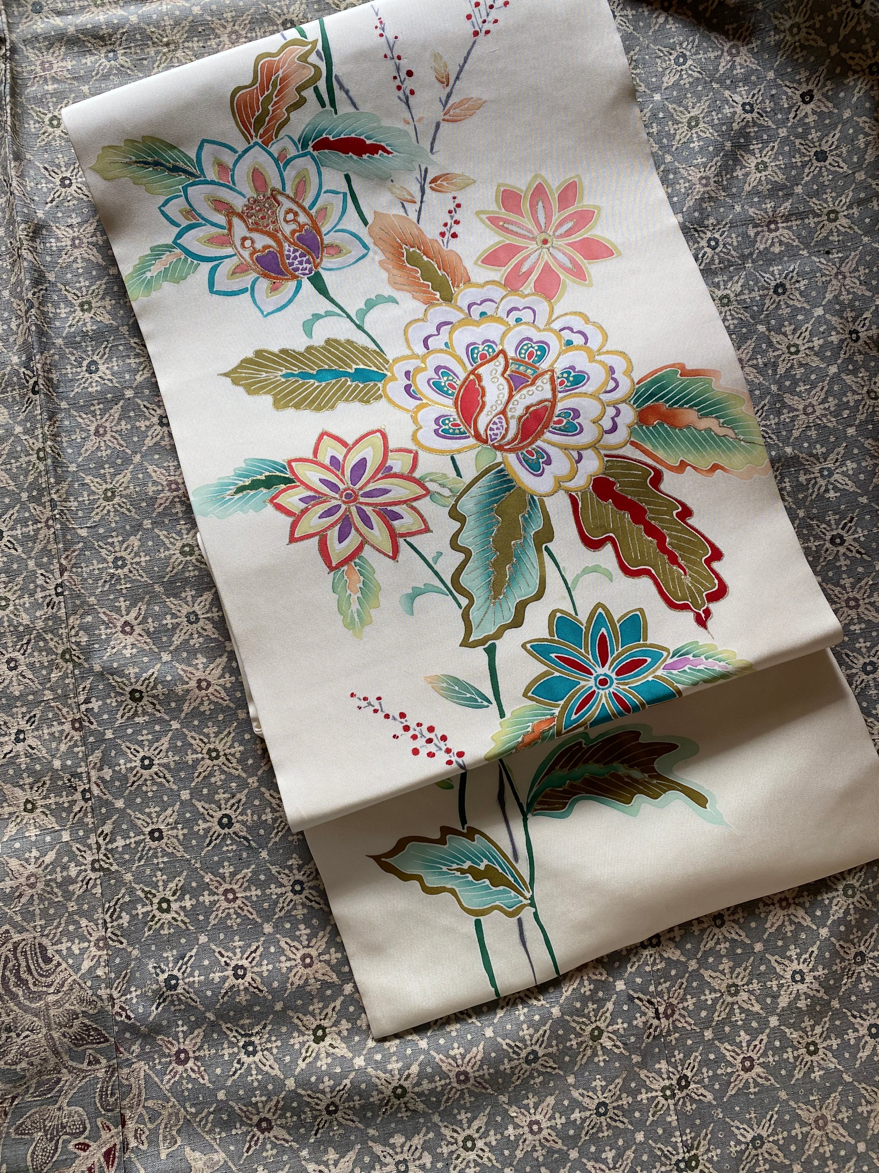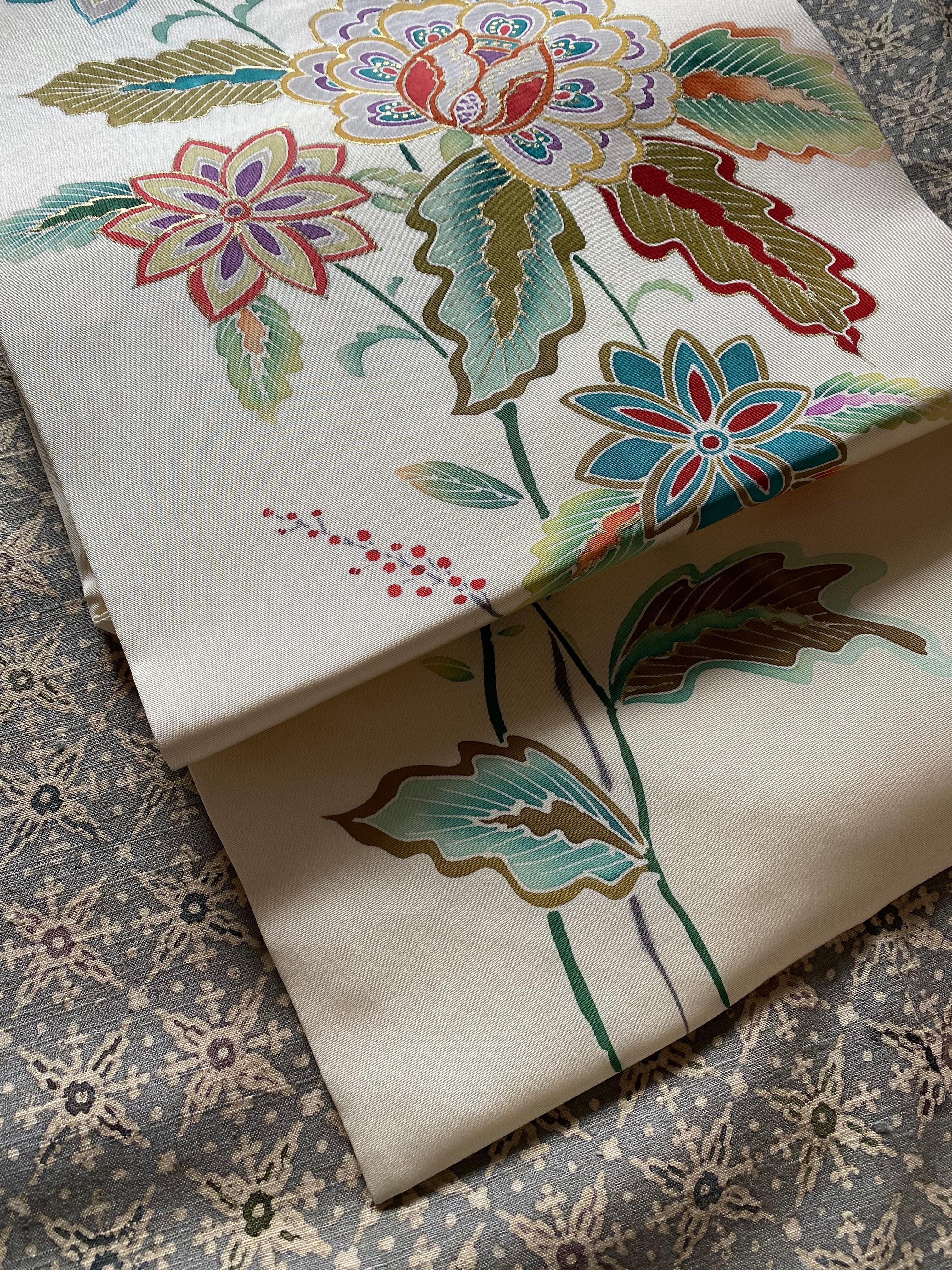 塩瀬の染め名古屋帯 更紗 玉子色地 花々大