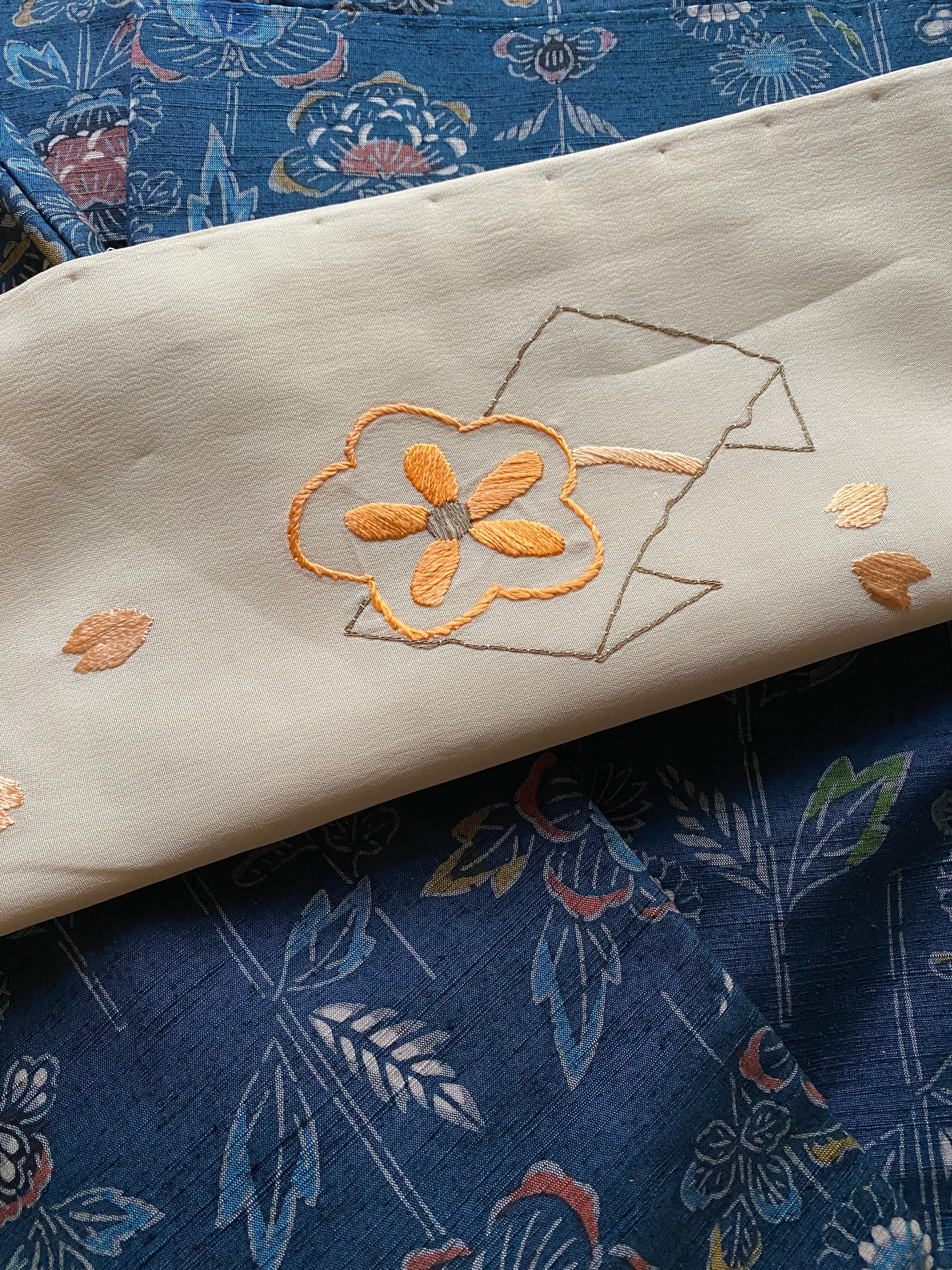 アンティーク 昼夜帯 白青格子、梅文刺繍