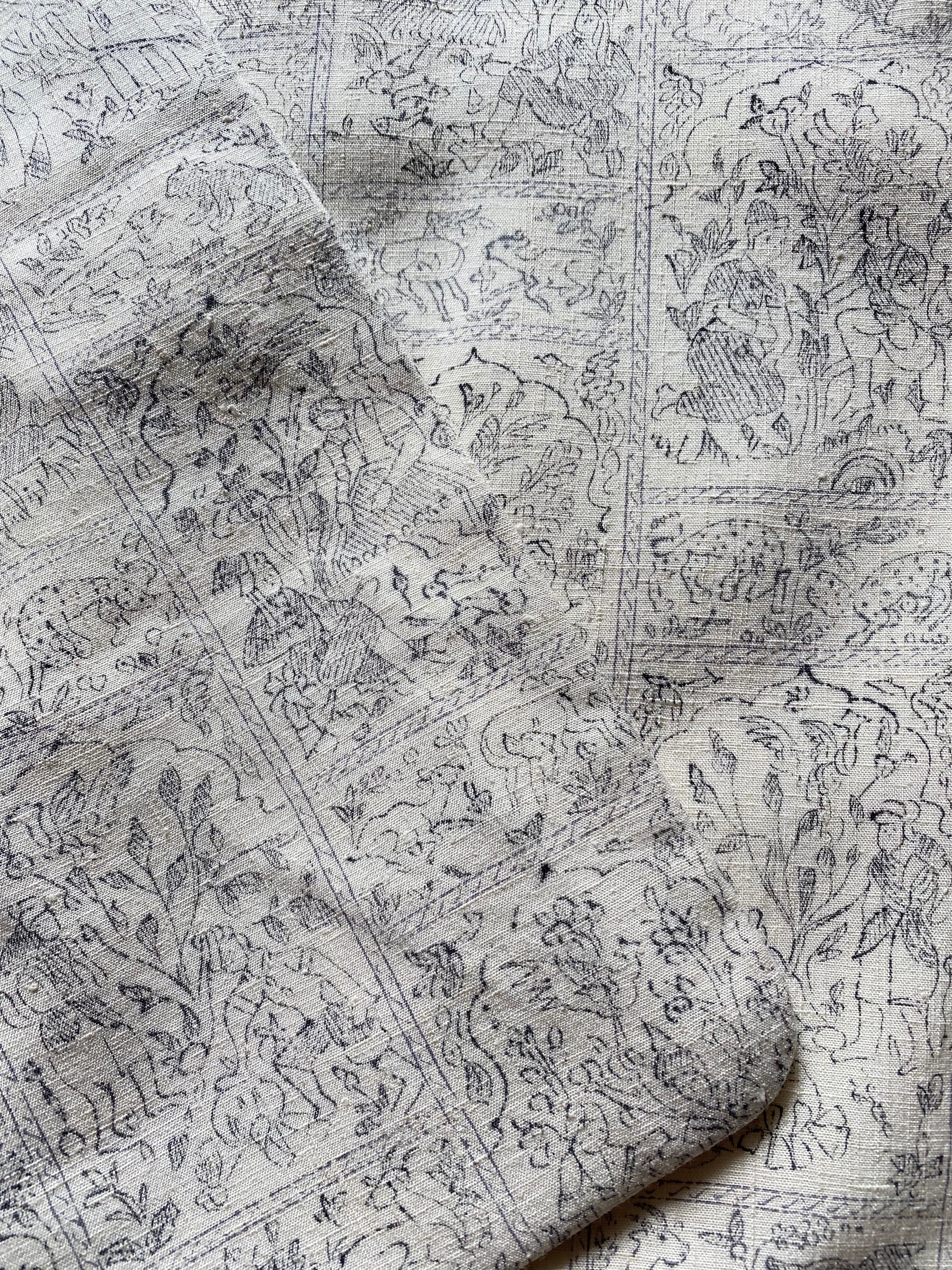 手描き 紬 生成り インドの宮廷狩猟紋様