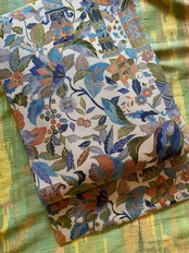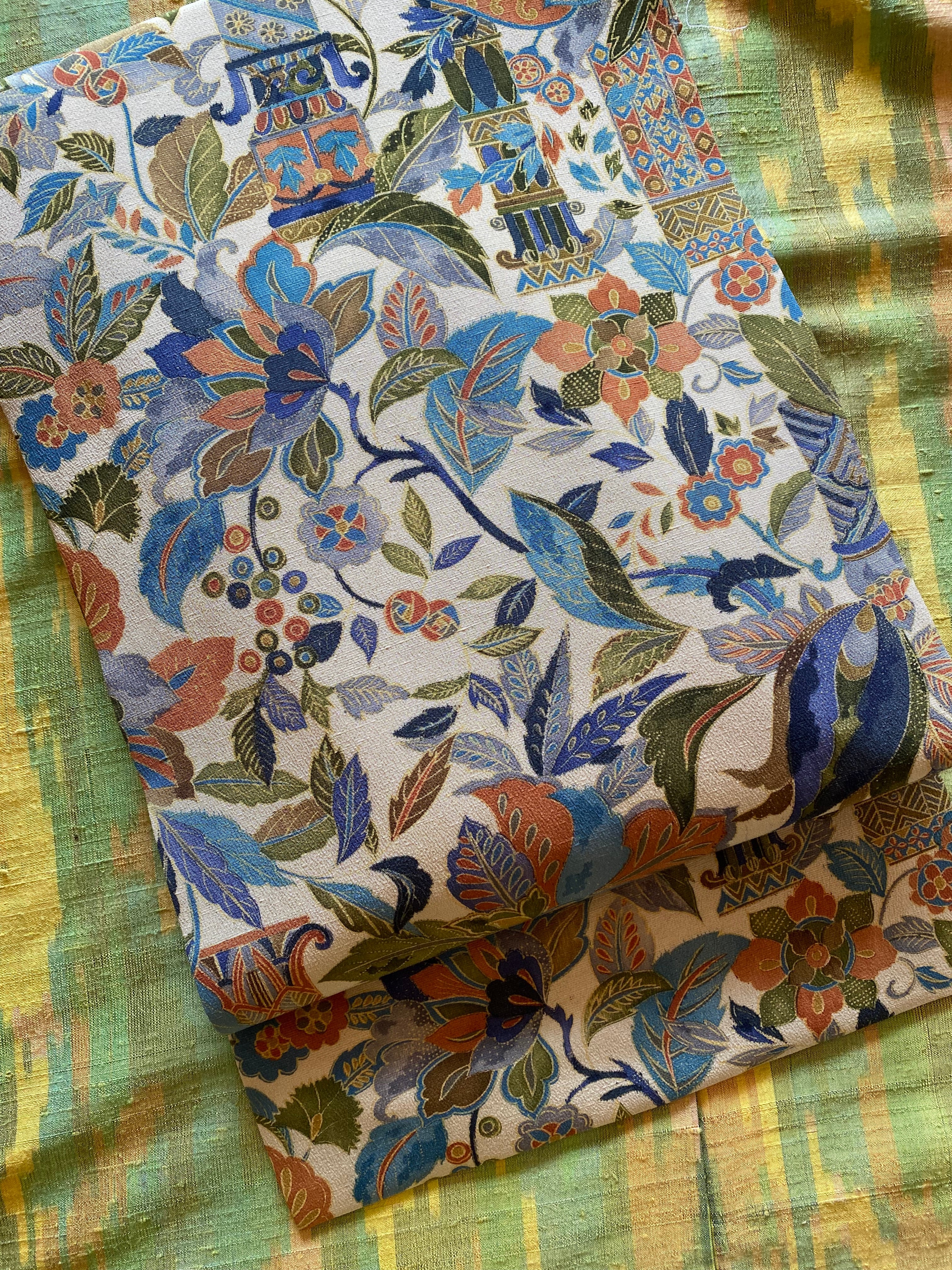 更紗 紋様 染め紬 名古屋帯 ベージュ青橙水色