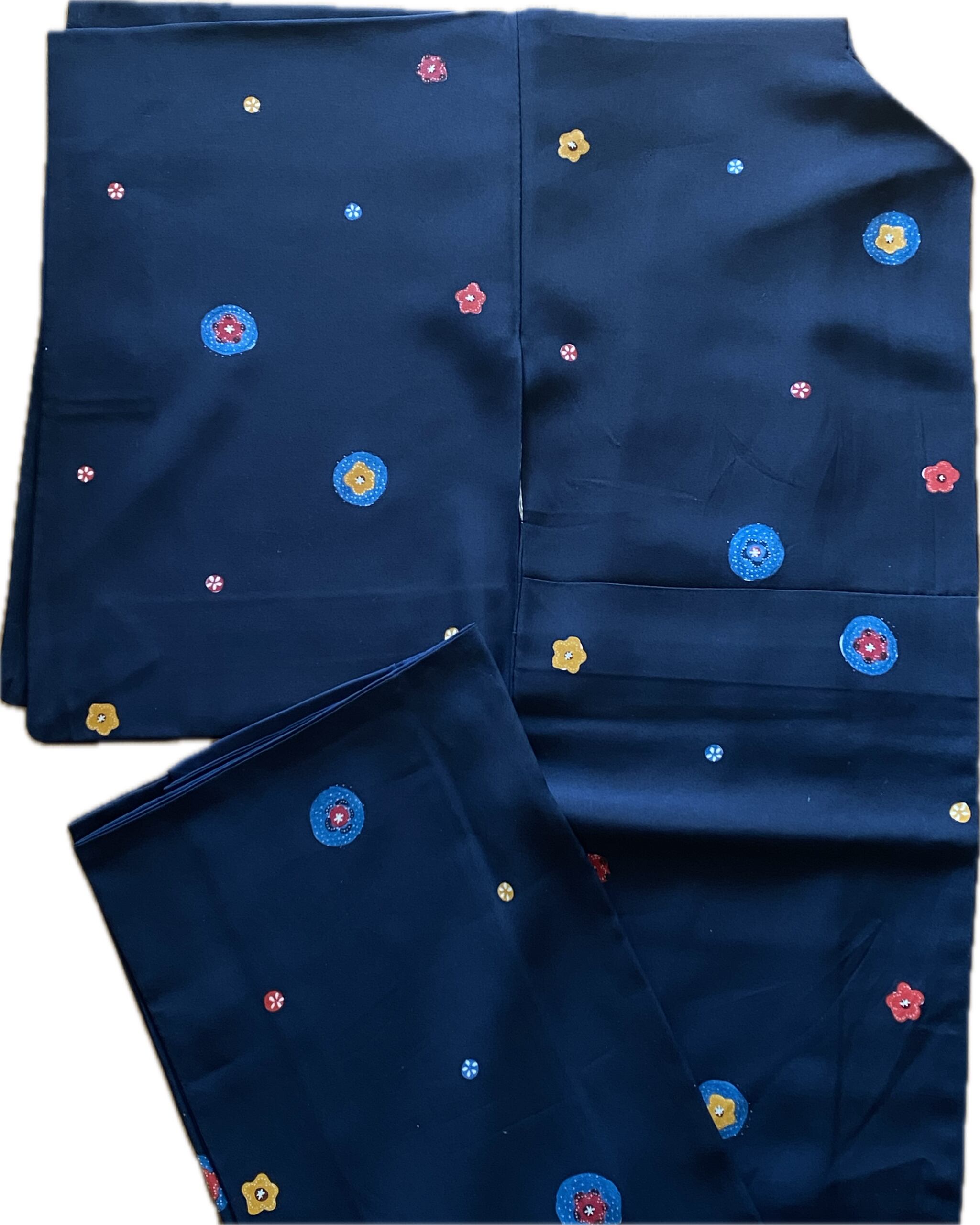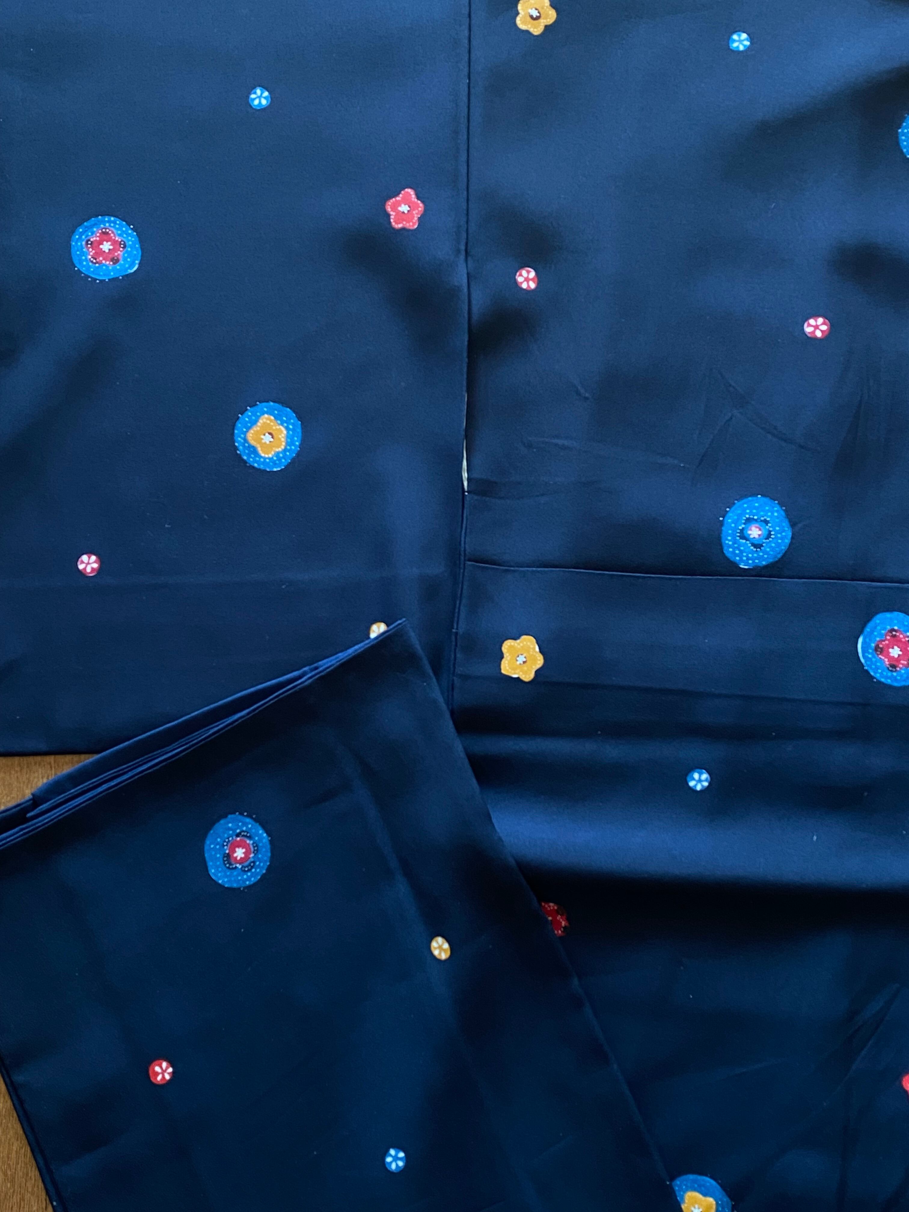 藍染めの濃紺の地色に青、黄色、水色、紅の丸紋様の小花が本当によいお色味です。