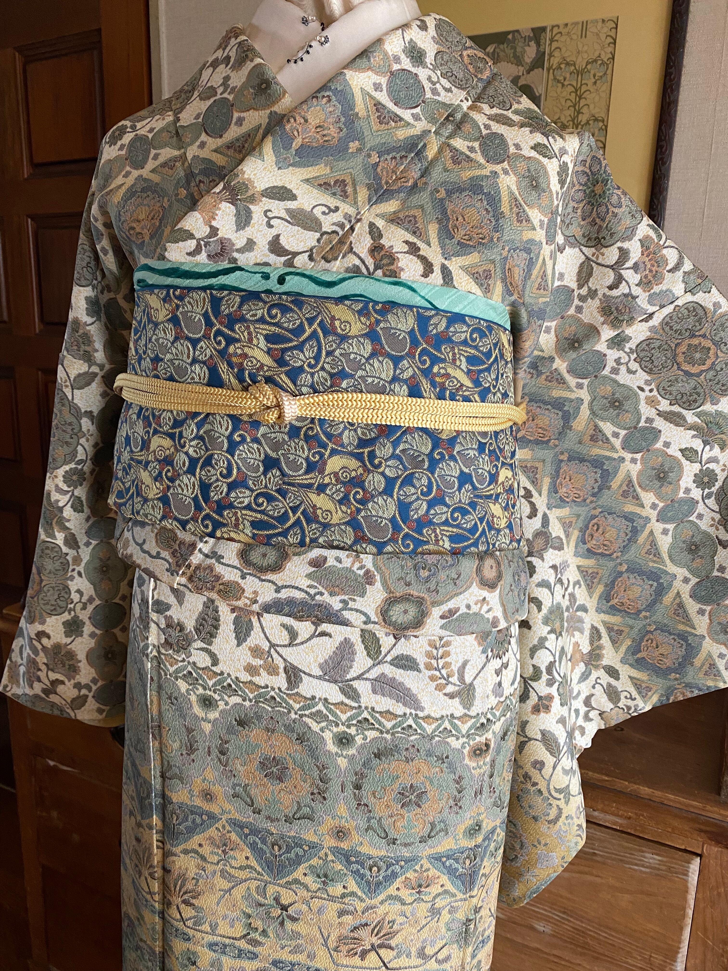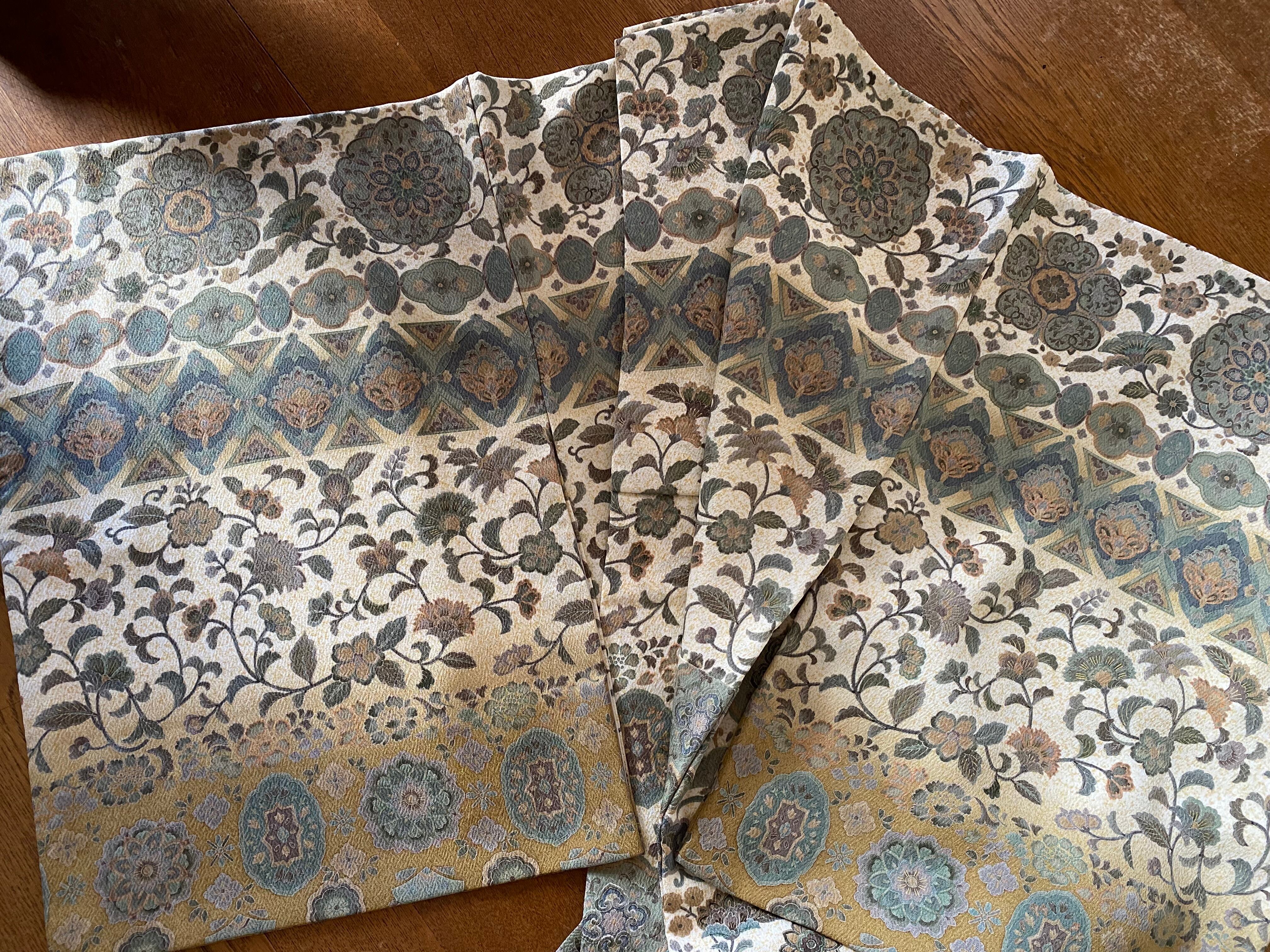 紋様はモスグリーンにシックな赤紫がほんのり入っています。