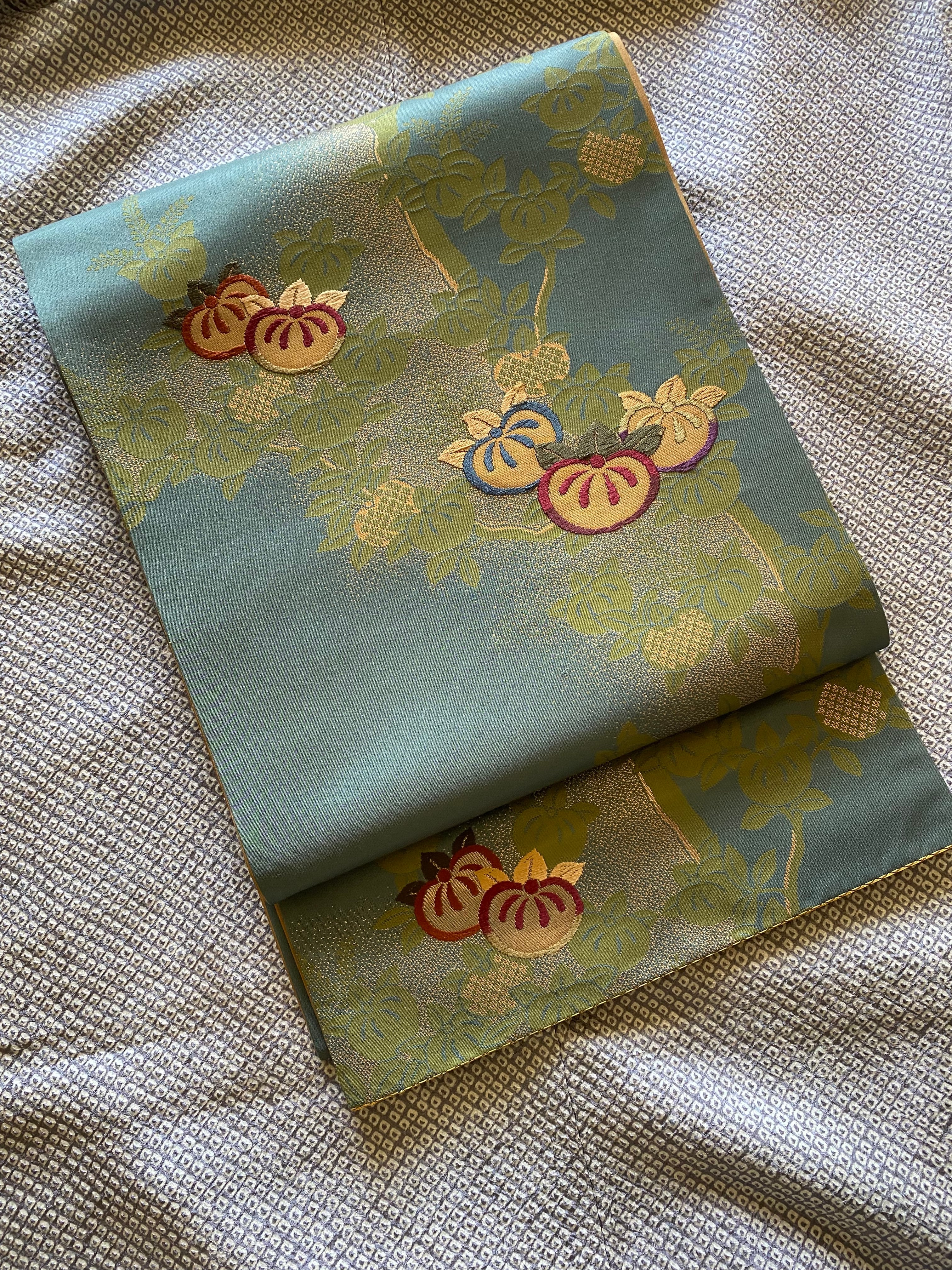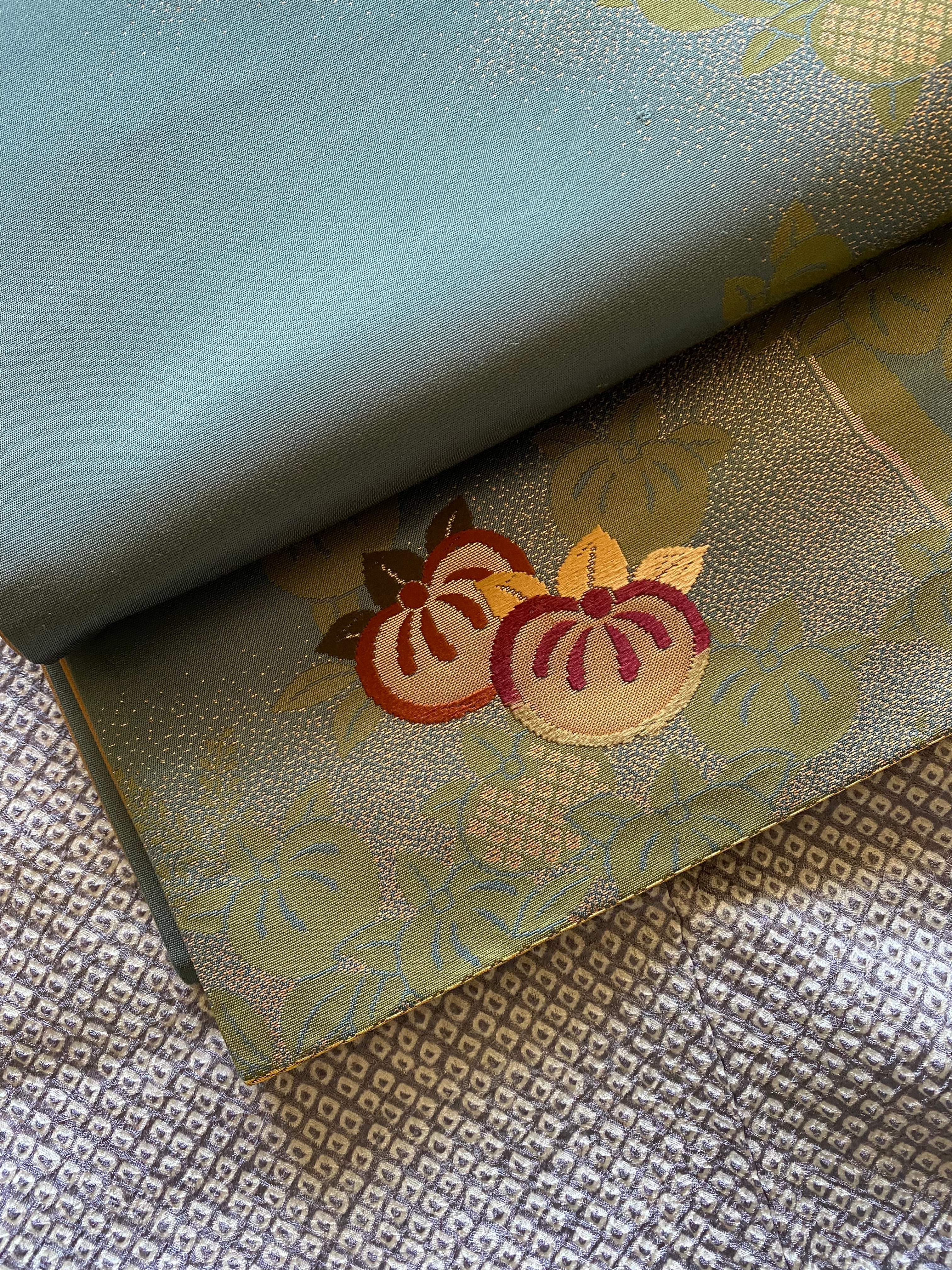 橘 たちばな 紋様 ブルーグレー金 織り袋帯