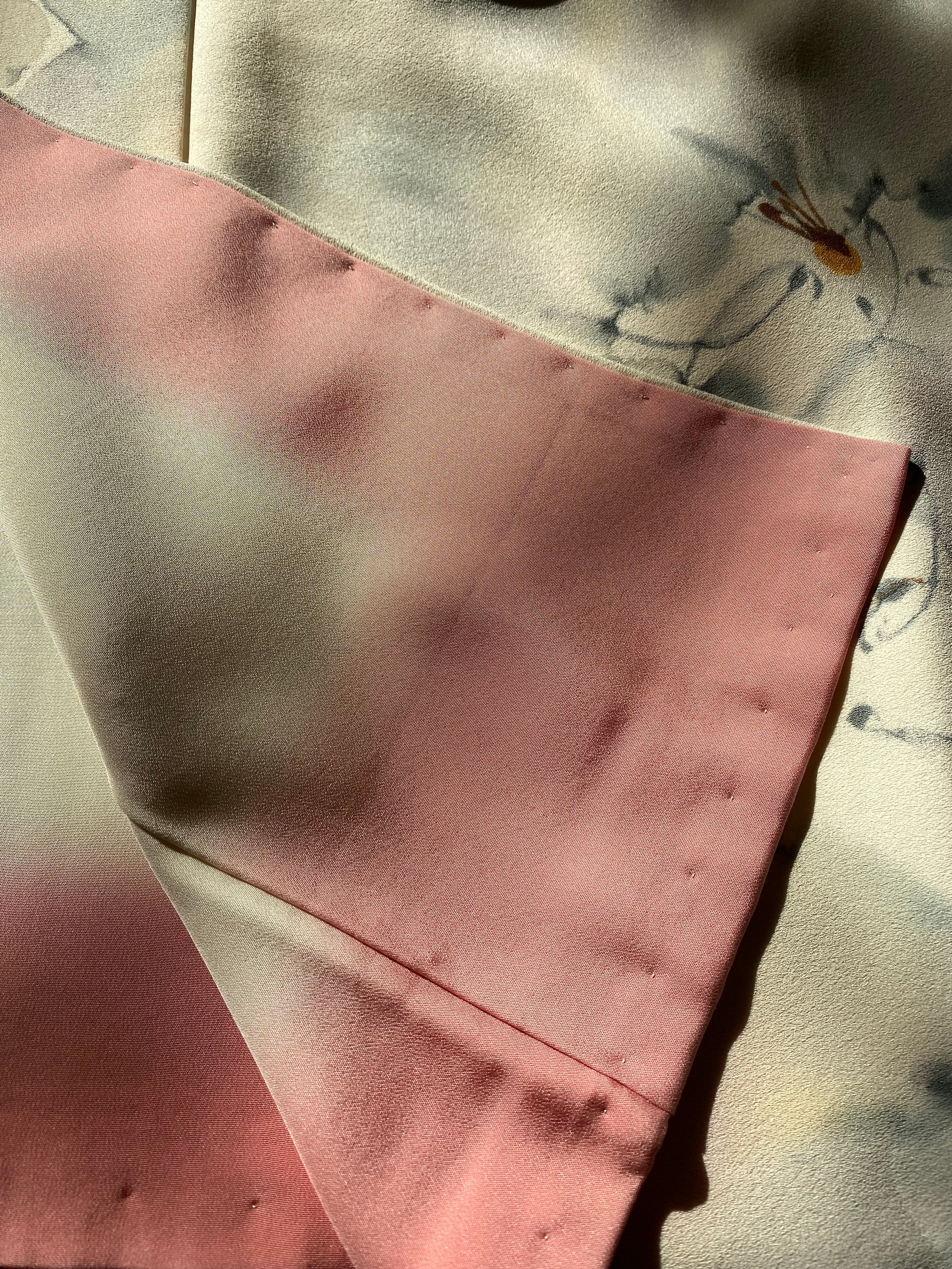 グレーほんのりピンク、黄色のぼかしが奥行きある雰囲気あるおキモノです。