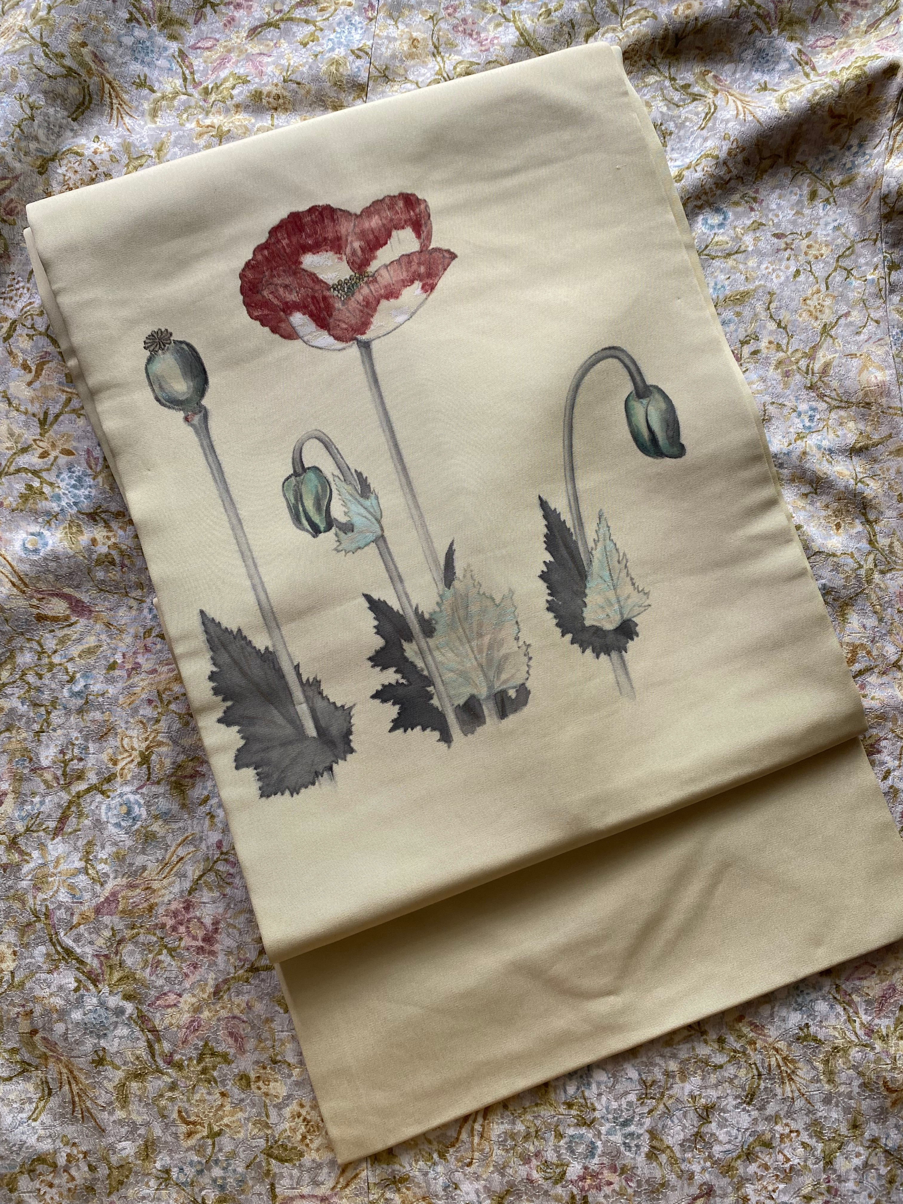 塩瀬の染め帯 クリーム色 芥子 ポピーの花