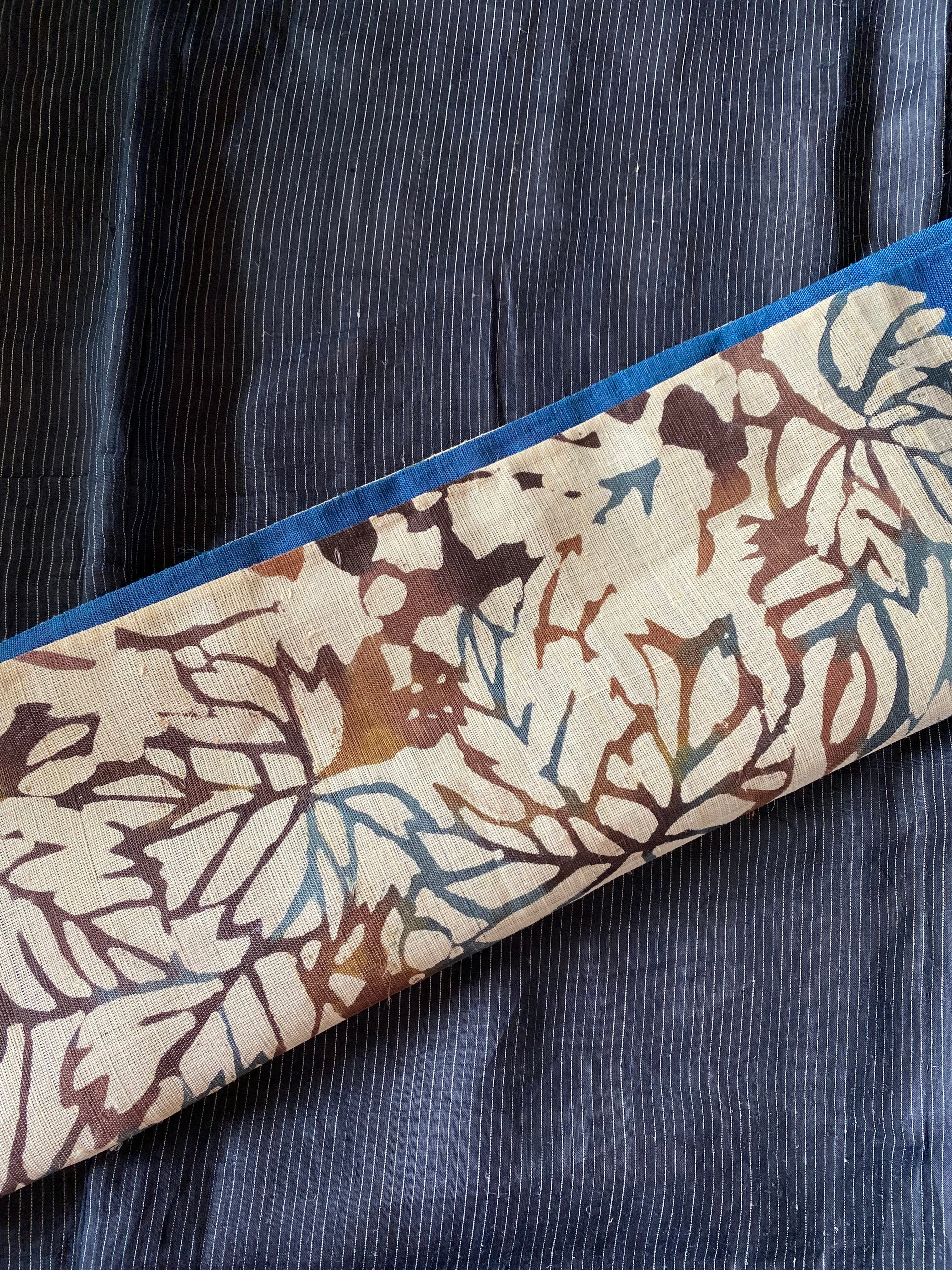 染め麻 夏 青茶 葉っぱ紋様 袋帯